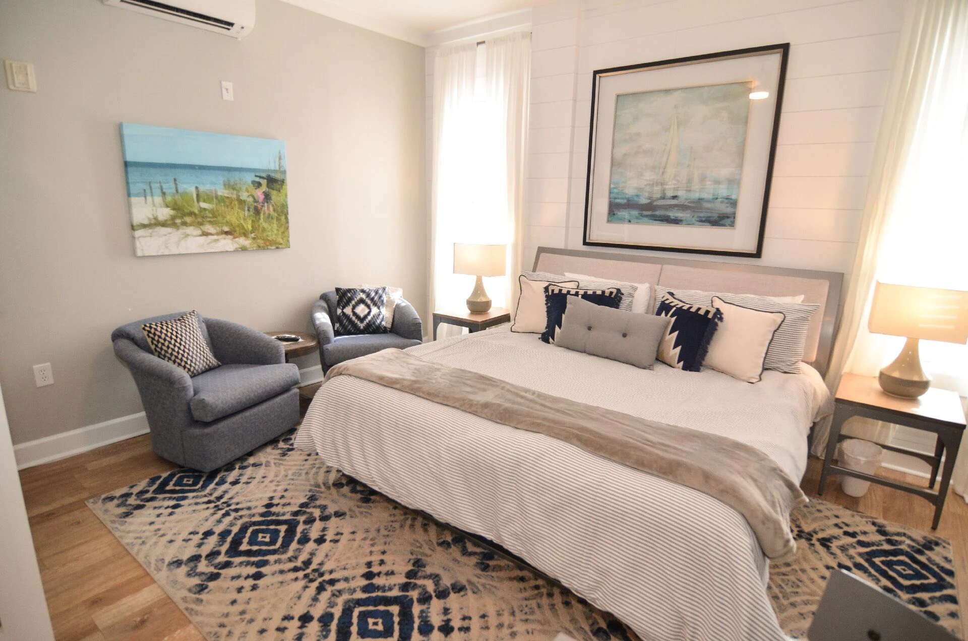 This property is located just behind Pizza By The Sea at the Village area in Rosemary. It's a 3-5 minute walk to the private beach. The property is updated & the perfect space for 2-4 people. While there is no oven, there's a hot plate, toaster oven & pots and pans so we were able to make biscuits and eggs for breakfast. The full-size fridge allowed us to store all of the food we needed during our stay. The owners thought of everything you need-they had 2 beach chairs, beach umbrellas. The king-size bed was very comfortable and our son slept on the top bunk and we used the bottom bunk to store belongings. The bathroom had a beautiful shower and came with more towels than were specified on the listing. The kitchen also had a Keurig as well as a regular coffee maker. All appliances worked well and there was adequate lighting. The room was extremely humid, due to the FL weather. A dehumidifier would be great in the room as it was difficult to dry towels, but that would be a luxury. The only other suggestion we have is it would have been nice to have a few hooks just outside of the shower to hang towels. Other than those small suggestions, the place is beautifully decorated, well equipped with all of the things you need for a short stay and is conveniently located to the restaurants, shops, and beaches, We will be back!!! Loved it!