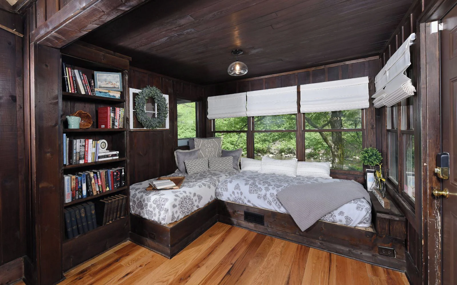 Inside, the living room is warm and inviting and features a stone (gas) fireplace, an antler chandelier, cozy furnishings, a big screen TV and DVD player, and a cushioned reading nook with a small library. Craving a bite to eat or something refreshing to drink? Head to the retro-chic kitchen that's fully equipped with everything you need to prep and serve meals throughout your stay in the Smokies. There's even a romantic dining space with a table for 2. It also has a new induction stove!