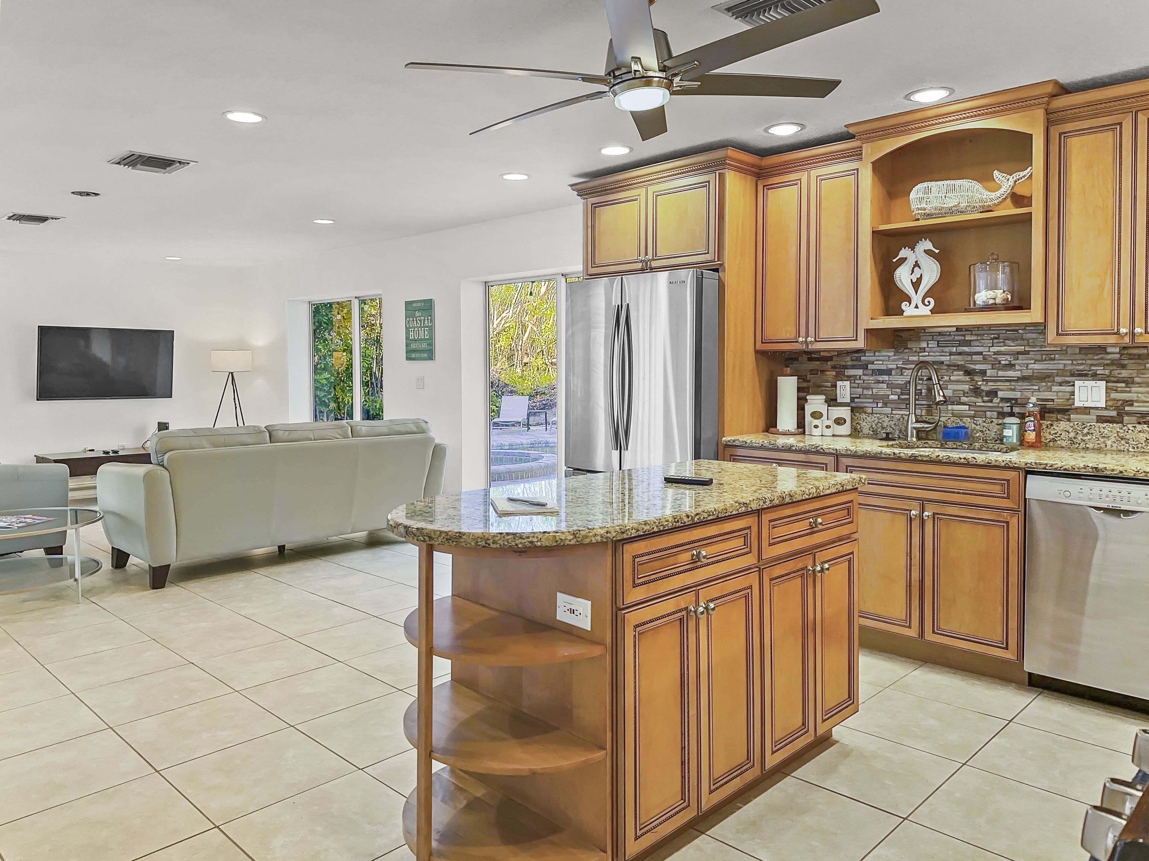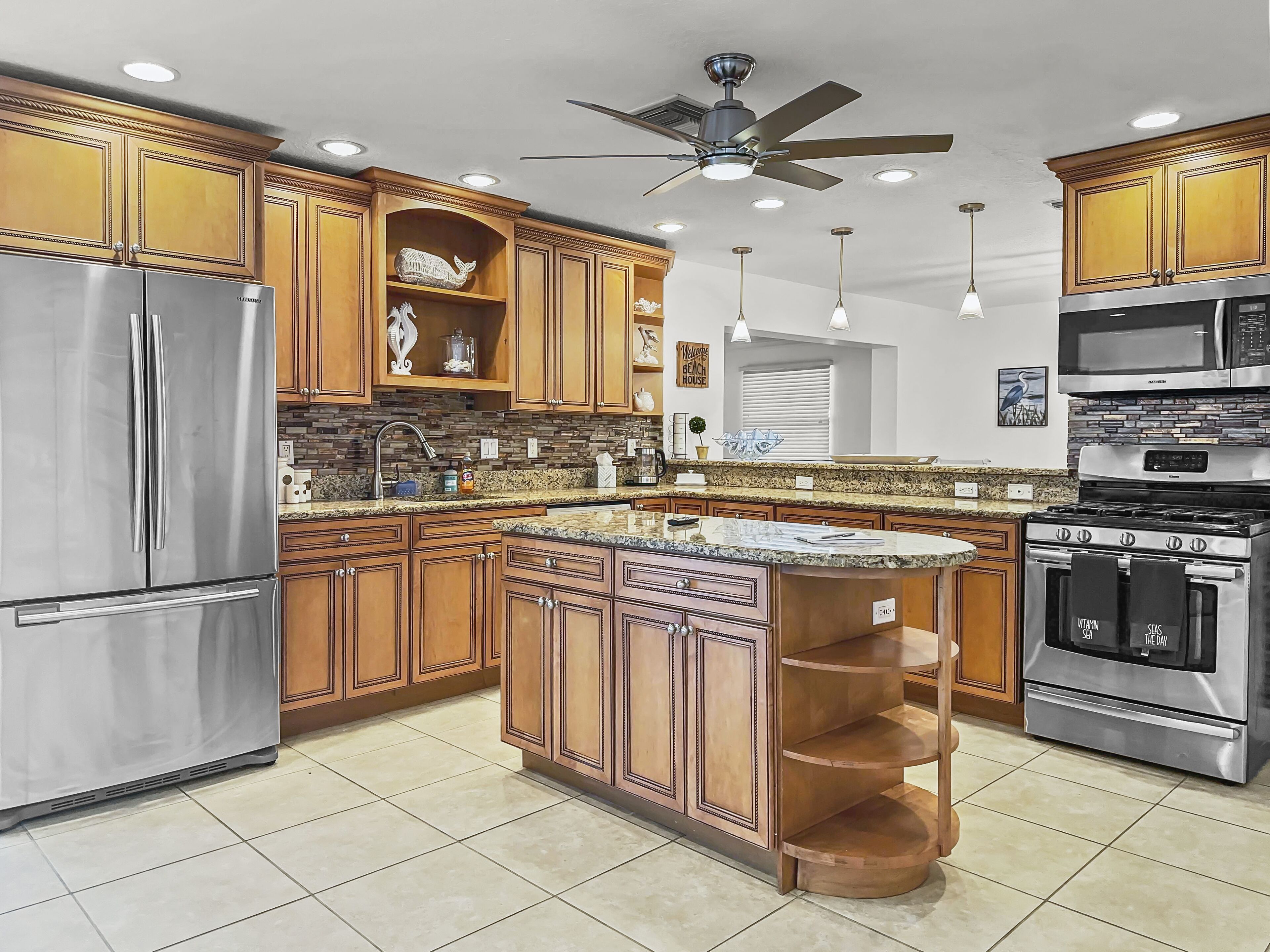 The interior of the home has been modernized with stylish decor and boasts an open floor plan. The living room features a large flat screen TV and plush seating for relaxation after a day of exploring the nearby beaches. The dining area accommodates up to 8 guests for family meals and entertaining visitors. The spacious kitchen is fully equipped with stainless steel appliances, granite countertops, and all the utensils and cookware needed to whip up delicious meals. A large island provides extra counter space for food preparation.