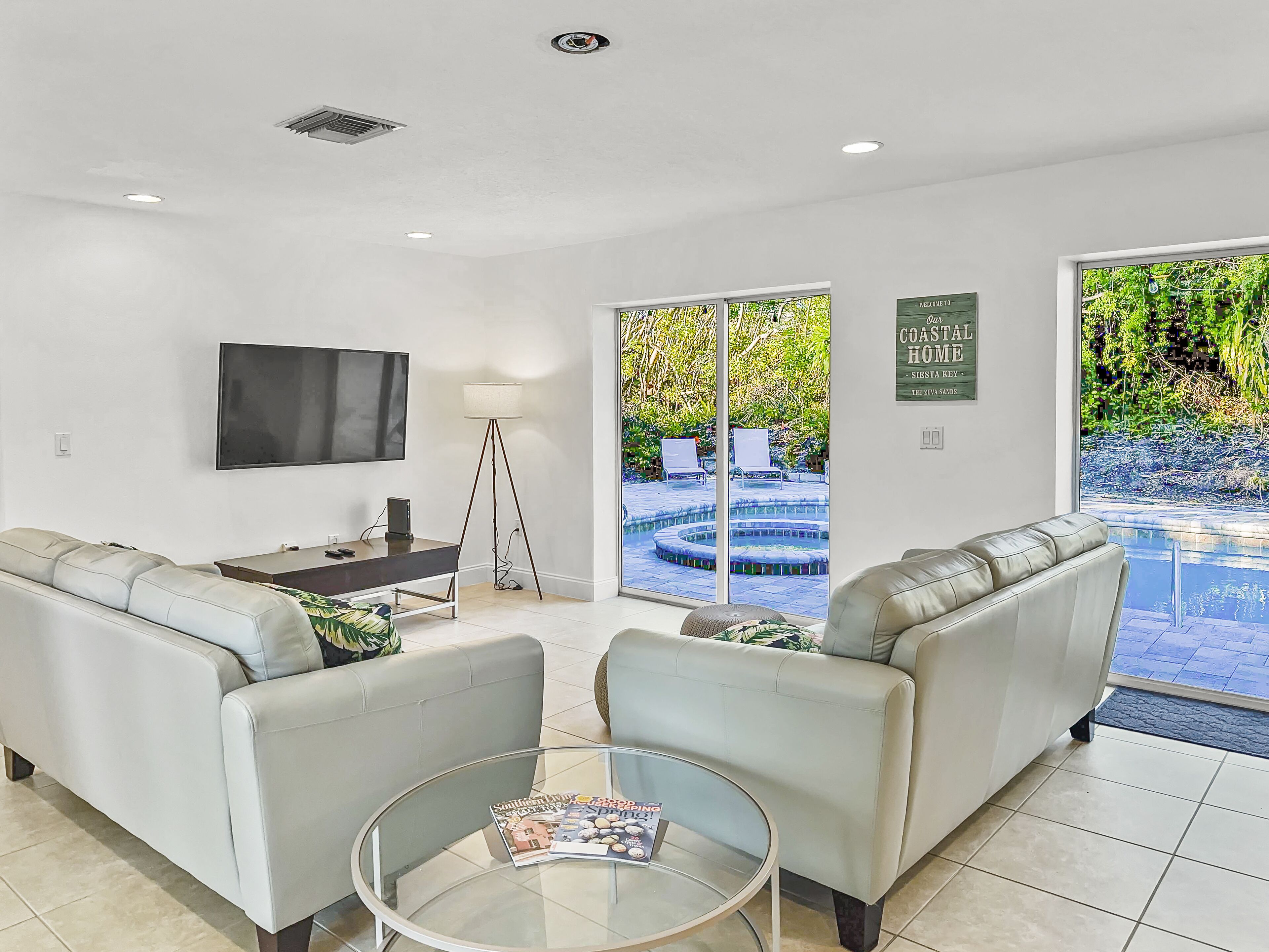 There are four bedrooms in total, each of which is beautifully appointed and decorated with cozy linens and plenty of closet space. The main bedroom has a comfortable king size bed and an en suite bathroom with a spacious shower. The other three bedrooms are furnished with an additional King and two comfortable queen size beds, while sharing a full bathroom with a tub and shower. Outside, the house is surrounded by lush tropical landscaping which provides a tropical oasis perfect for barbecues and al fresco dining. Sit out on the deck and enjoy the tranquil atmosphere with views of the surrounding area. The house is also equipped with a large private pool for your visit for those fun evenings away from the beach. Conveniently located within a short drive to the beaches, shopping, and dining in Siesta Key, this home is perfect for families or groups of friends visiting the area for an extended stay. Book your rental now and enjoy your dream vacation on Siesta Key!