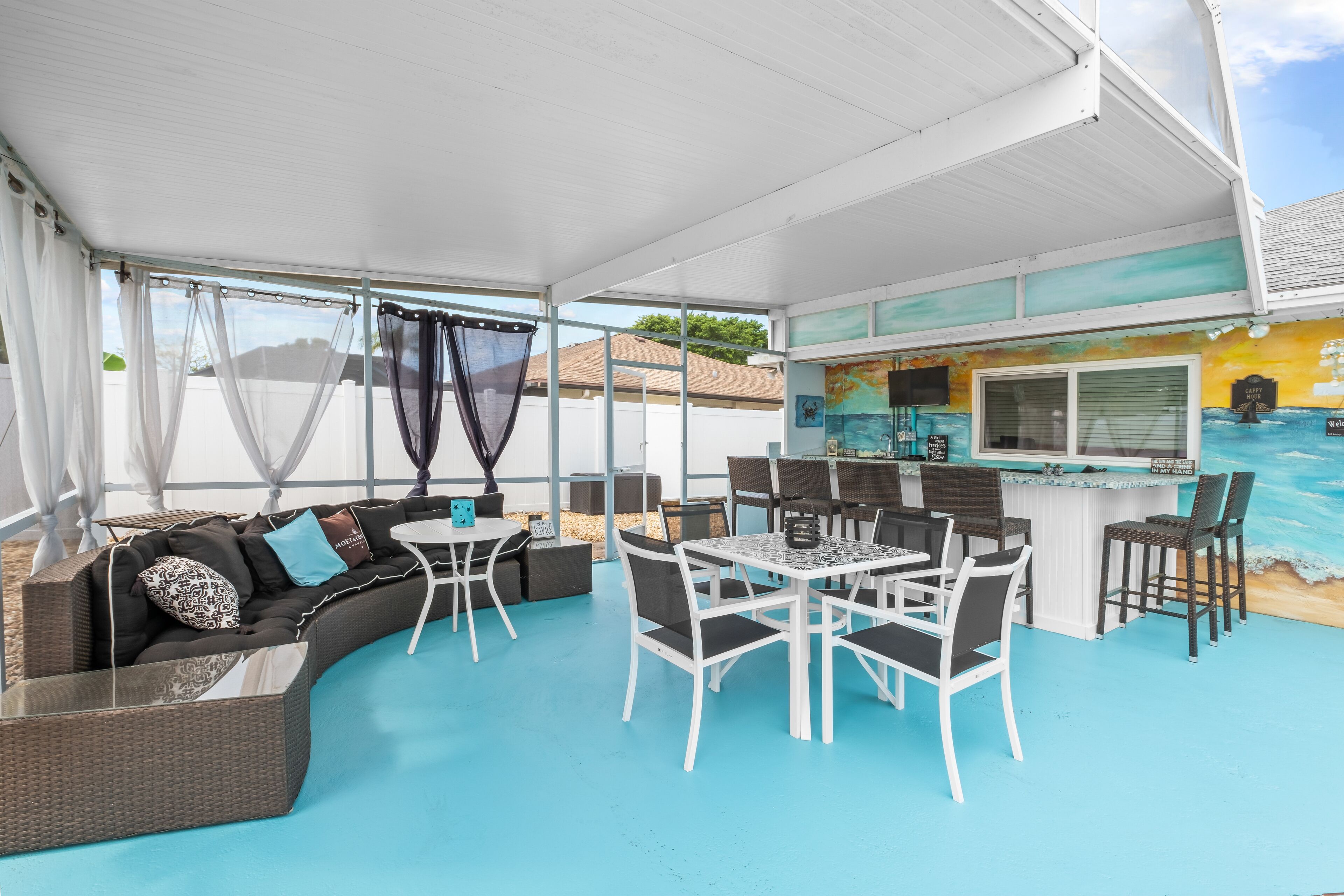 This new-to-market, 3 bedroom 2 bath pool home will fulfill all your needs for a fantastic vacation! You will love hanging outside by the pool, there is a table and bench inside the pool to sit and cool off with your favorite beverage, and there's a water feature.. an outside bar and lounge area, and a fire pit. Inside you will find an open floor plan and a chef's kitchen with everything you will need to cook a gourmet meal including double ovens. Have fun in the Florida room with another bar, Skeeball, Air Hockey, Shuffleboard, a massage chair, and lots of games to entertain the whole family. The windows in this room accordion open to each side so in cooler weather can be open to the outside screened-in pool cage area letting the outside in.