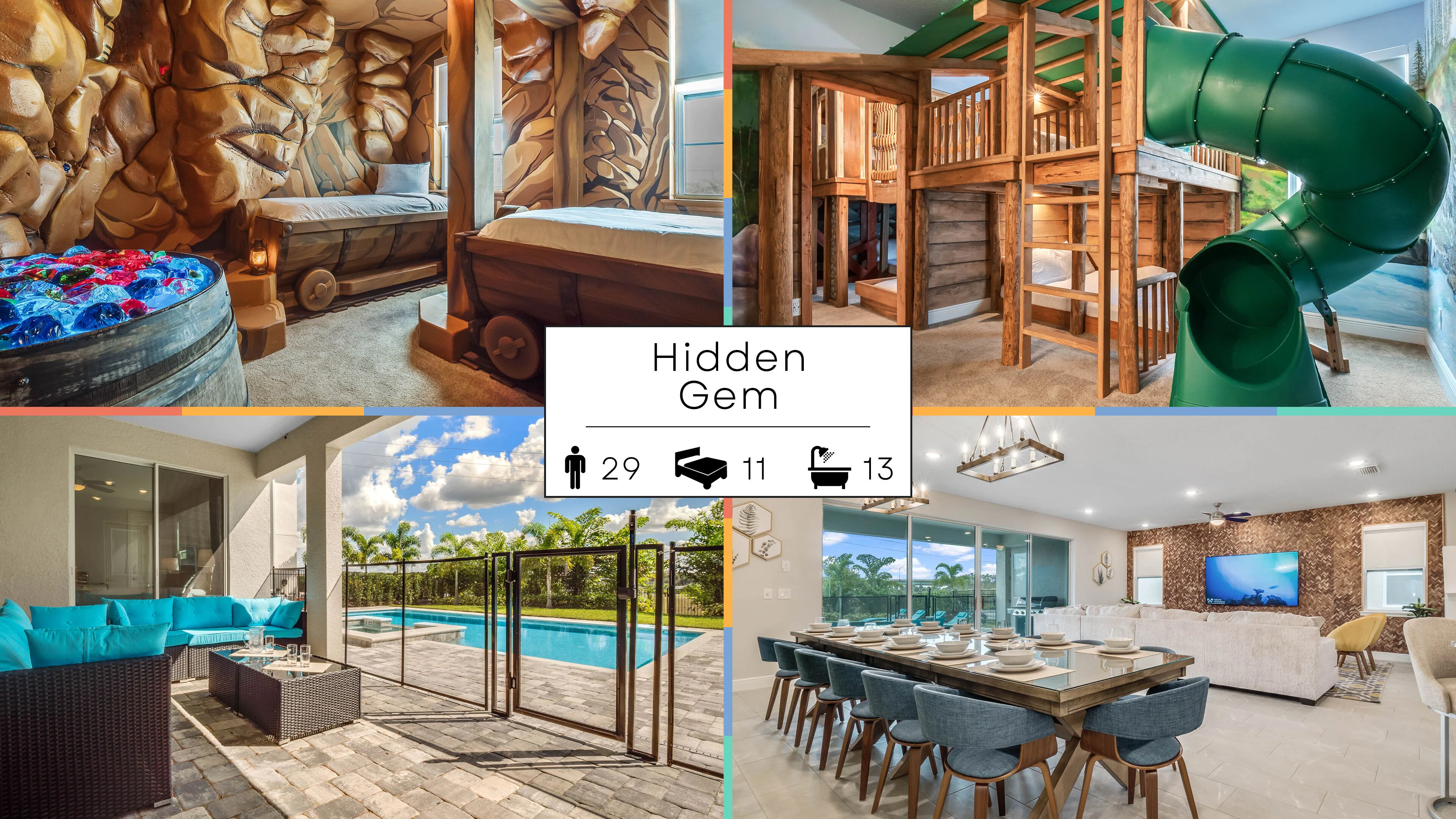 My family and I stayed at the Hidden Gem home and were amazed at the size and details of the home. The bedrooms were perfect for our family. The online photos do not do it justice, it is beautiful. The treehouse room was great for our kids!! We had a family of 20 and we never felt cramped, it is a huge home. It was a perfect stay for our short family get together. We highly recommend this home for a large family stay.