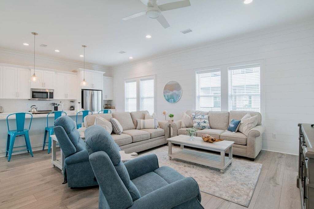 The home has an open floor plan that combines the living, dining and kitchen into one great room. The kitchen has a large bar/island with seating. The kitchen is fully stocked with everything you need for dining in!