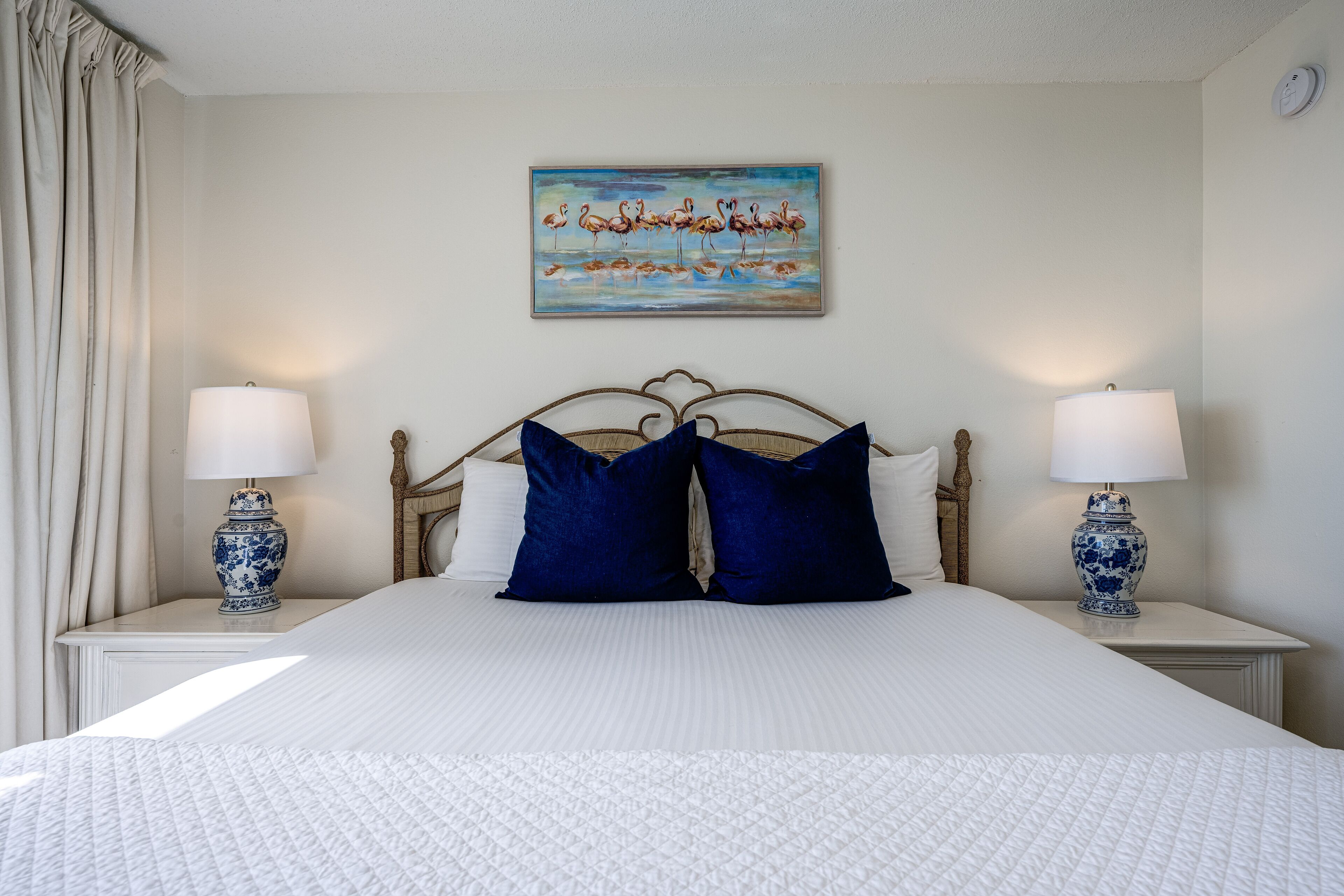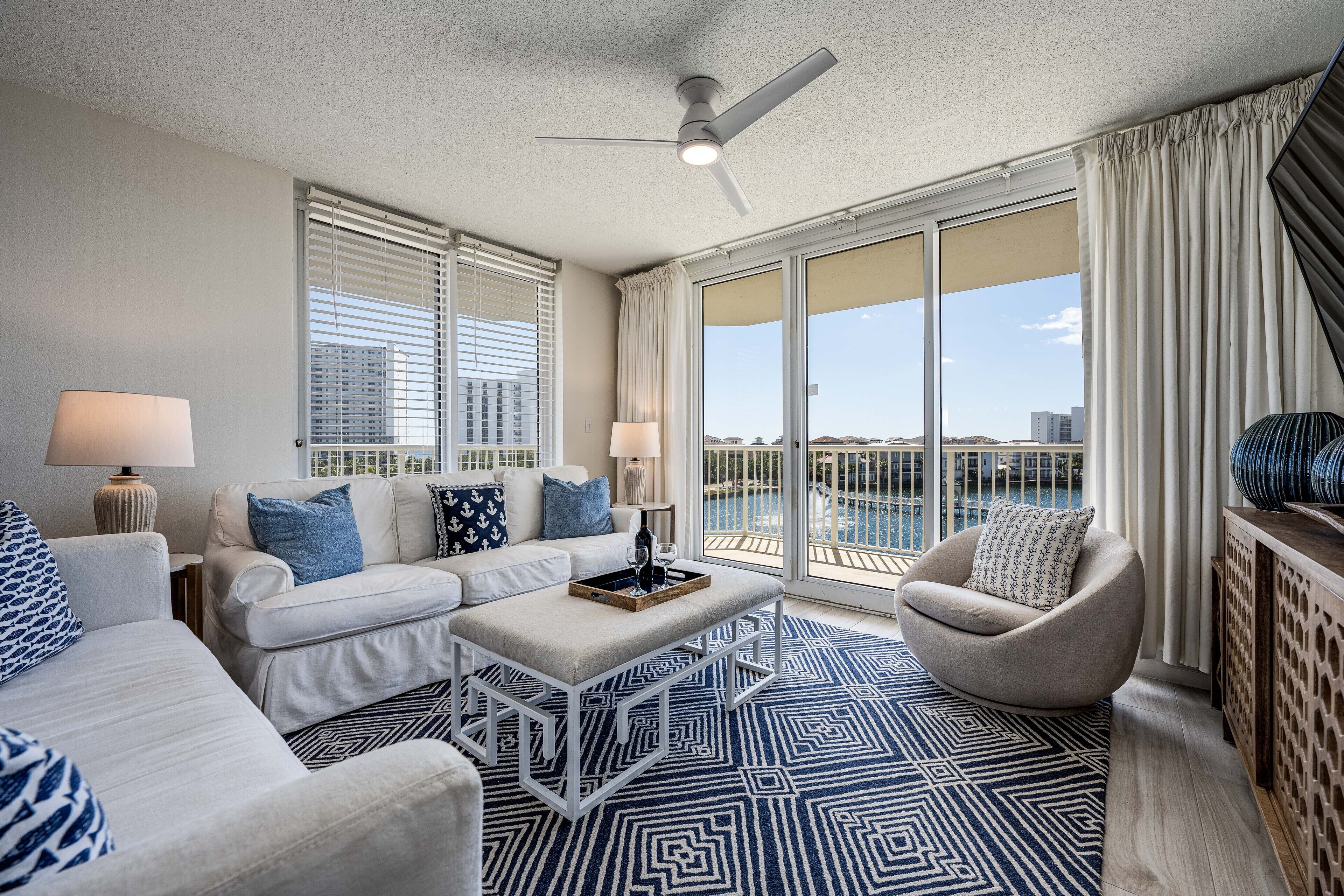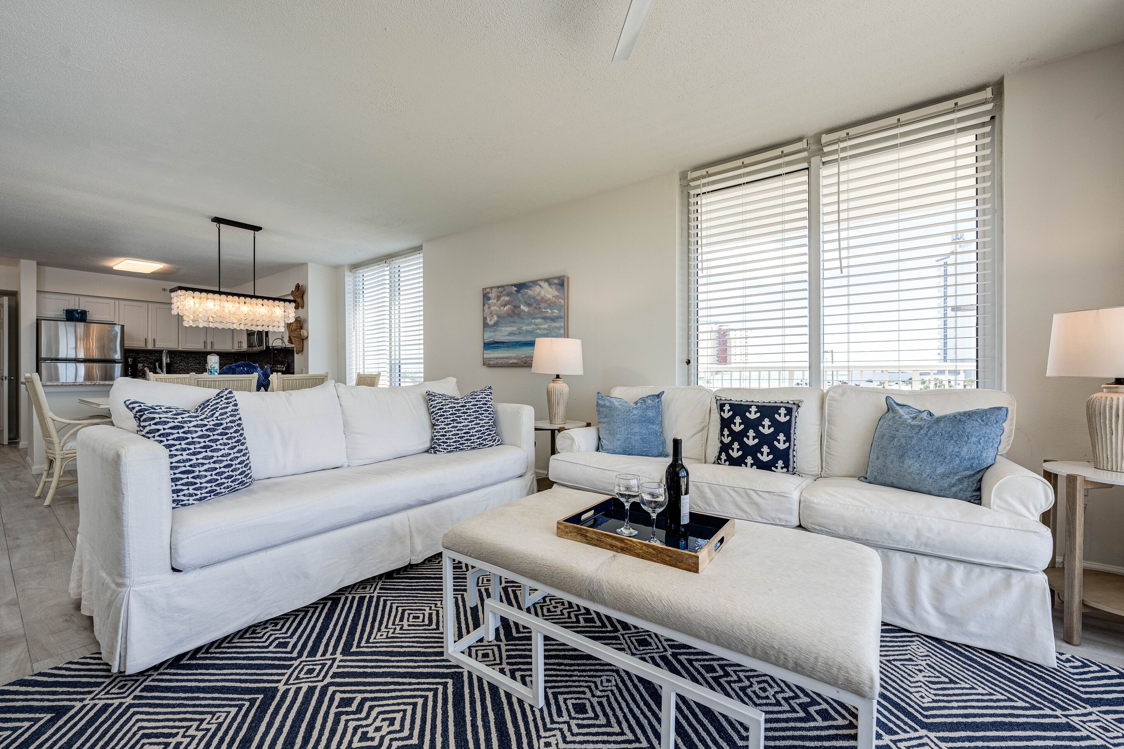 The living and dining areas are open and roomy with splashes of coastal whimsey. Off the living area is an abundant wrap-around balcony for morning coffee, evening beverages, or just to linger and appreciate the lake and Gulf views.