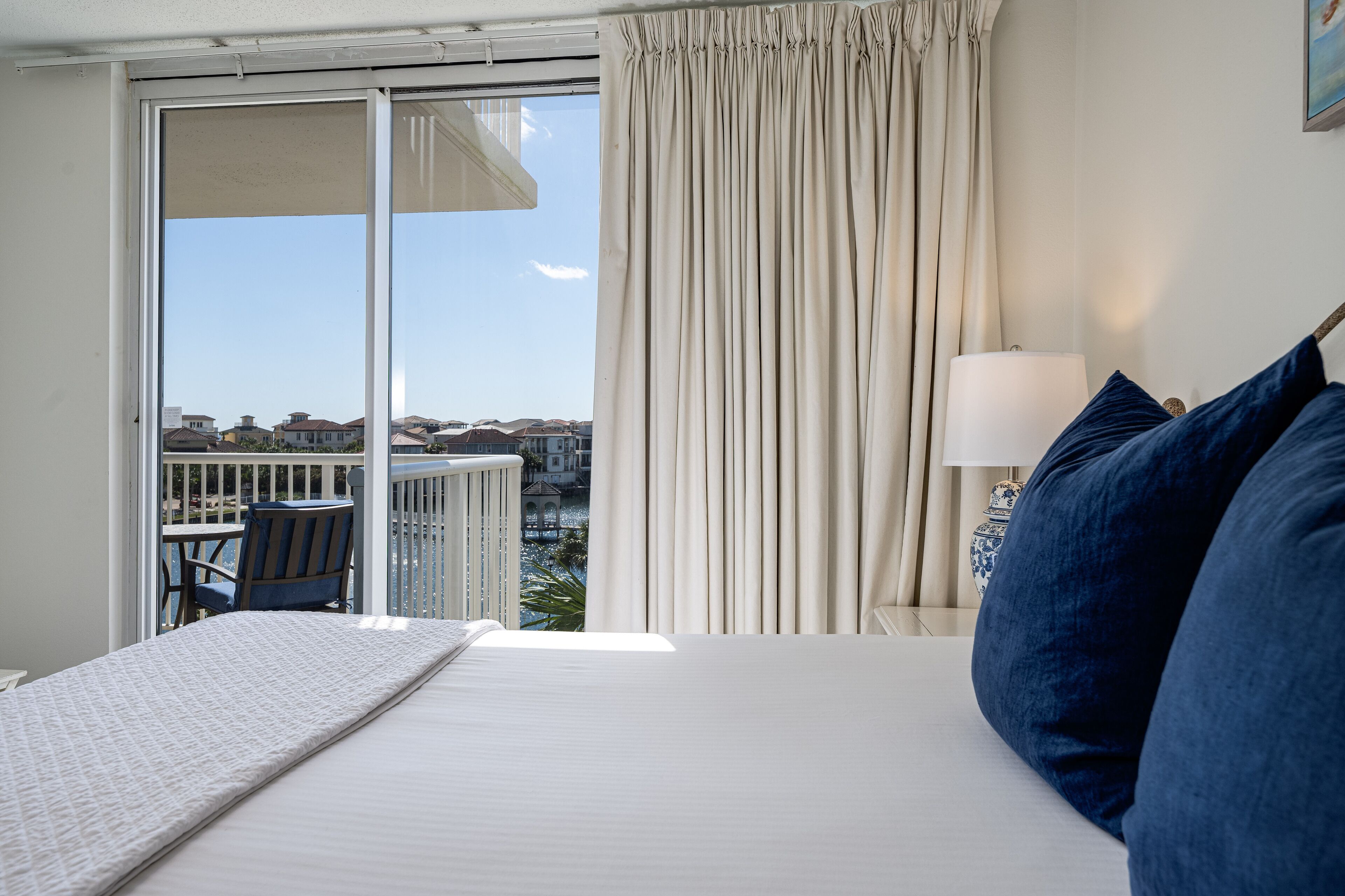 The master bedroom is off the living area and has access to the wrap-around balcony as well. You'll wake to views of the Gulf before meandering into your private bath. Here you will find a luxurious full shower with barn-style glass doors.