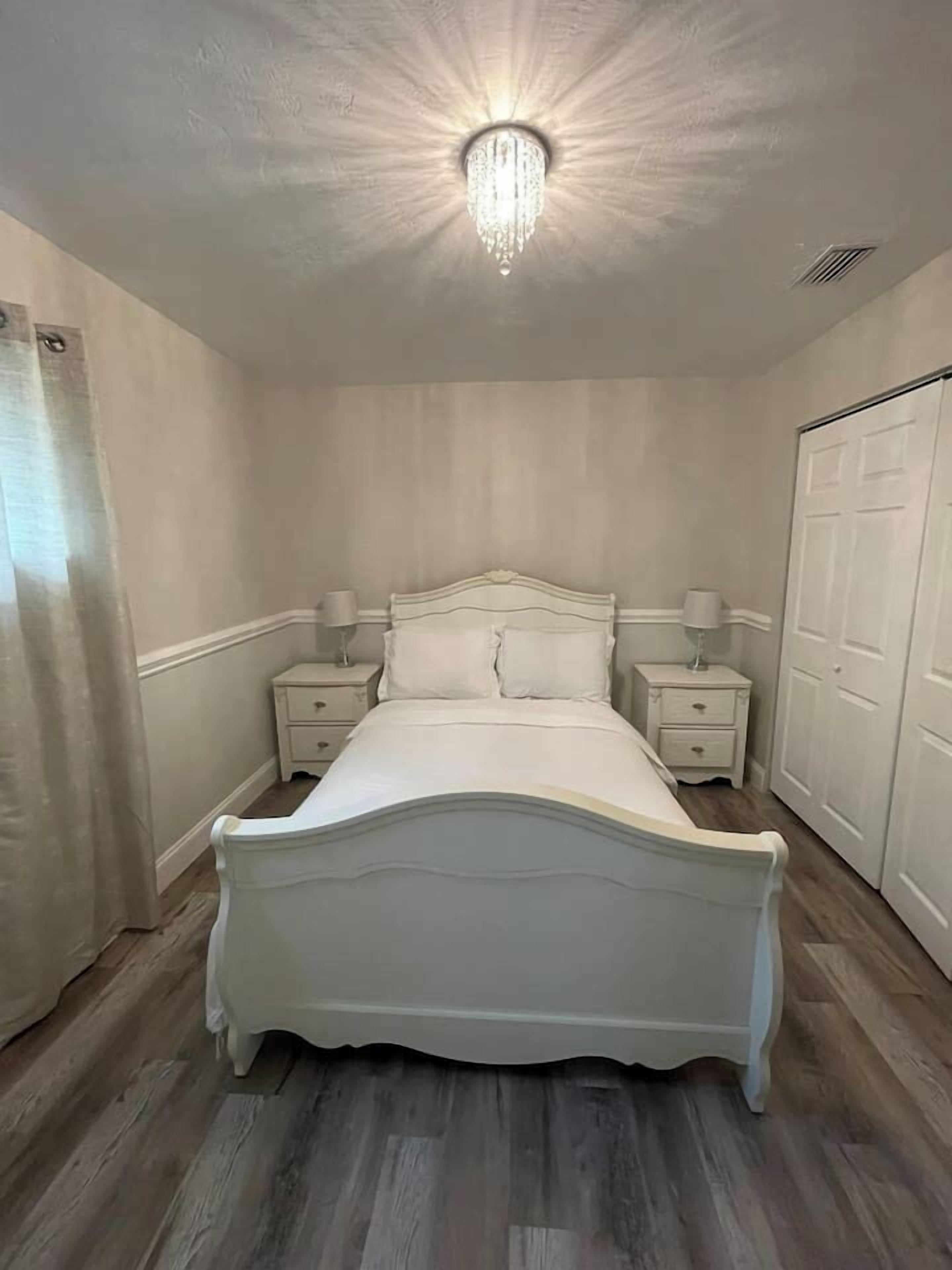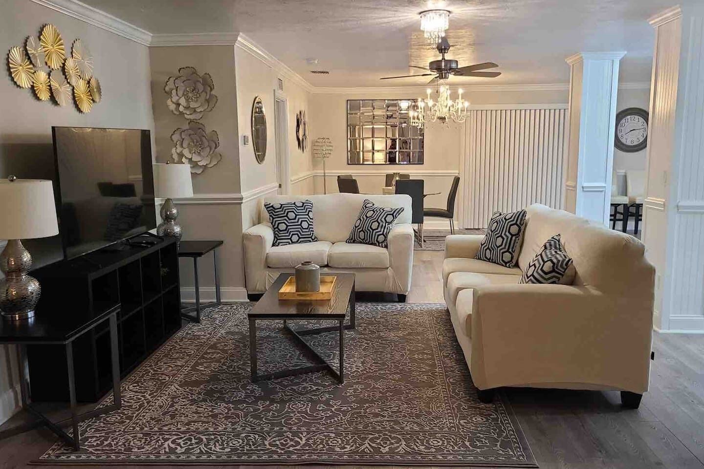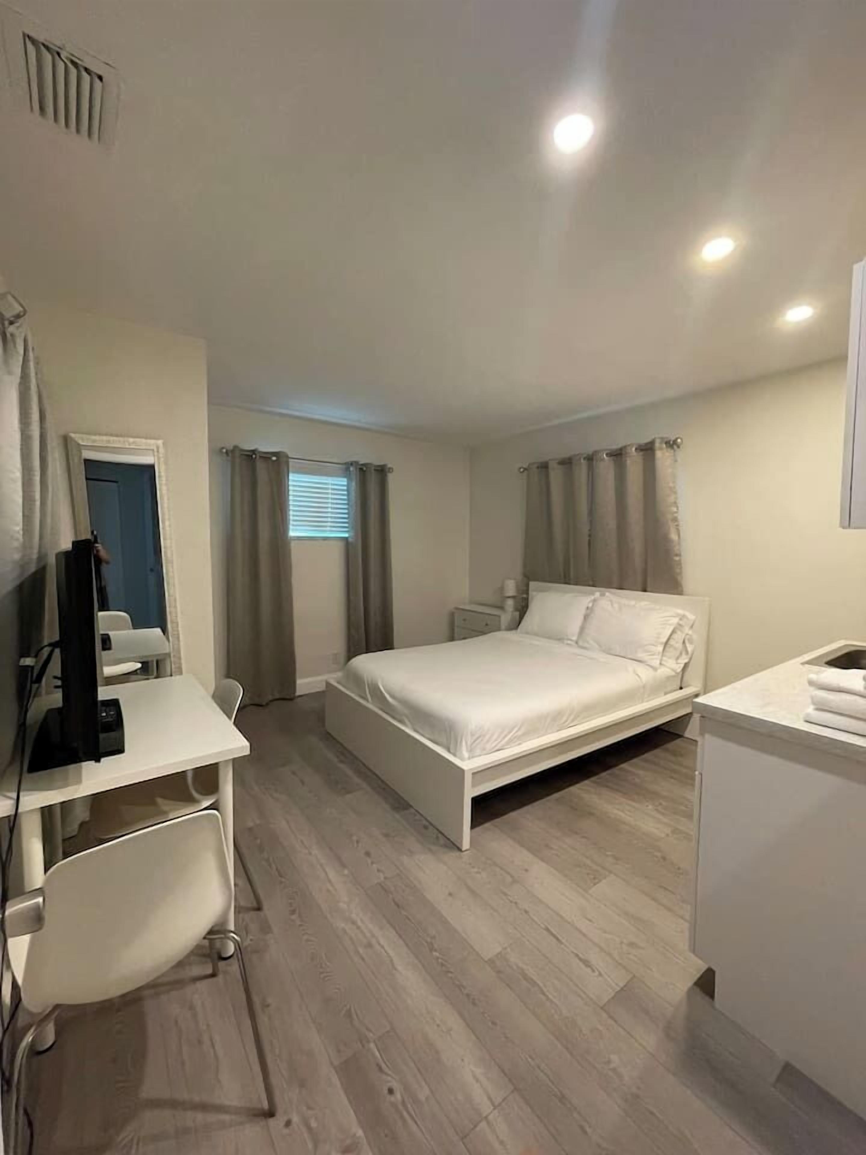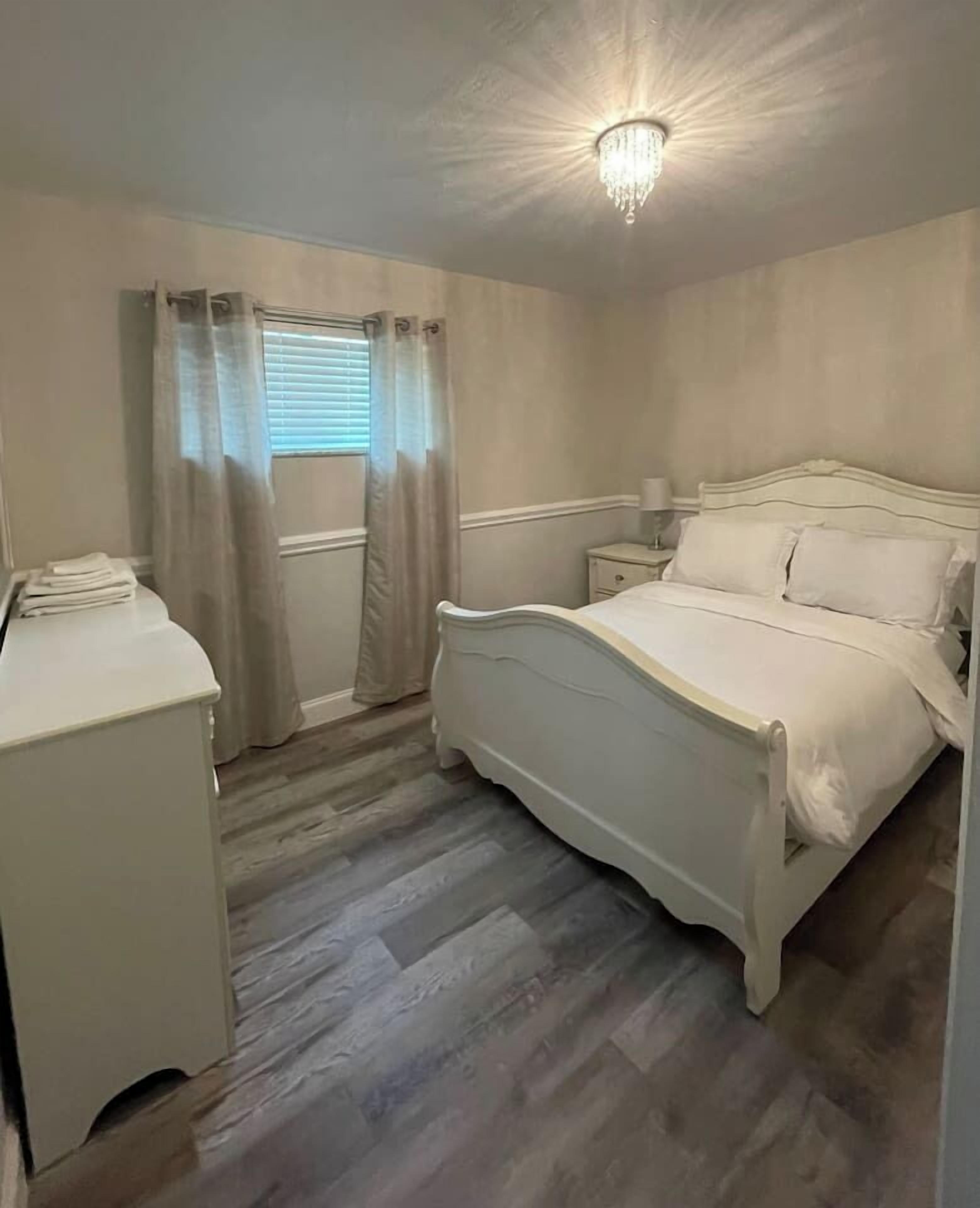 The layout: Front door opens up to a formal foyer with shoe storage and seating. Following into a living room with 3 couches, coffee table, and smart TV. Eating space for at least 7 people with formal dining area + kitchen island. Chef’s Kitchen is updated and fully stocked to make you feel at home. An independent master suite (Walk-in closet & en-suite bathroom). The other two bedrooms share a hallway with full bathroom. In house laundry. Fully updated & modern bathrooms throughout. The 3rd room at front of home features a kitchenette area with optional independent entrance that leads to the driveway.