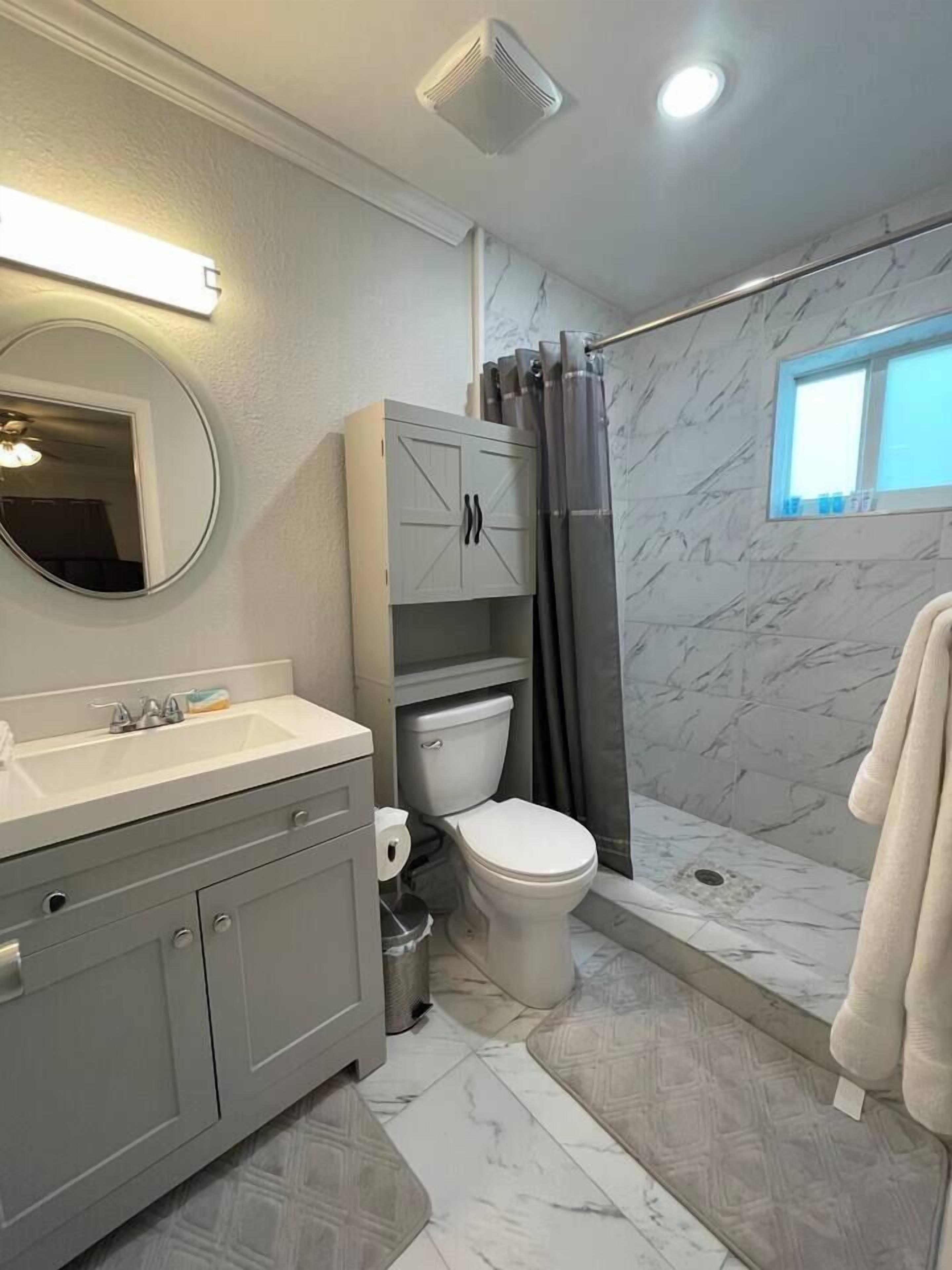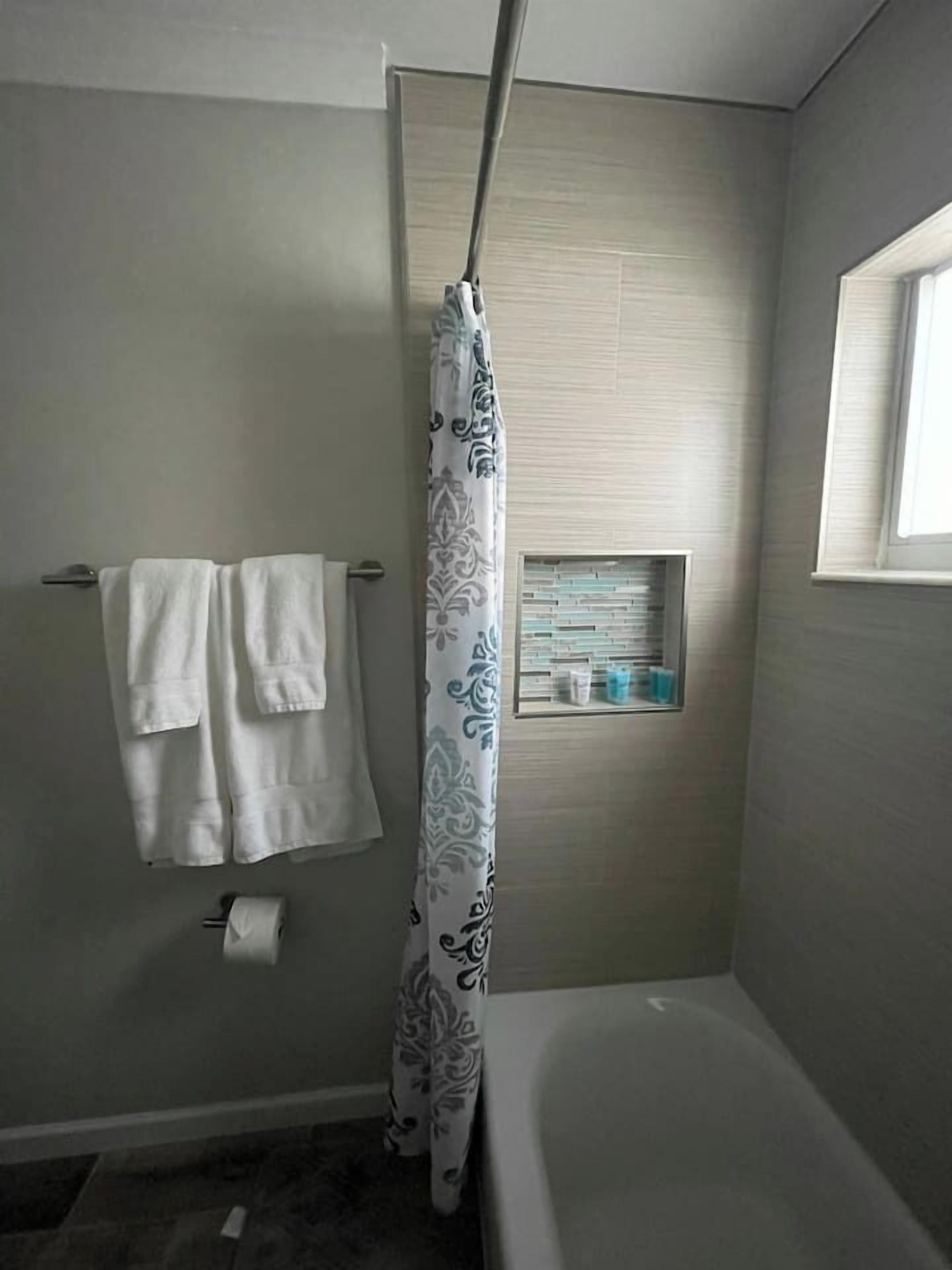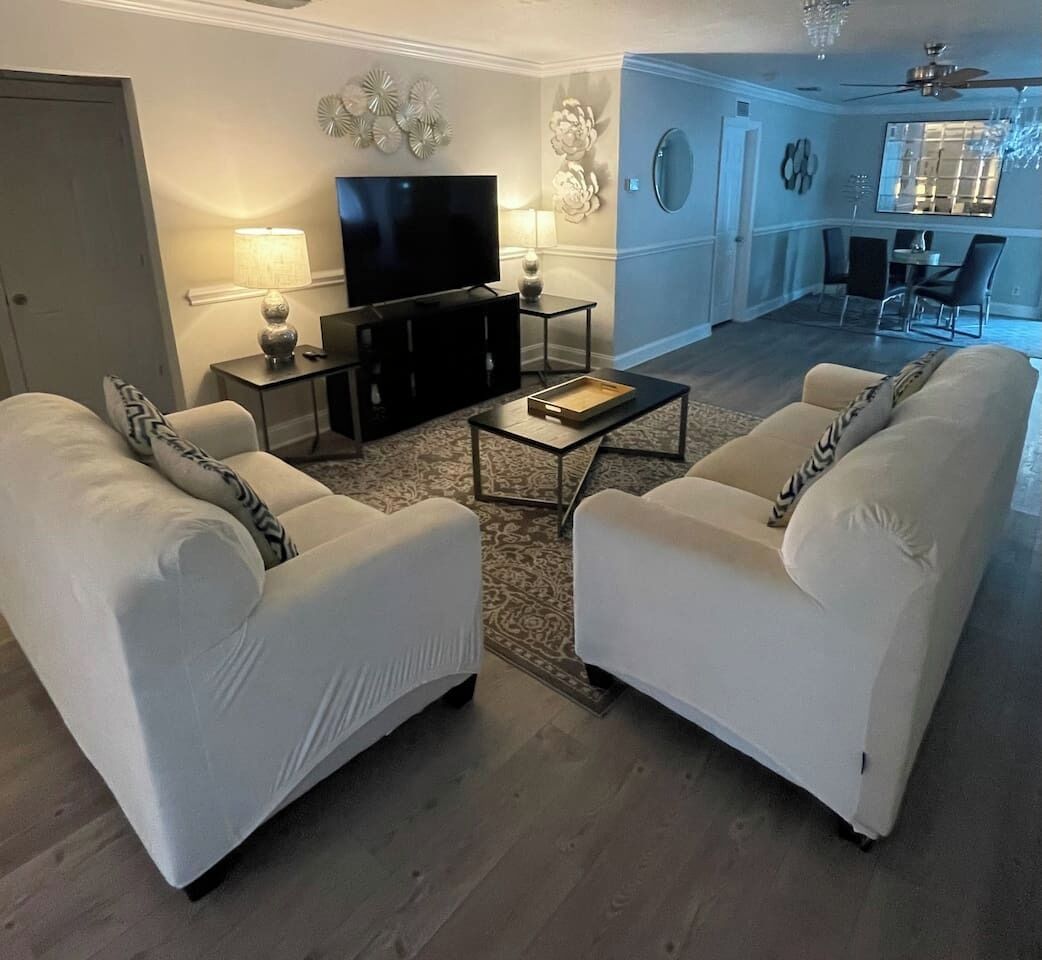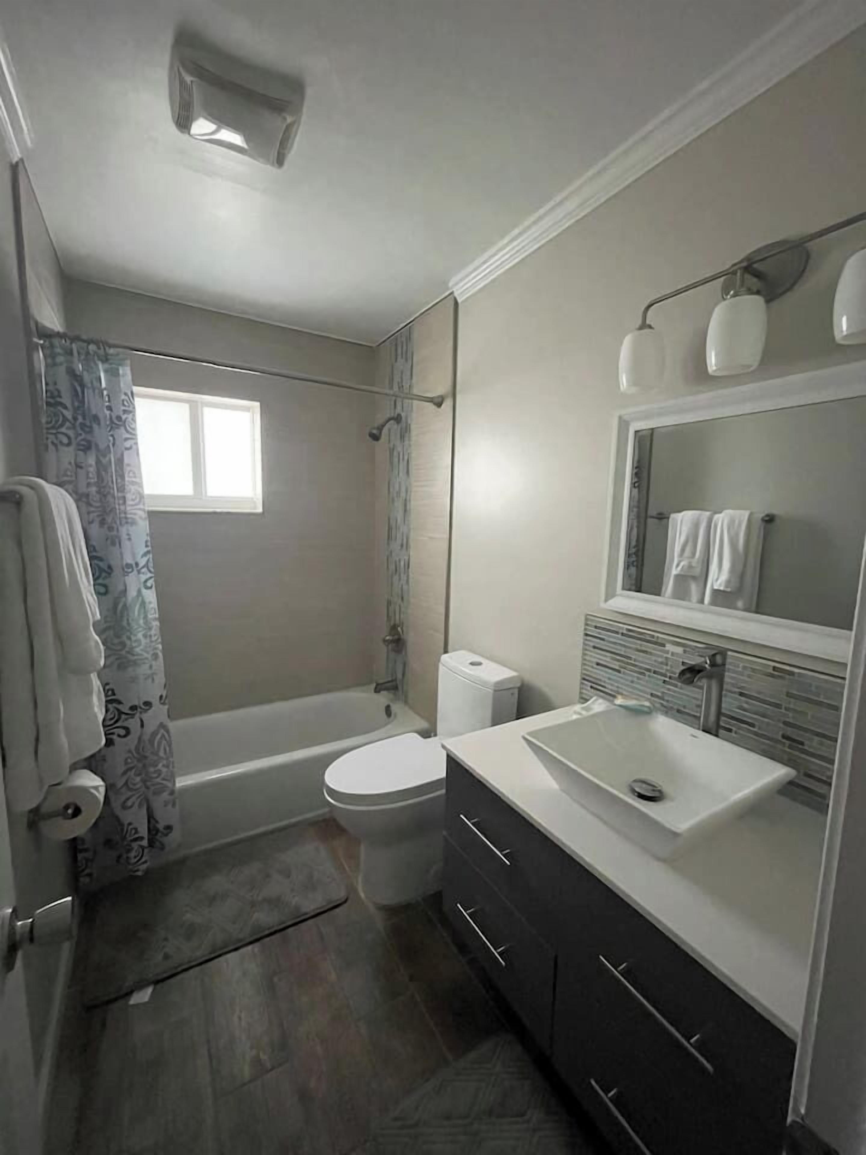 The layout: Front door opens up to a formal foyer with shoe storage and seating. Following into a living room with 3 couches, coffee table, and smart TV. Eating space for at least 7 people with formal dining area + kitchen island. Chef’s Kitchen is updated and fully stocked to make you feel at home. An independent master suite (Walk-in closet & en-suite bathroom). The other two bedrooms share a hallway with full bathroom. In house laundry. Fully updated & modern bathrooms throughout. The 3rd room at front of home features a kitchenette area with optional independent entrance that leads to the driveway.