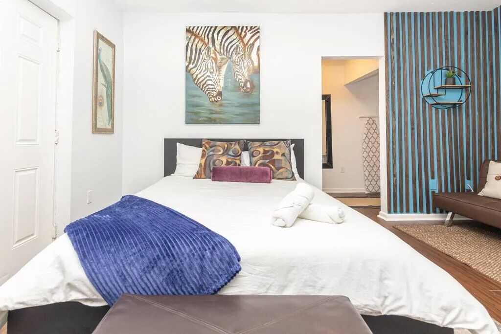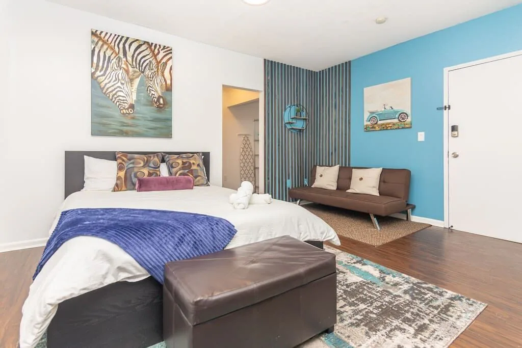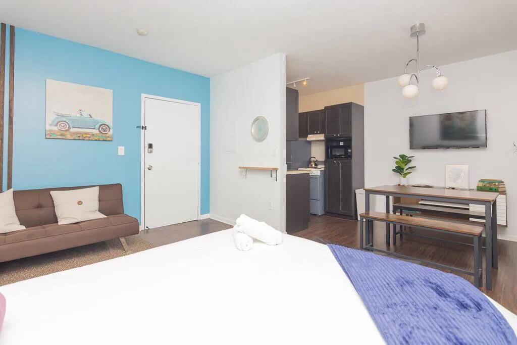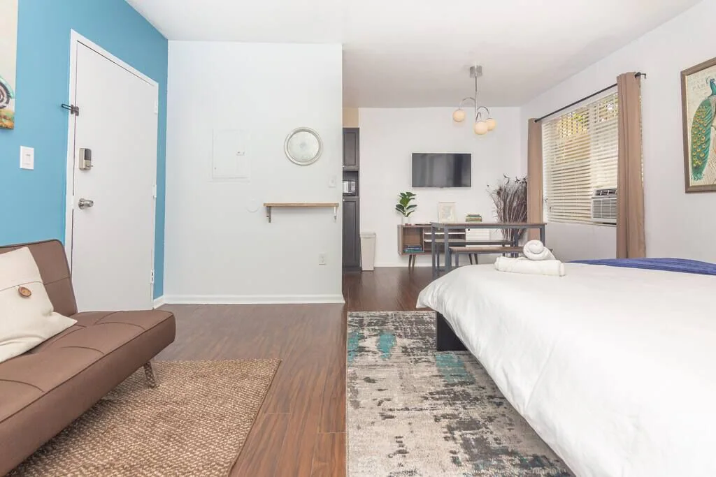 Large studio stylish space with manicured décor. Warm feeling that makes you want to stay in and cozy up in bed. This studio is unique that it has its own private rear entrance through the courtyard.