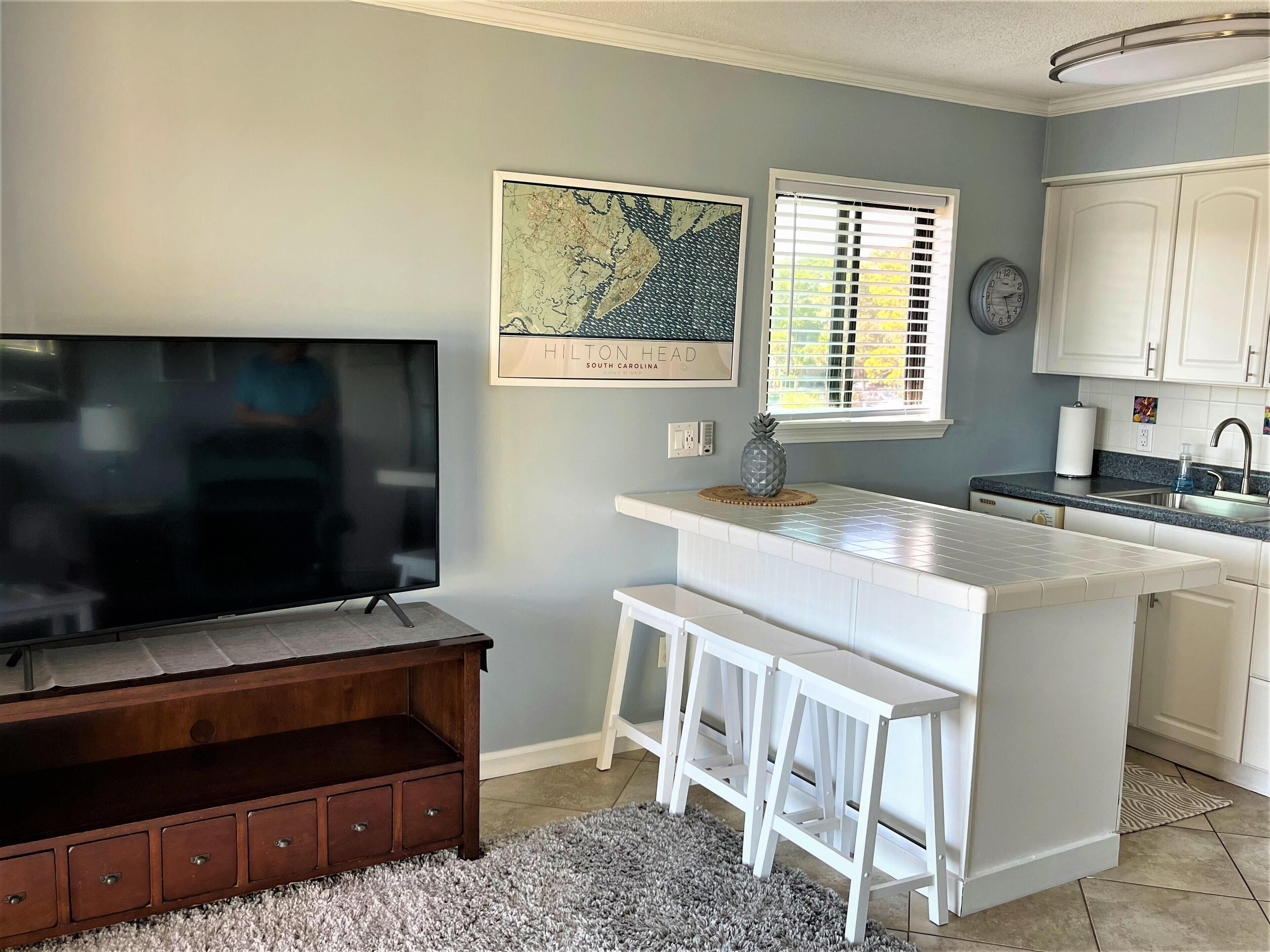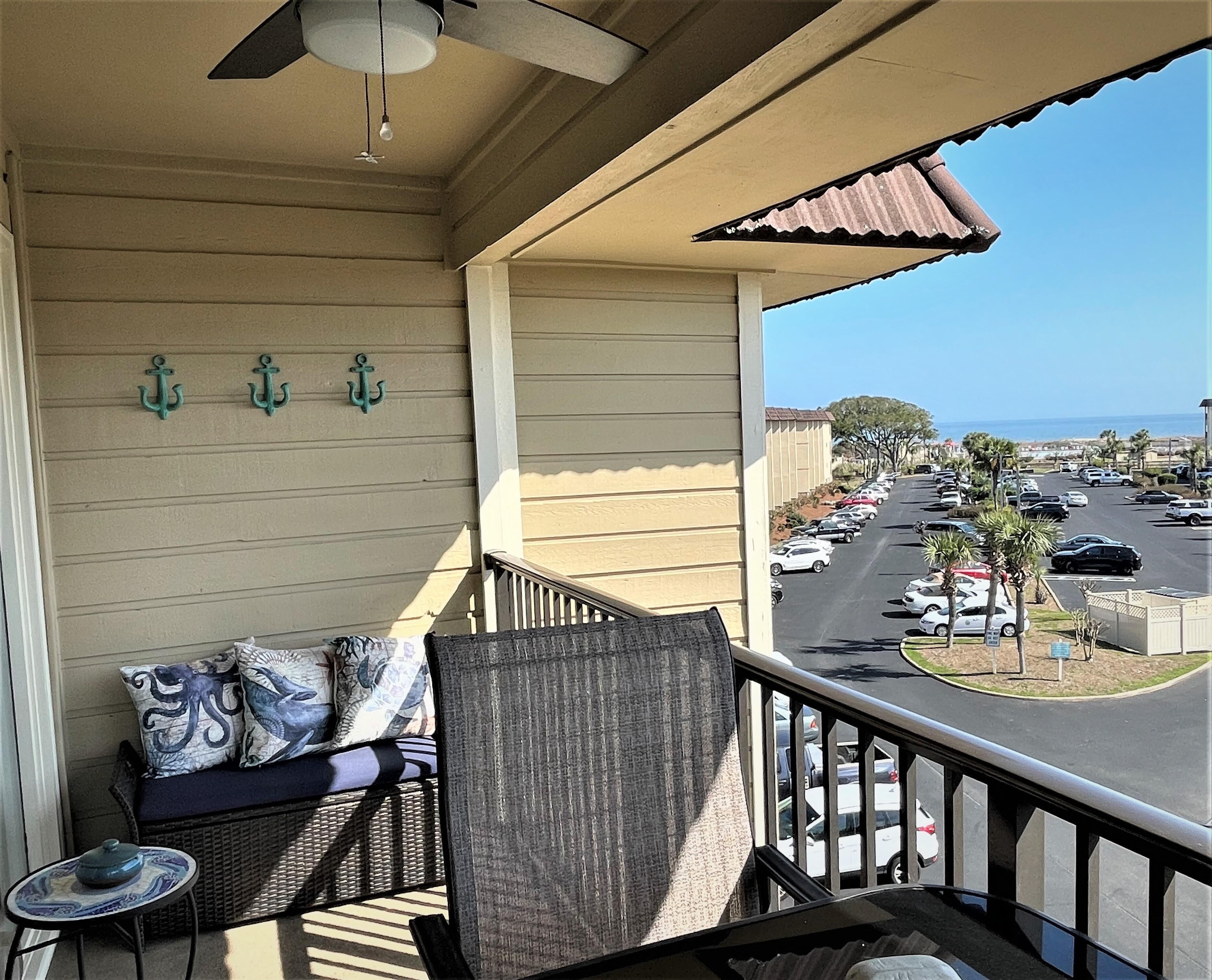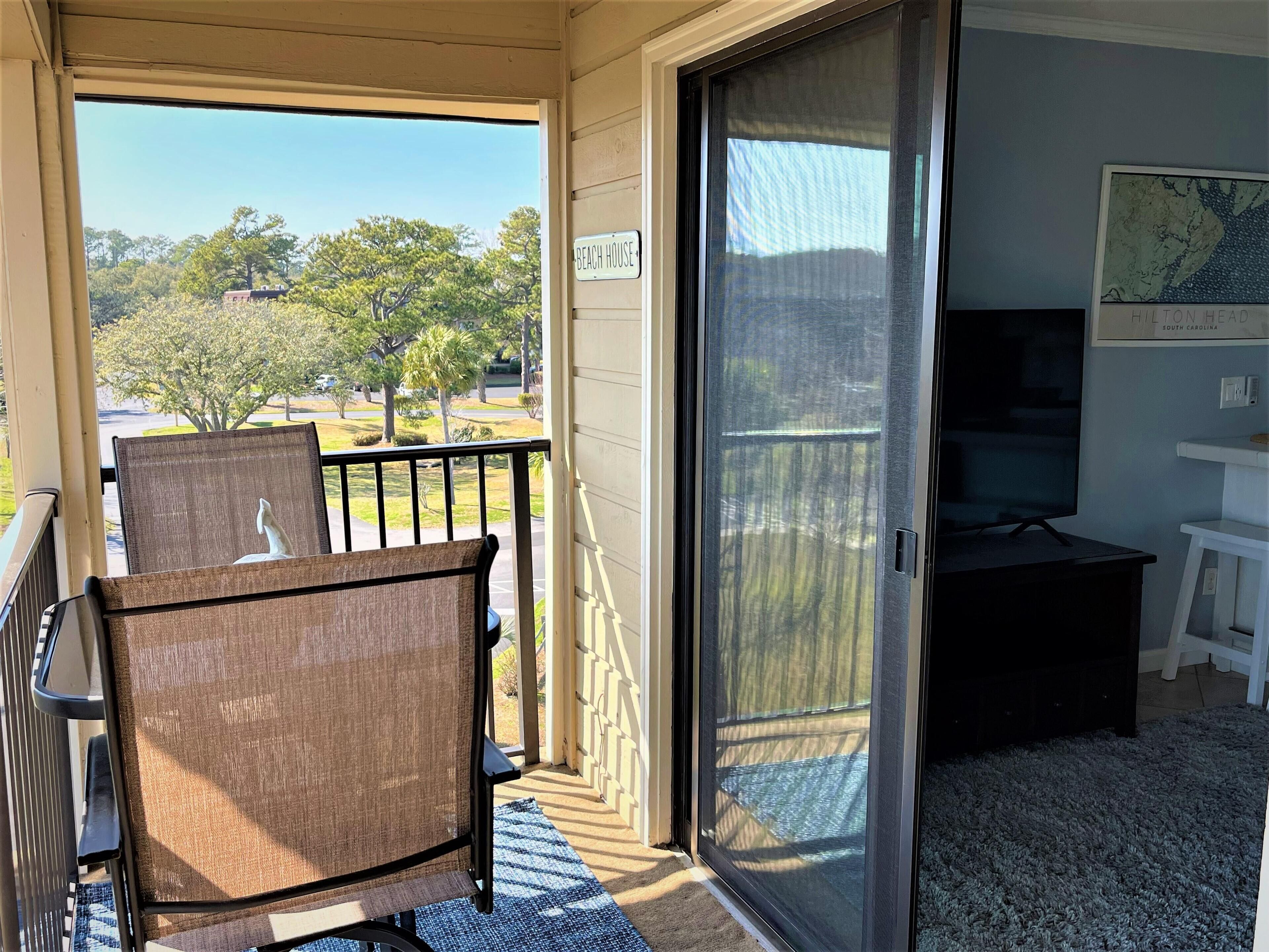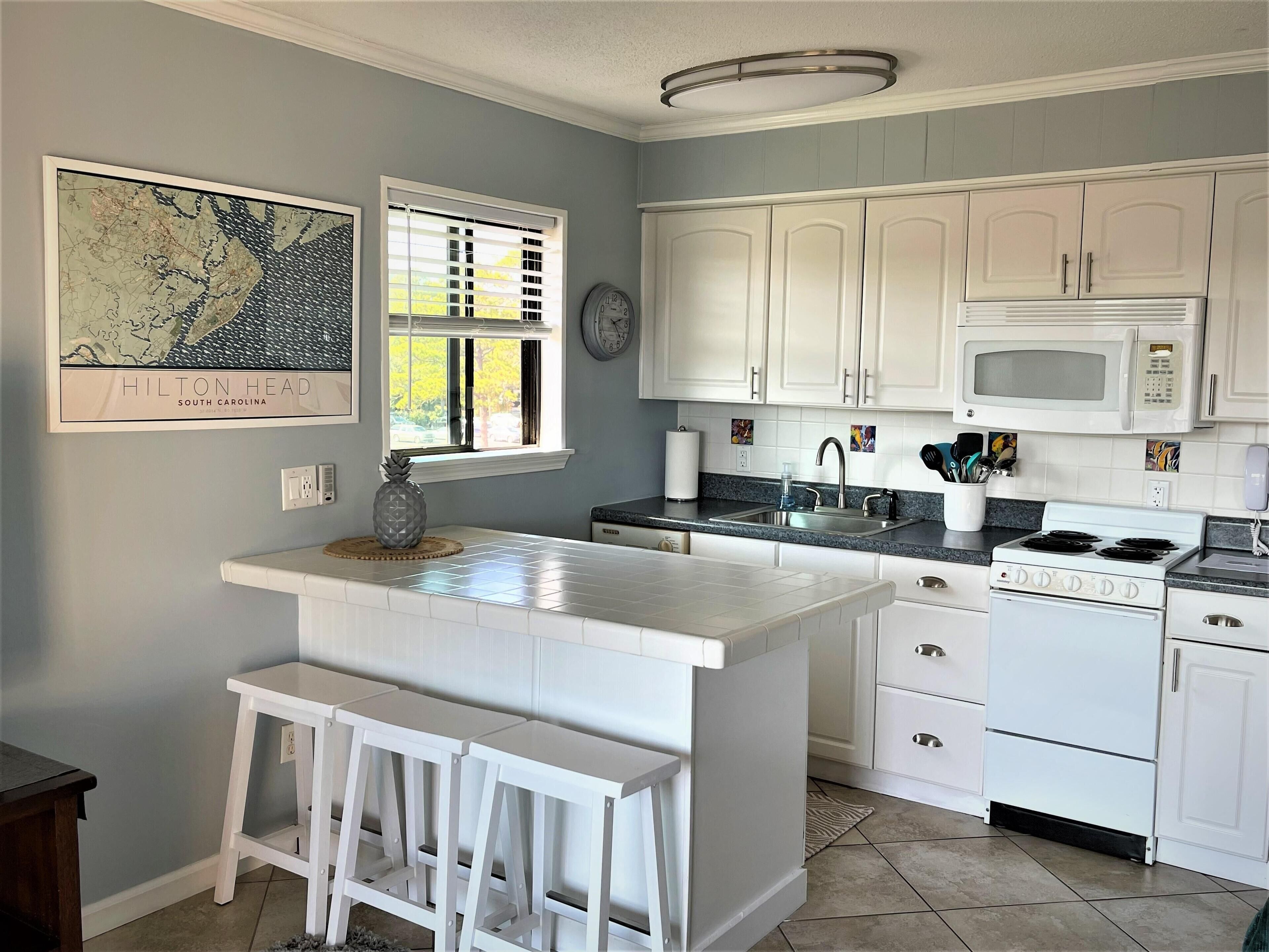 Private Entrance and close to the Elevator is the location for this Top Floor Villa with great views of the ocean from the balcony. There is a private bedroom with a Queen Bed and a built-in bunk bed in common area of bedroom which is perfect for children and a sleeper sofa. Quick 1 minute walk to beach and largest beach pool on Hilton Head. The elevator is close by for easy access. The villa is nice and clean with tile throughout. . Updated kitchen with white cabinets, island bar, stove, microwave, full size refrigerator and dishwasher, This vacation villa has everything you would expect to get in a vacation rental with a fully stocked kitchen and bed & bath linens included. Ride bikes on the beach or on the miles of bike trails around Hilton Head Island.