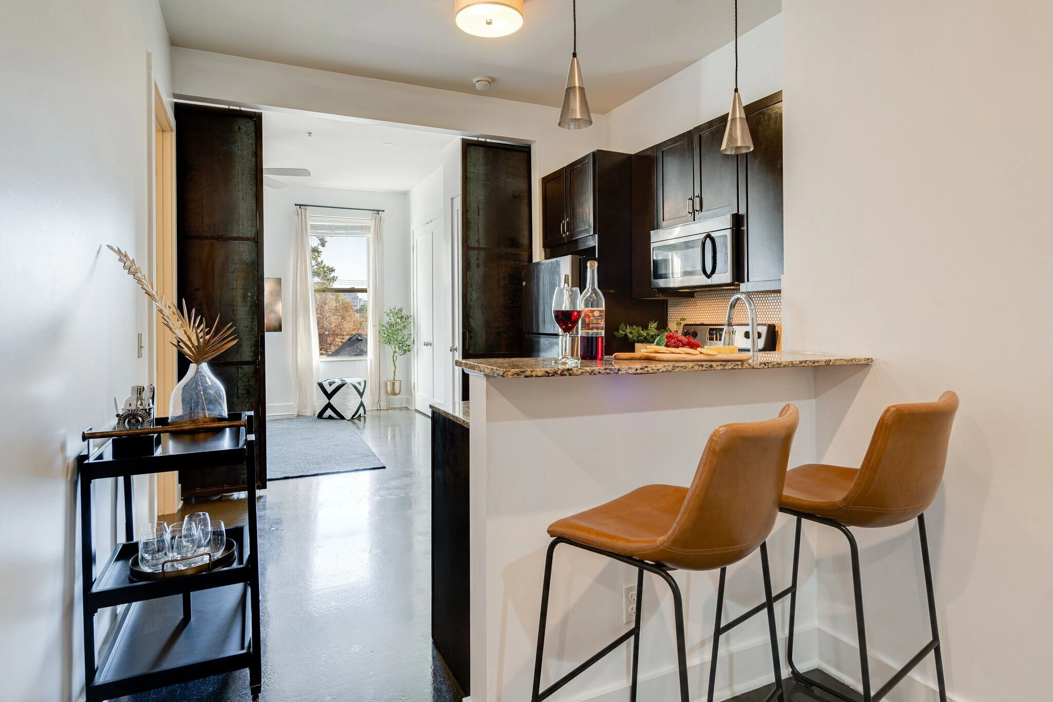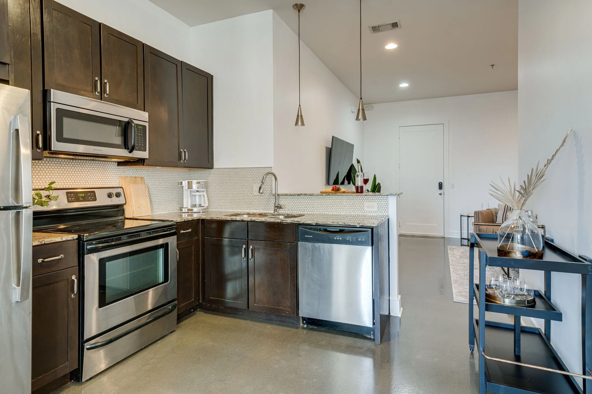 Immerse yourself in the allure of an open concept living area. Designer furnishings invite you to relax as the smart TV offers entertainment. Discover the perfect blend of style and relaxation. The living room will also offer a sleeper sofa for additional sleeping arrangements for your friends or family.