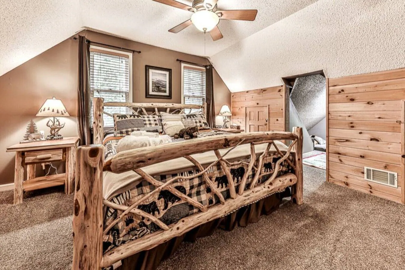 Guests will have access to the entire 2,000+ sq. ft cabin as well as a two car garage. The cabin has keypad access for contactless check in and there are no steps from the driveway to the front door and no steps into the cabin's first floor living area. There is one security camera facing the walkway on the exterior, facing the driveway and does not face any interior spaces.
