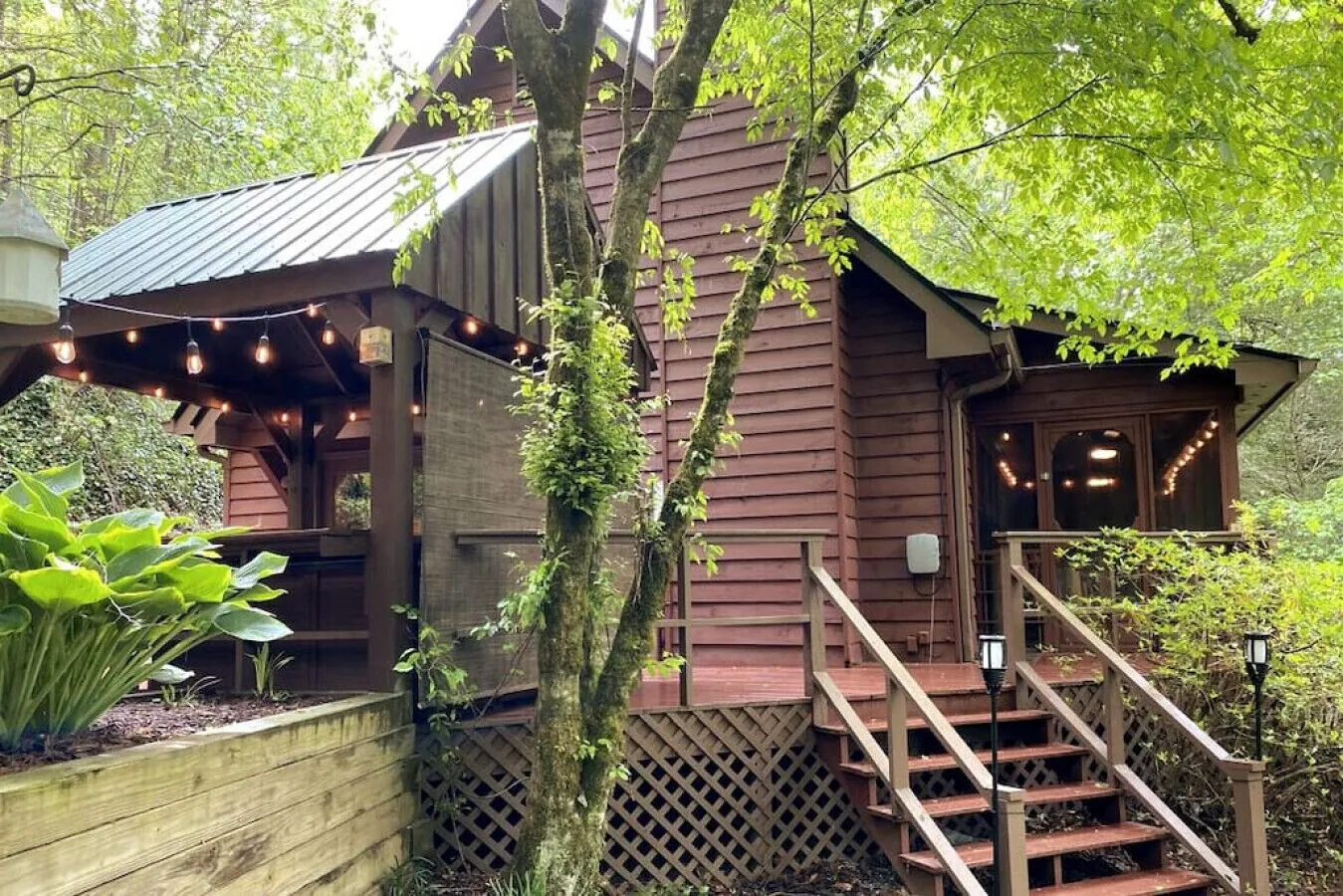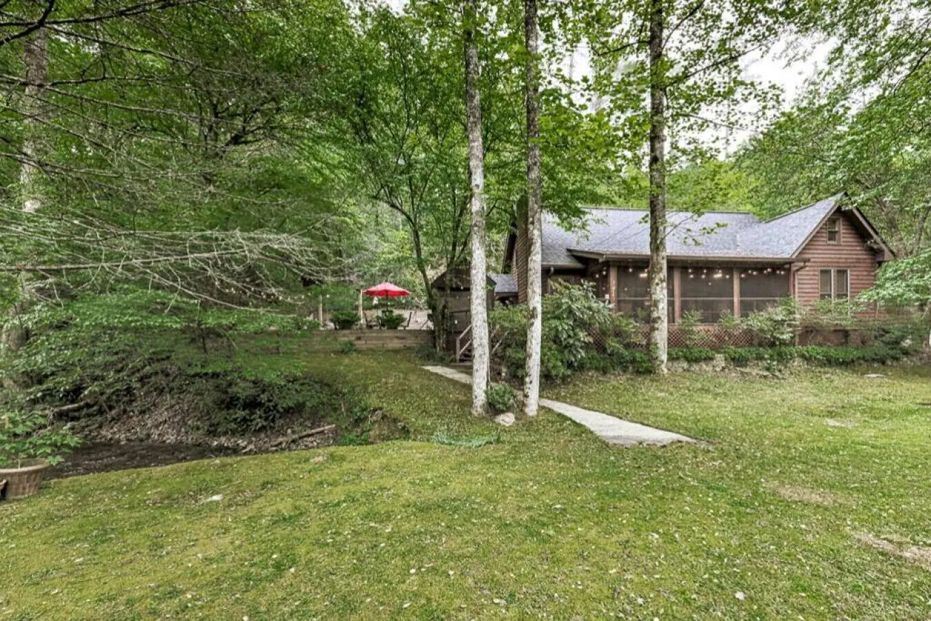 Buddy's is not in an HOA community and does have a couple of neighboring properties that you can barely see through the trees. The creek flows from one cabin to the next and all are set back in a plush valley. Upon driving to the property you'll drive under hanging pine trees.
