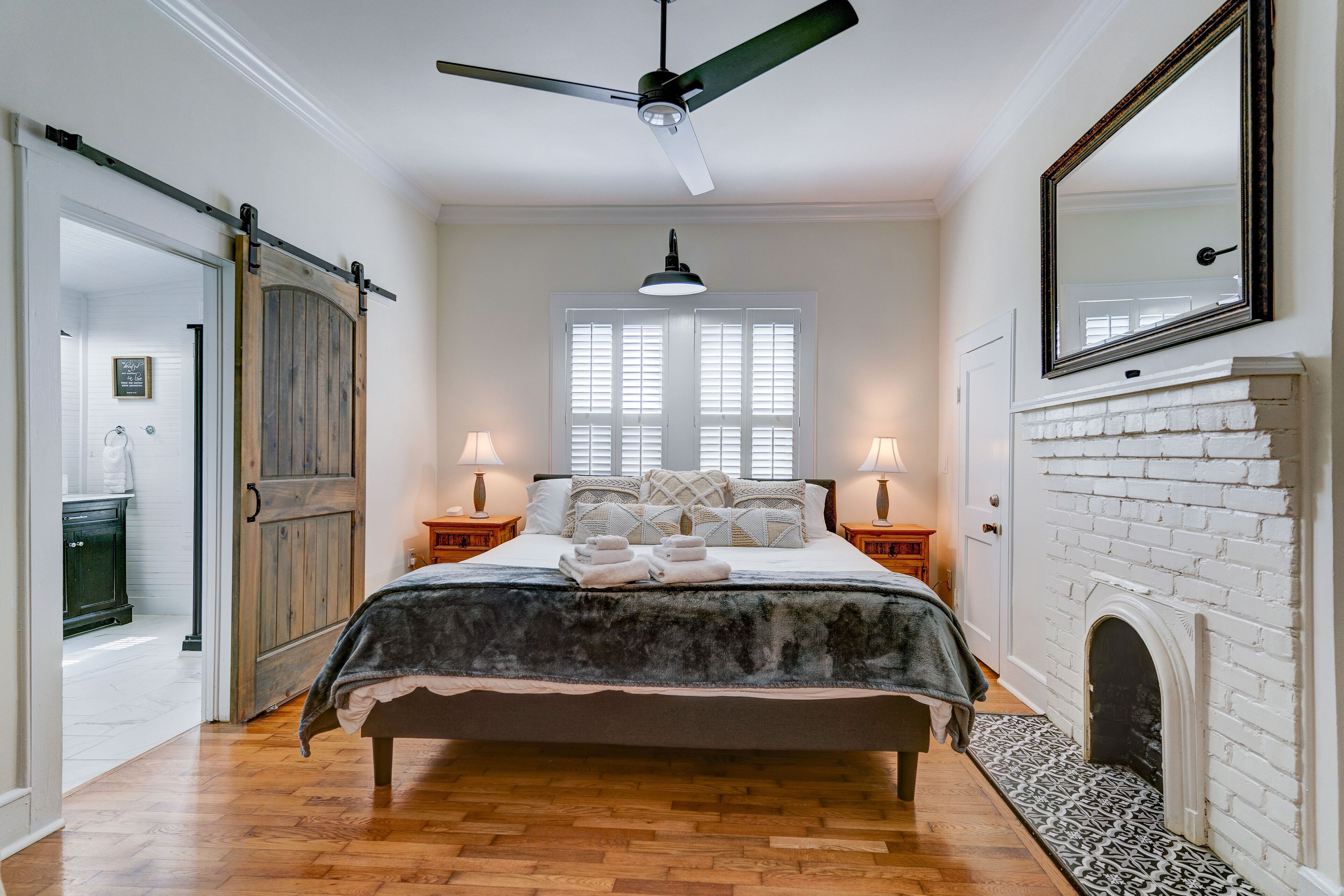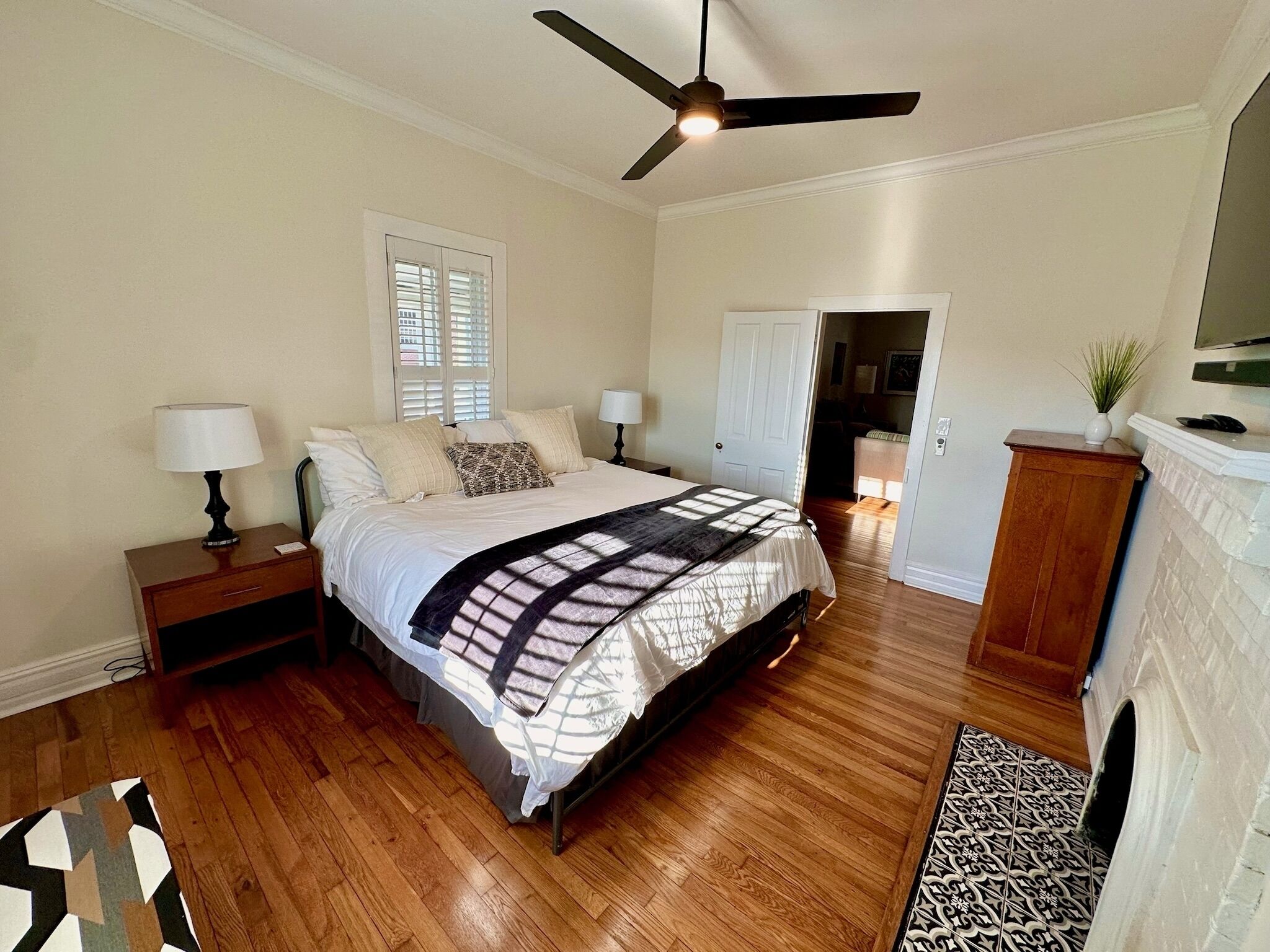 1) Main level primary bedroom : King bed, TV, primary bathroom and walk in closet attached.