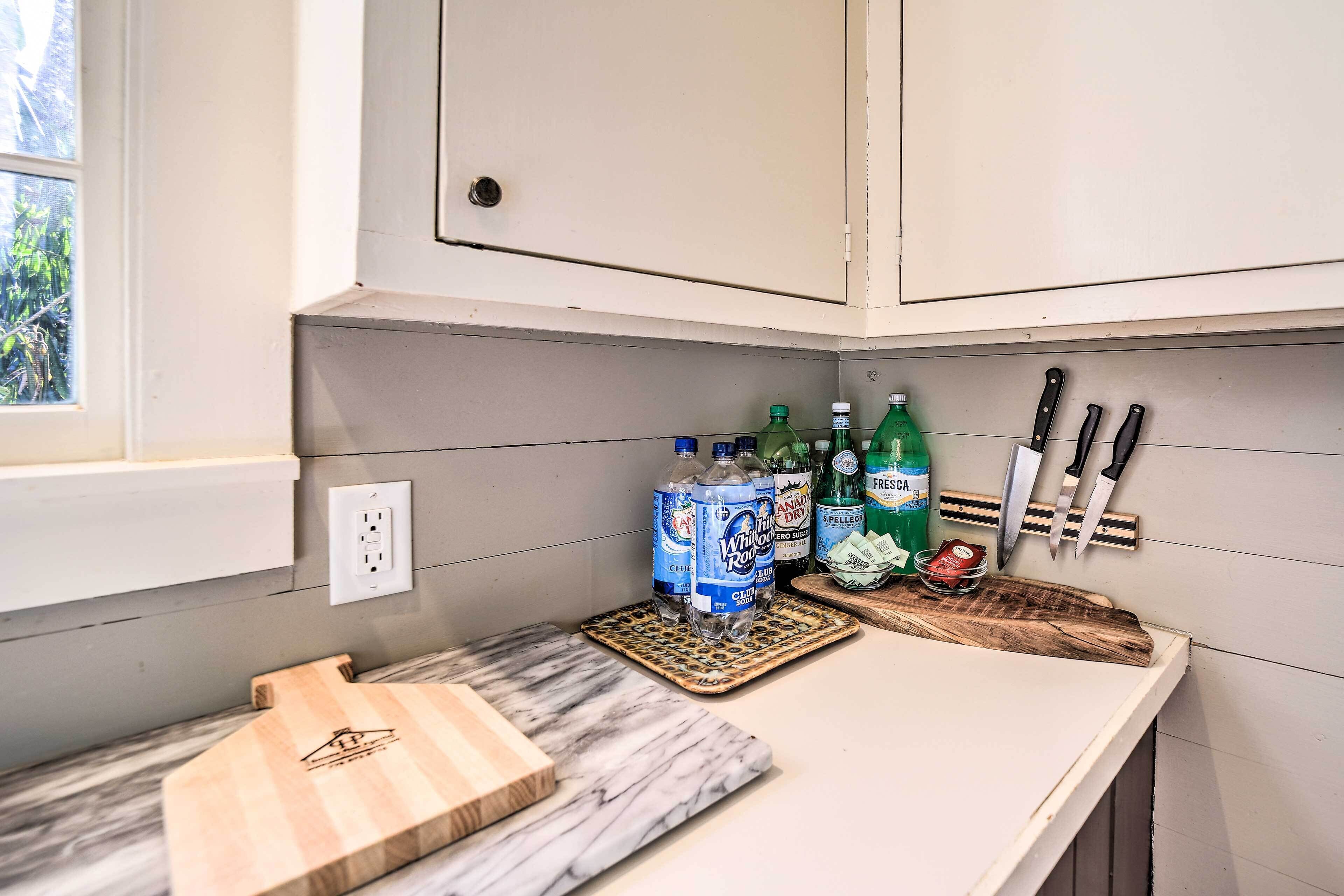 KITCHEN: Fully equipped, cooking basics & spices, dual drip & Keurig coffee maker, tea, coffee, wine, toaster, knife set, dishware & flatware