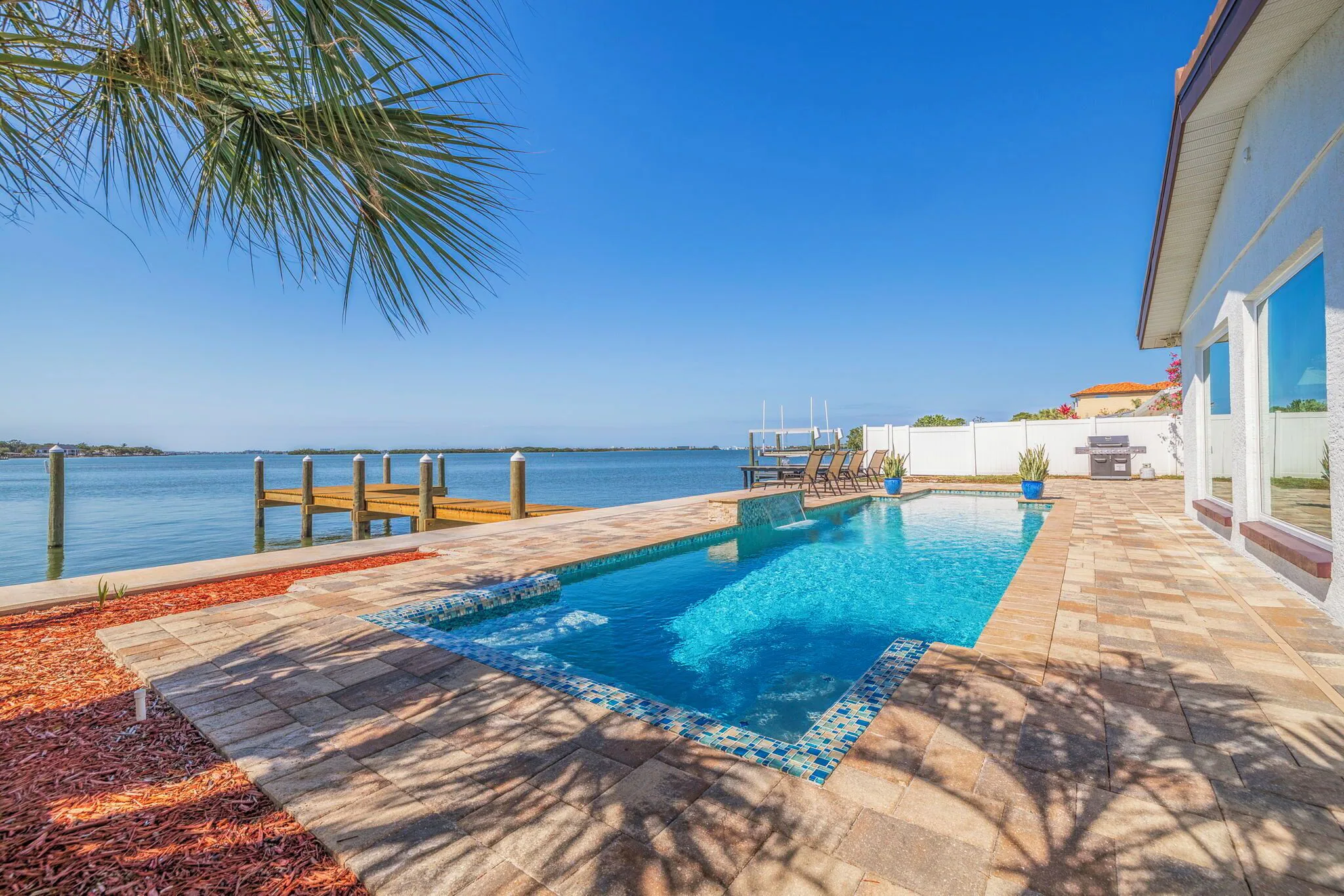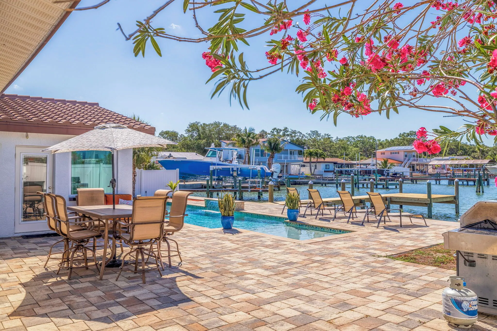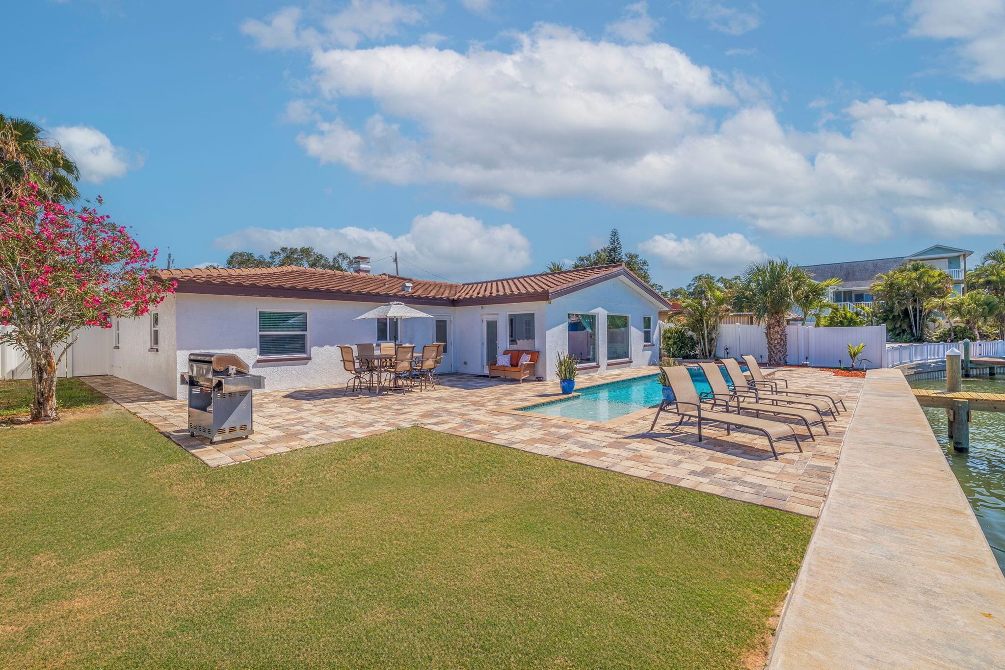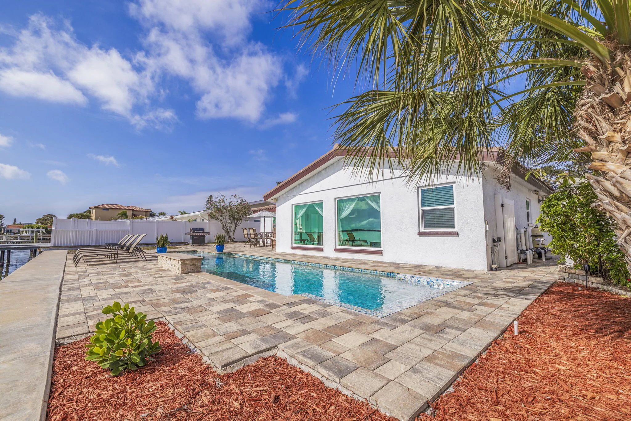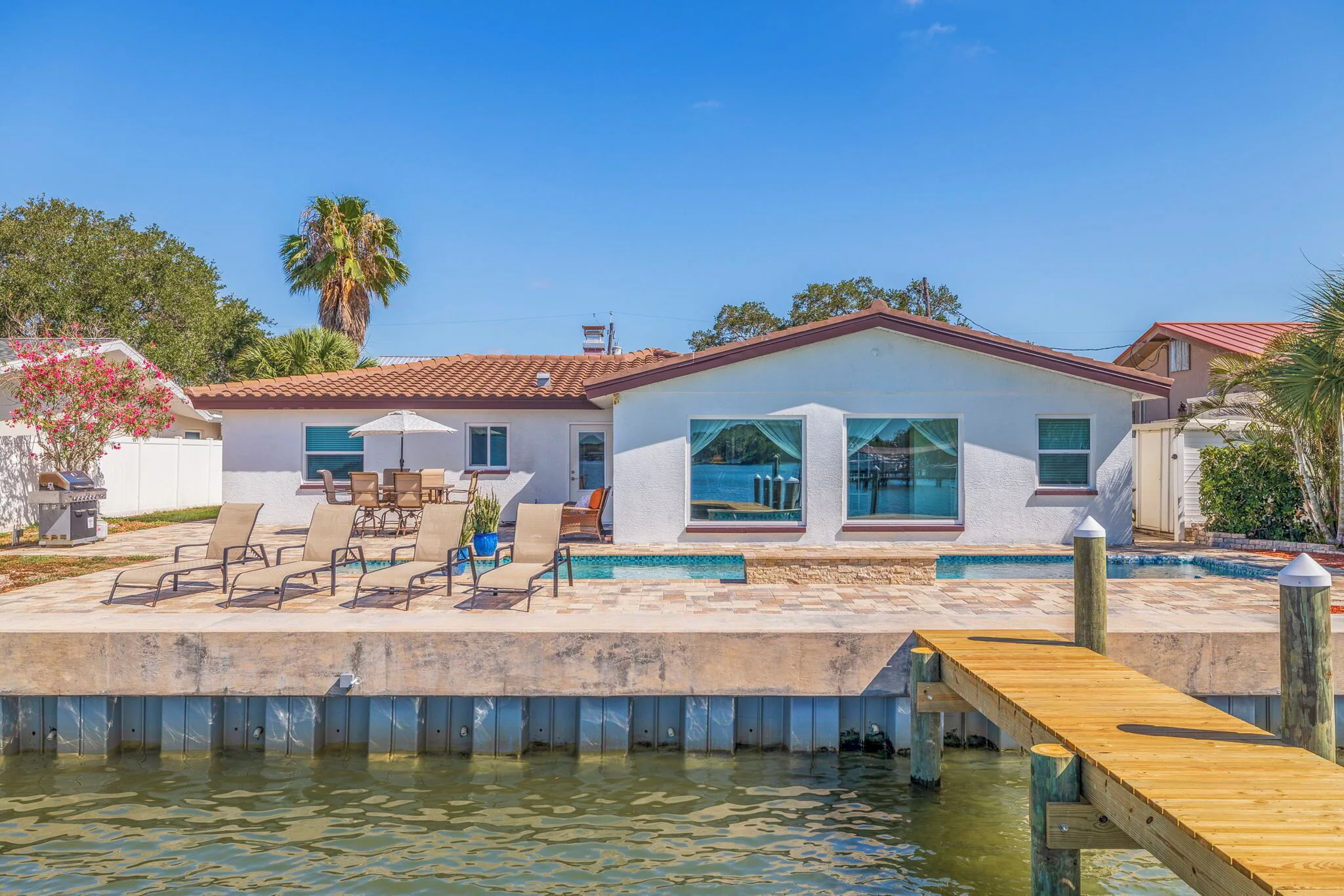 Step out into the backyard oasis in the morning, afternoon or the end of the day, unwind and breathe in the lovely outdoor living space, beautiful pool, bathe in the sun loungers, dine at the six top outdoor table, sitting chairs , umbrella, outdoor shower, large gas grill, a kayak is also offered for guests to enjoy, step on the dock, watch the Dolphins, Manatees and boats as they go by, bring your fishing rods for a fresh catch of the day, sink in those red sunsets ,( it's so cool to take a look at the Johns Pass Bridge when night lights turn on).