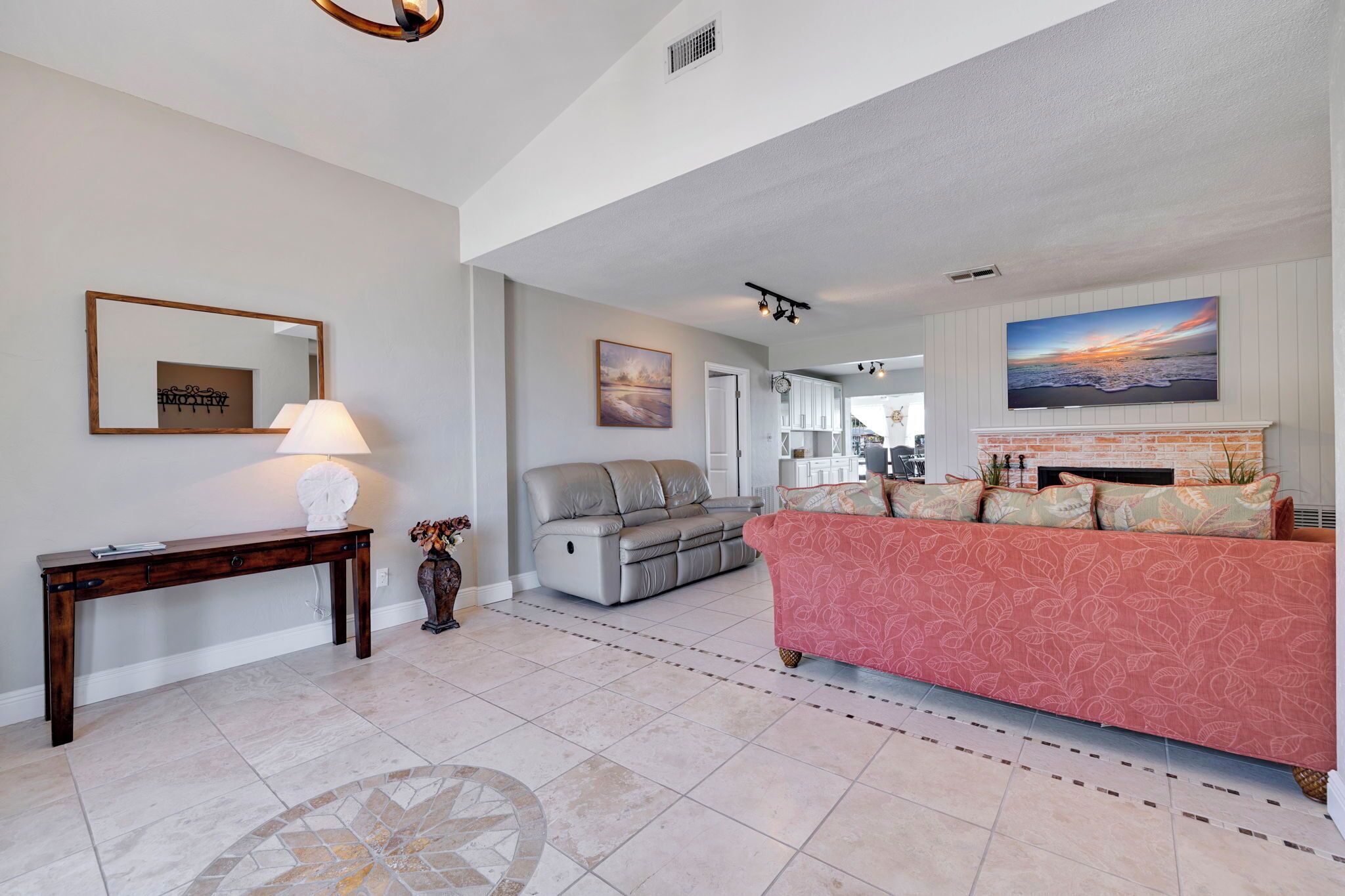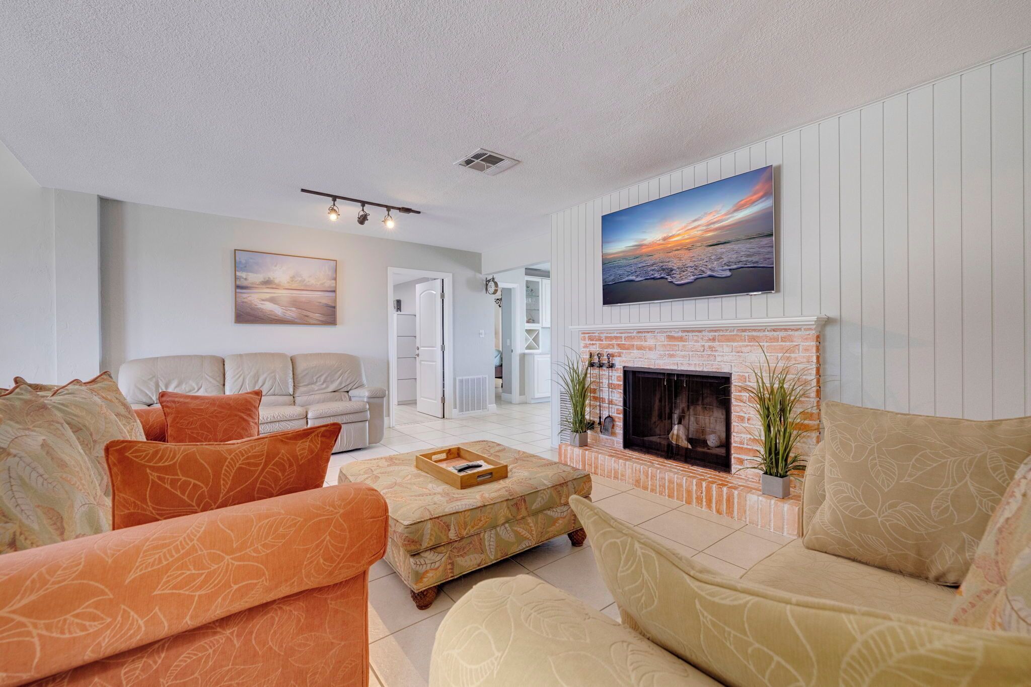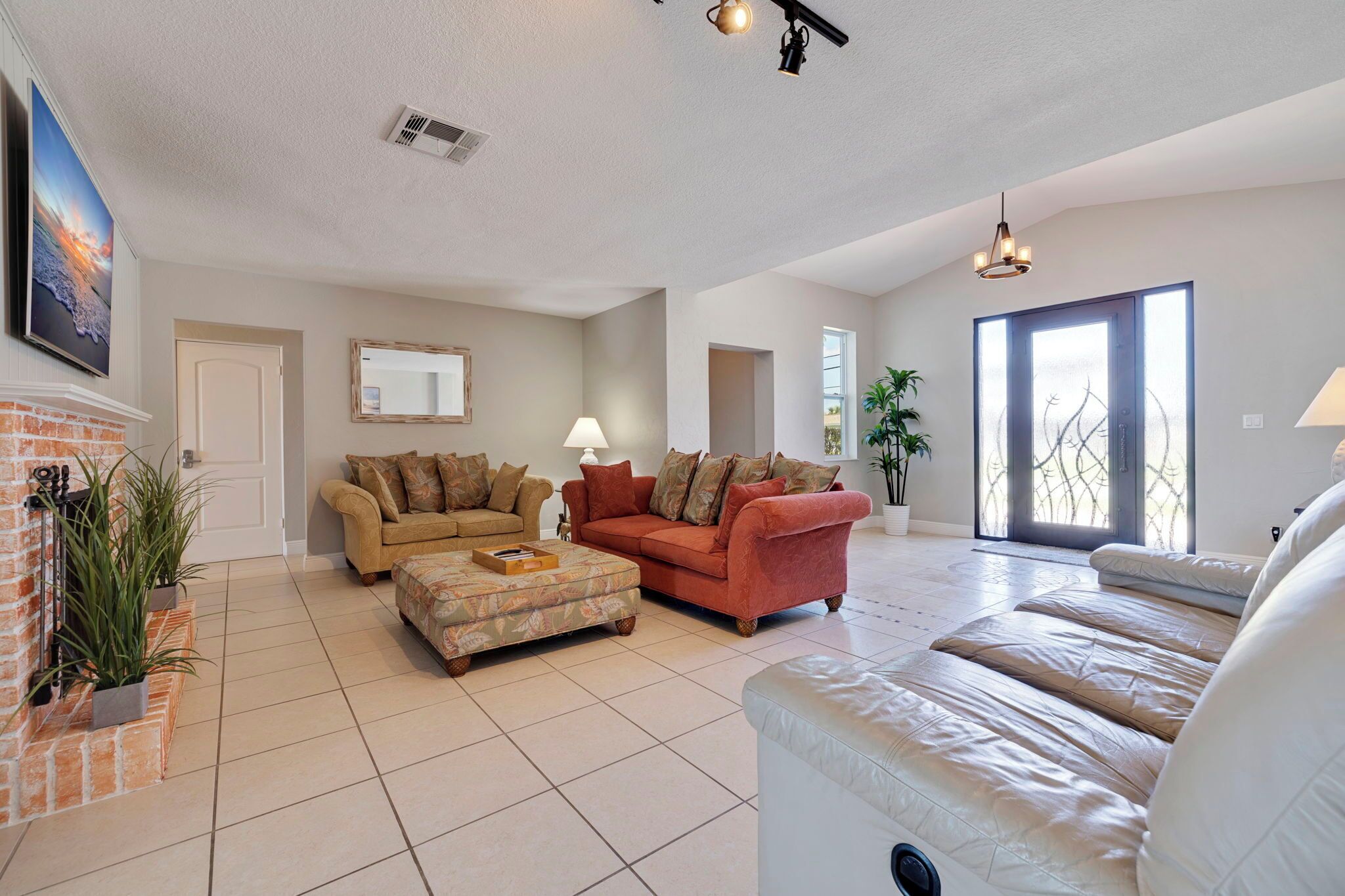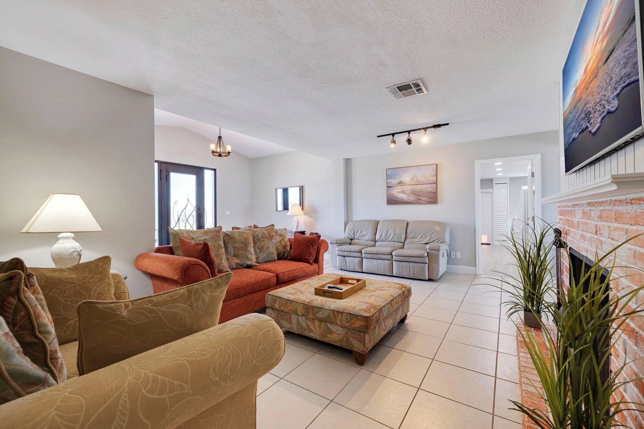 Generous living room includes three couches, a 65 inch smart TV and fireplace.