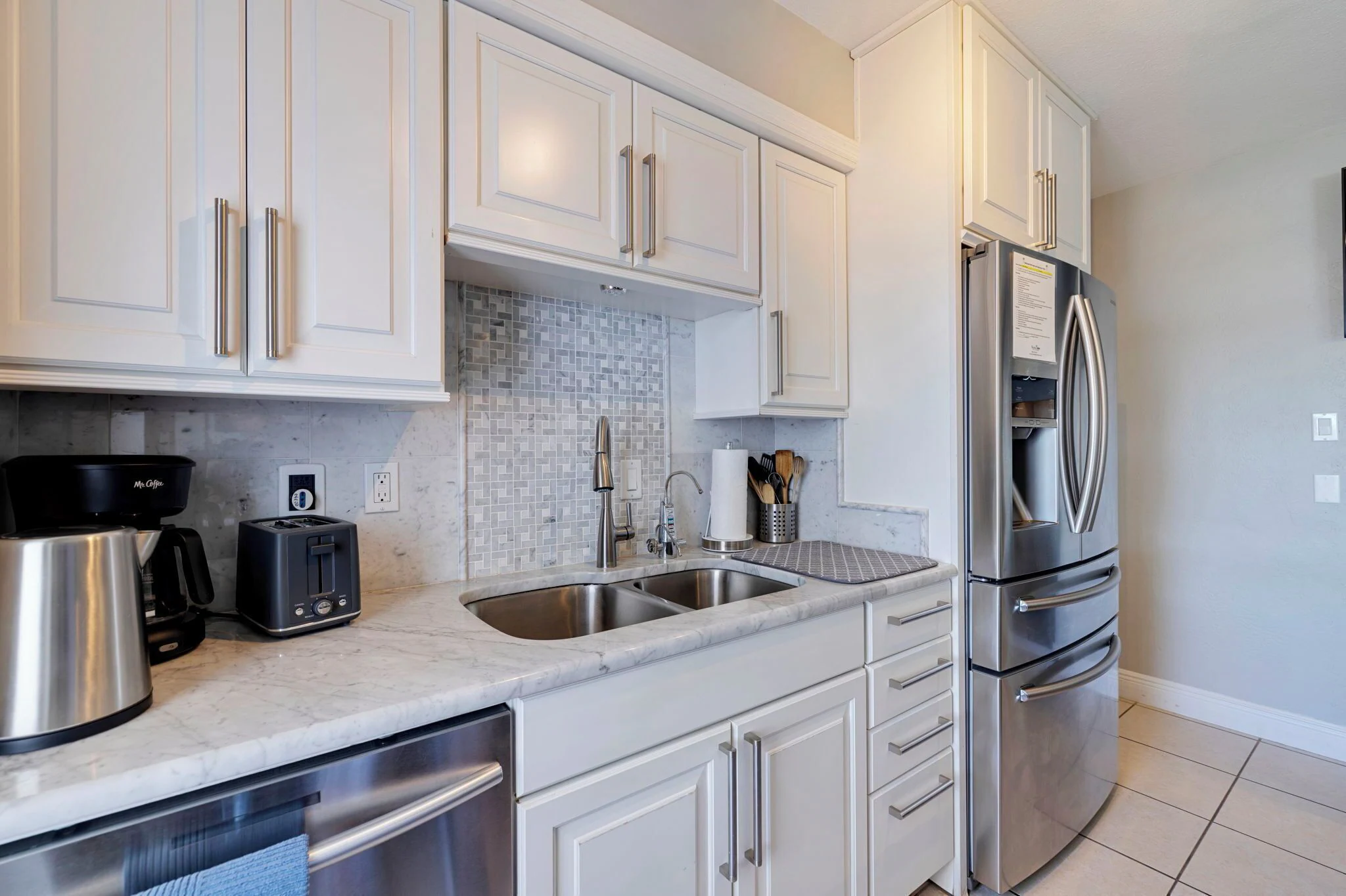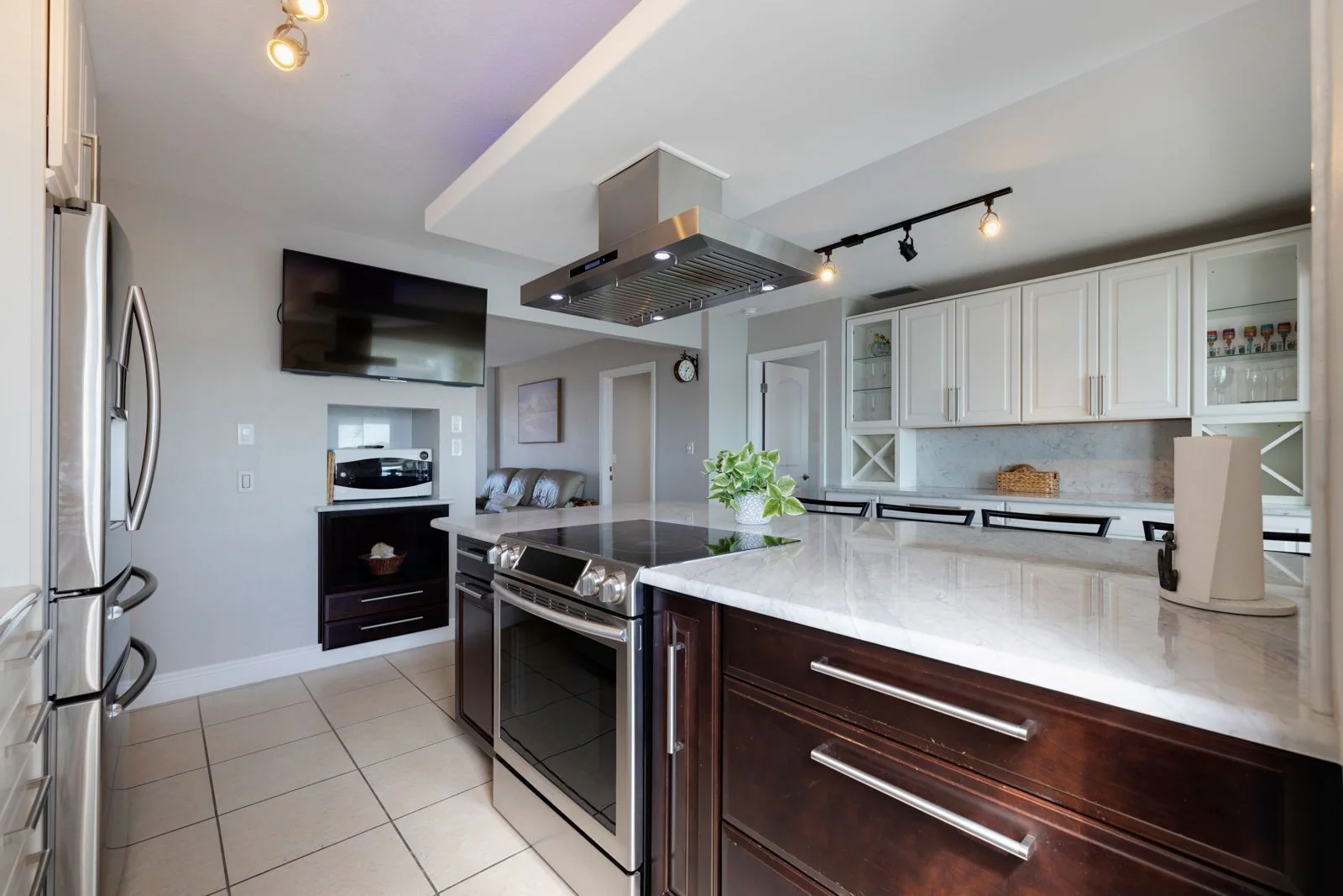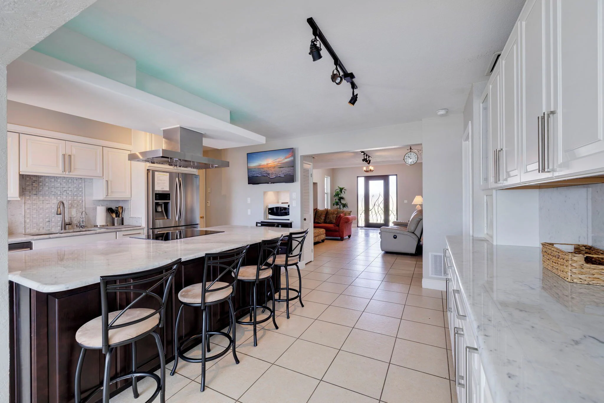 Beautiful fully equipped open concept kitchen with Italian White Carrara Marble countertop big enough you can have breakfast, lunch and dinner ( please don't spill wine or squeeze lemons on it), 6 stools, all major and small appliances, dishwasher, double French door refrigerator, glass top stove & oven,plenty silverware, glasses, pots,pans etc.