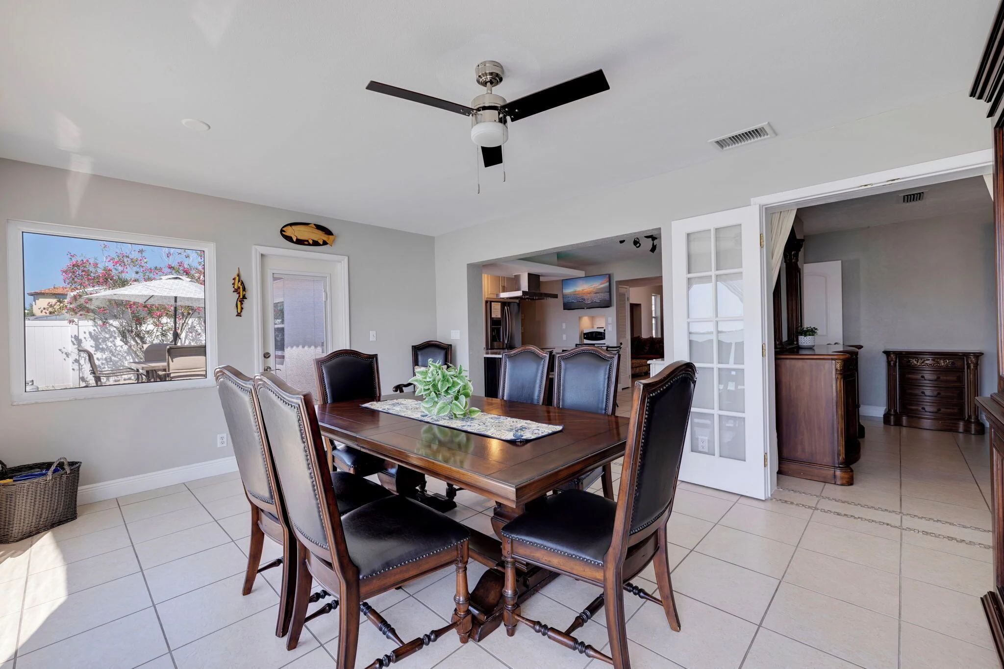 The kitchen leads to the Florida dining room with Tuscany style table, 8 chairs and Credenza .