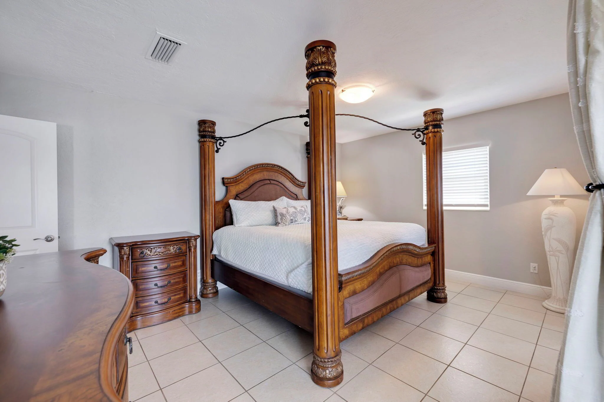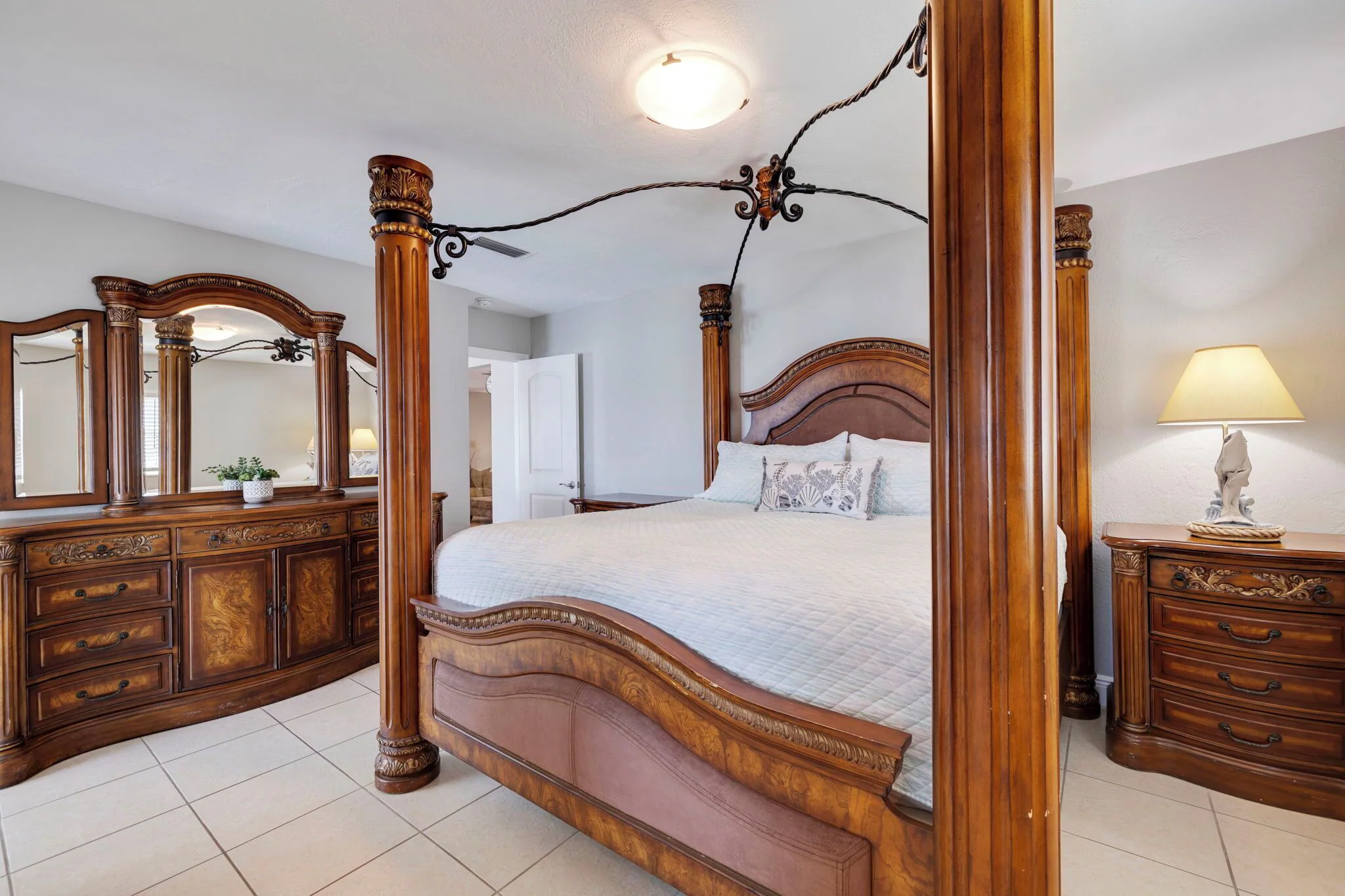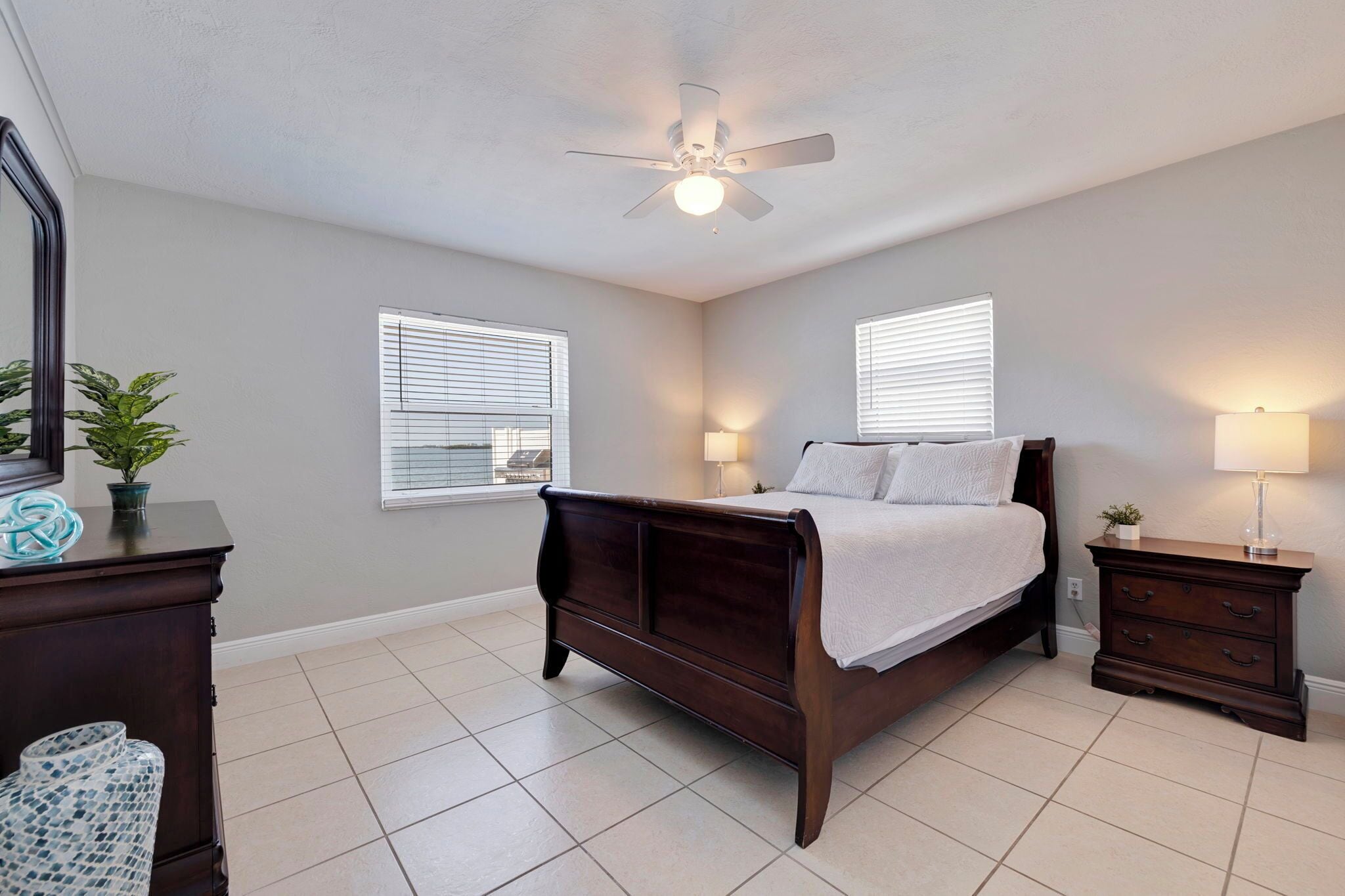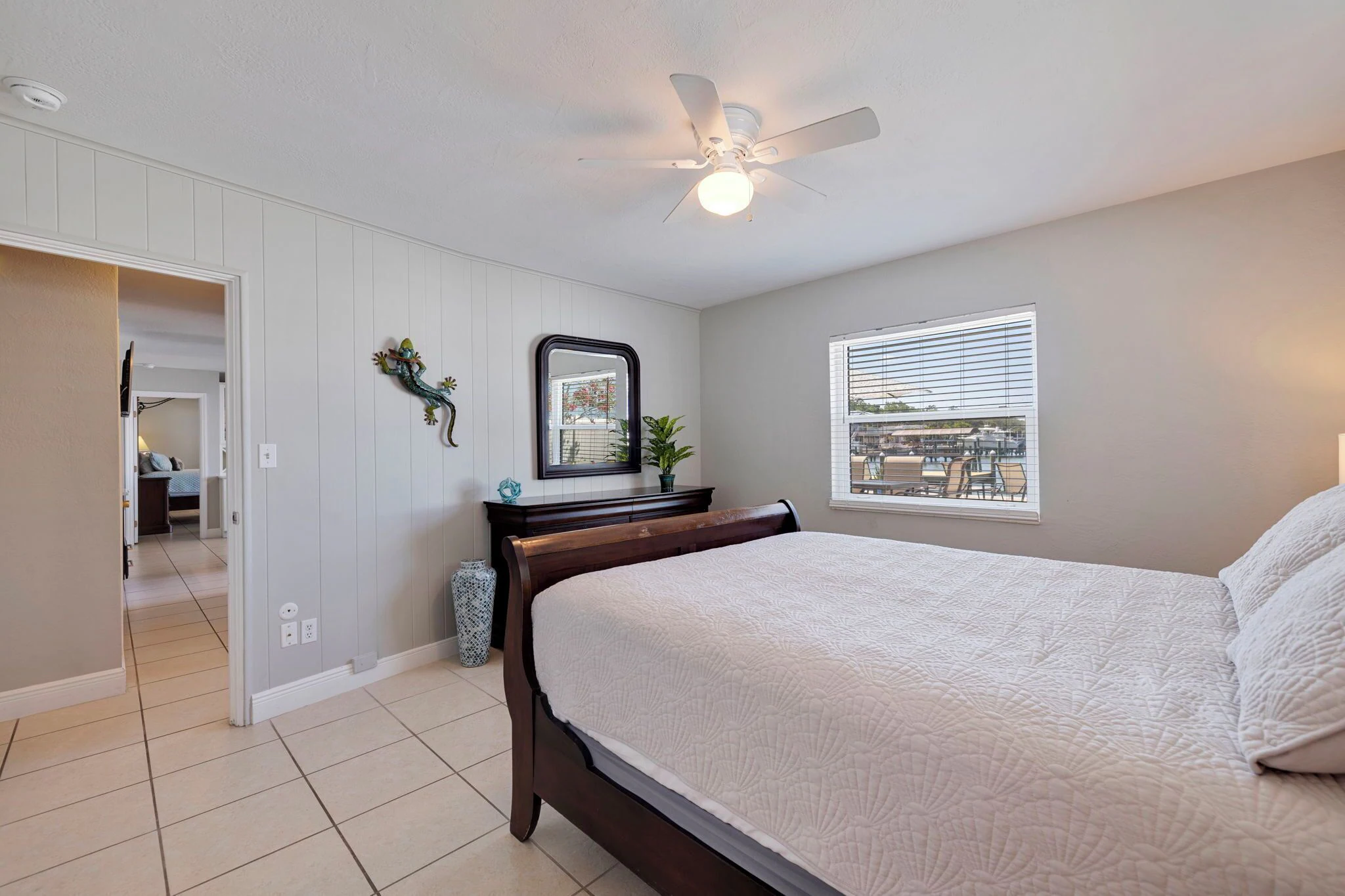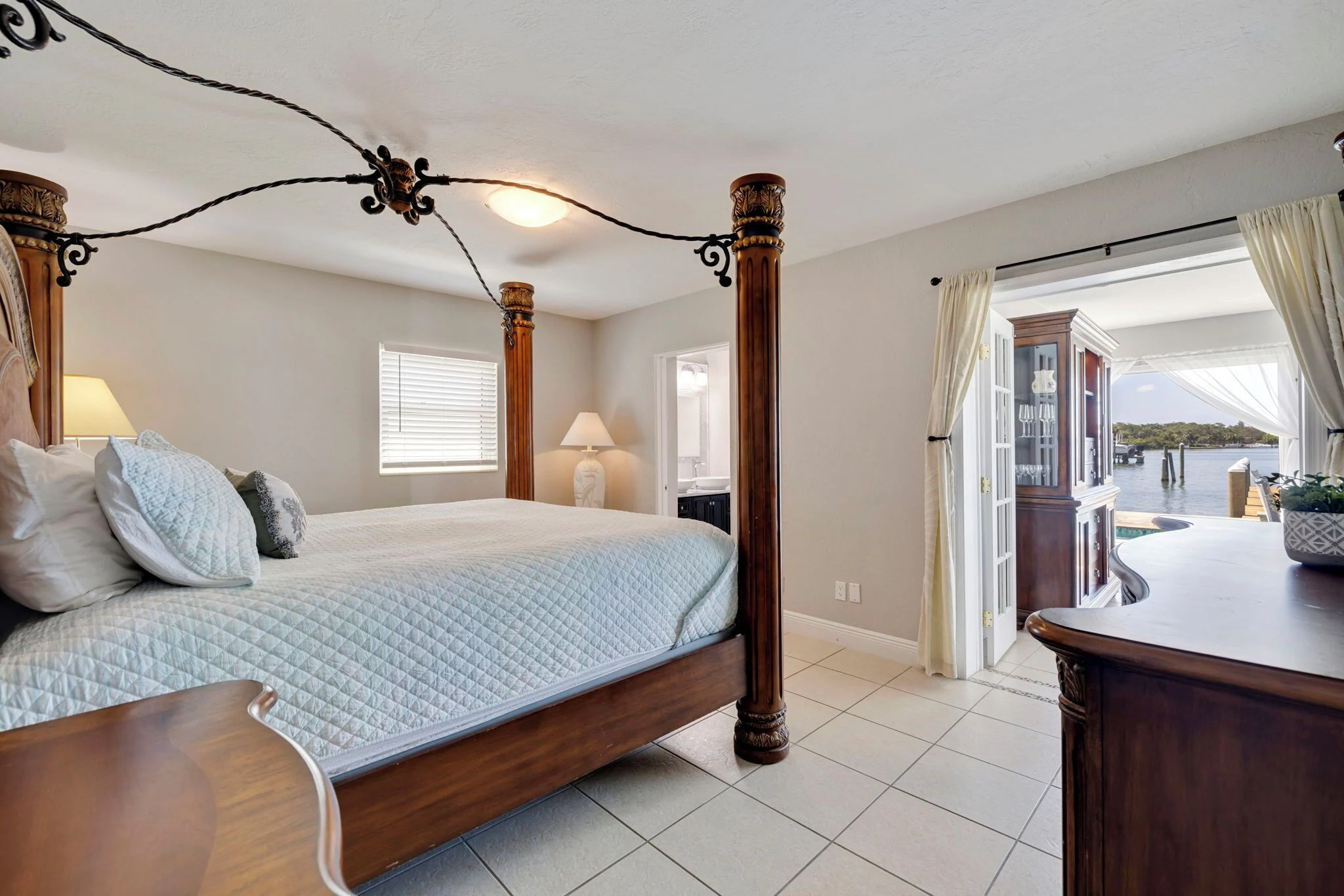 Elegant Master bedroom with a queen size bed, dresser, mirror, night stands, artistic dolphin lamps, offers water views thru double French doors and also gives privacy to our guests.
