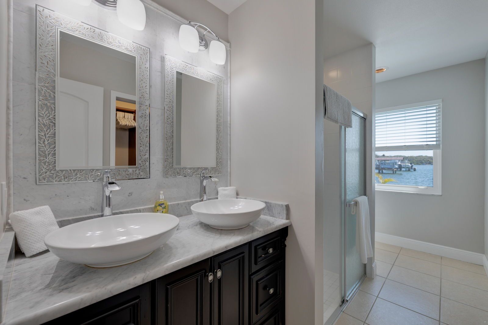 Large walk in shower, double sink vanity, two mirrors and White Carrara marble top.