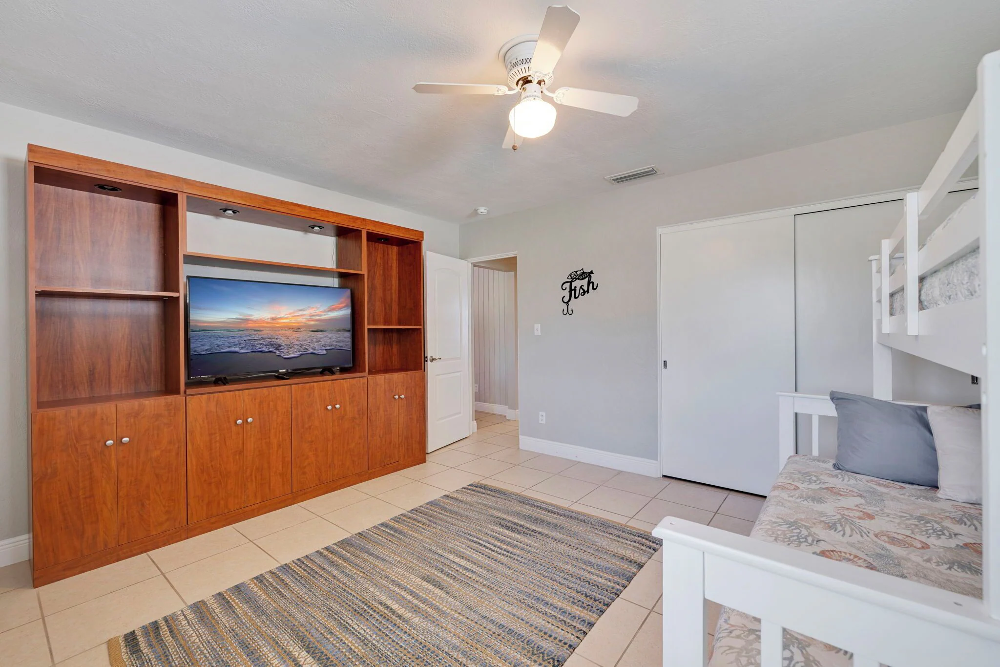 Guest bedroom #2 offers a bunk bed with full size bed lower and twin size bed upper allowing three guests to sleep in this room, ideal for kids or teenagers, a 55 inch smart TV, closet.