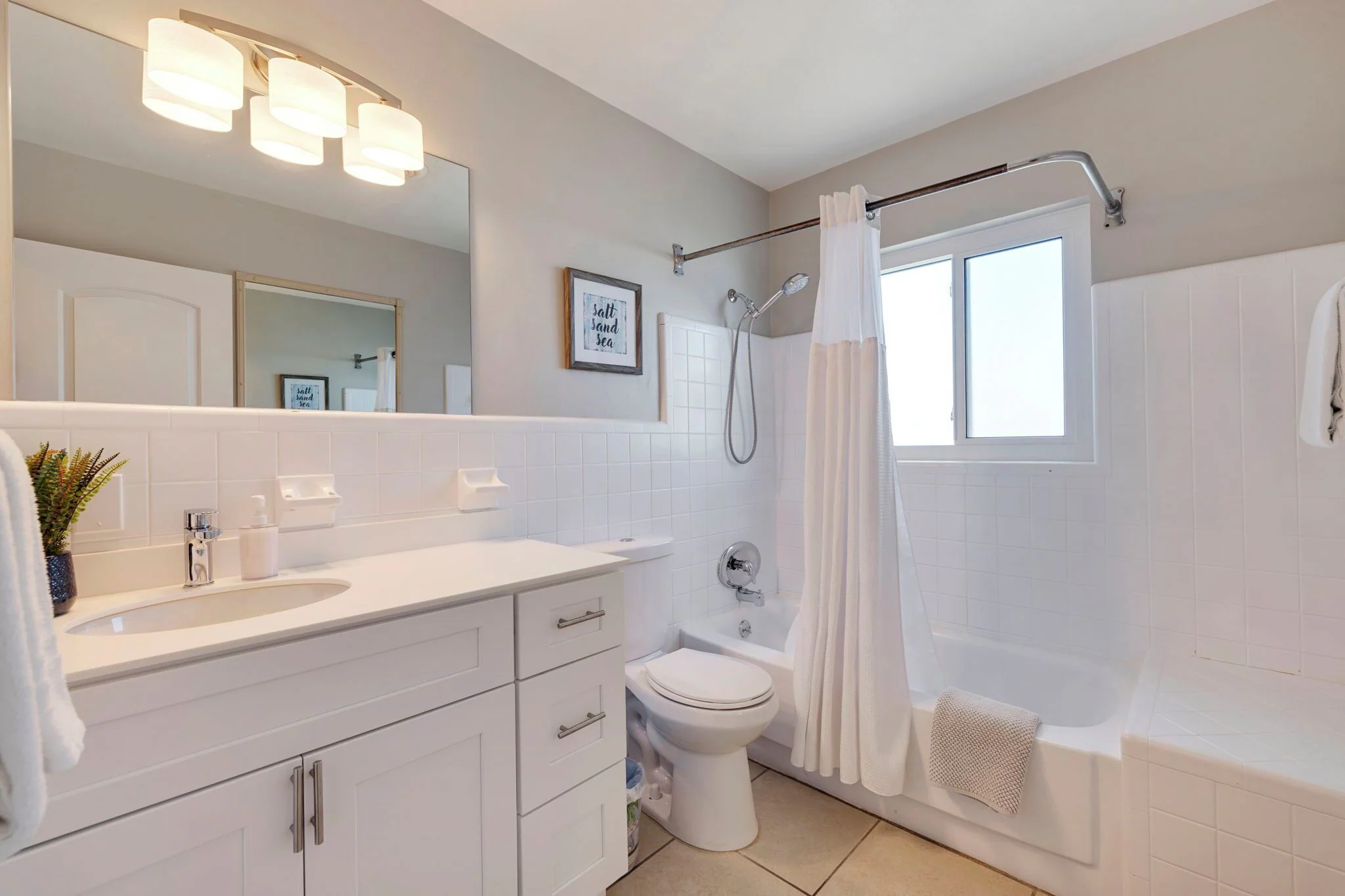Guest bath with new vanity, mirror , bathtub, and picture mirror.