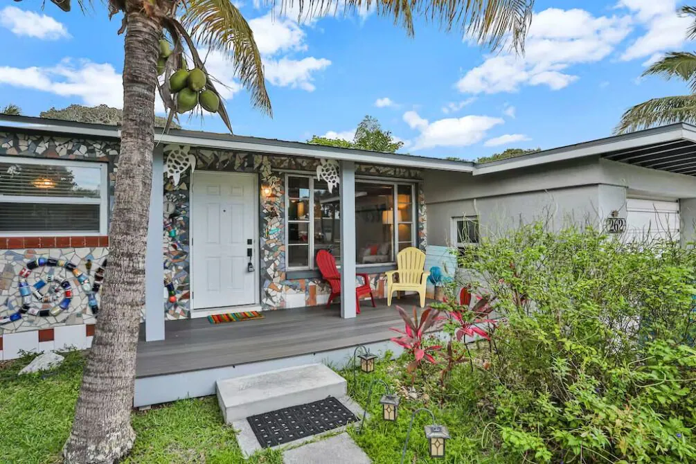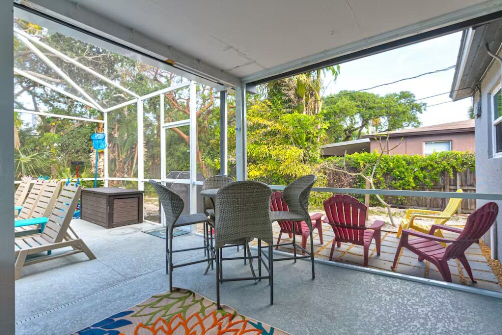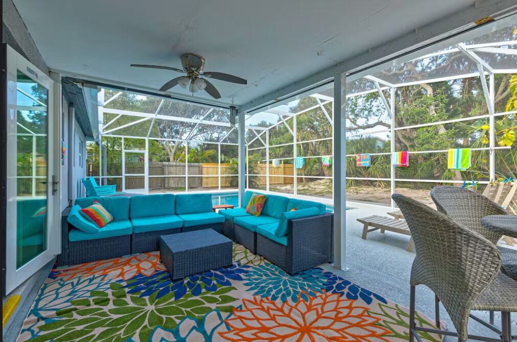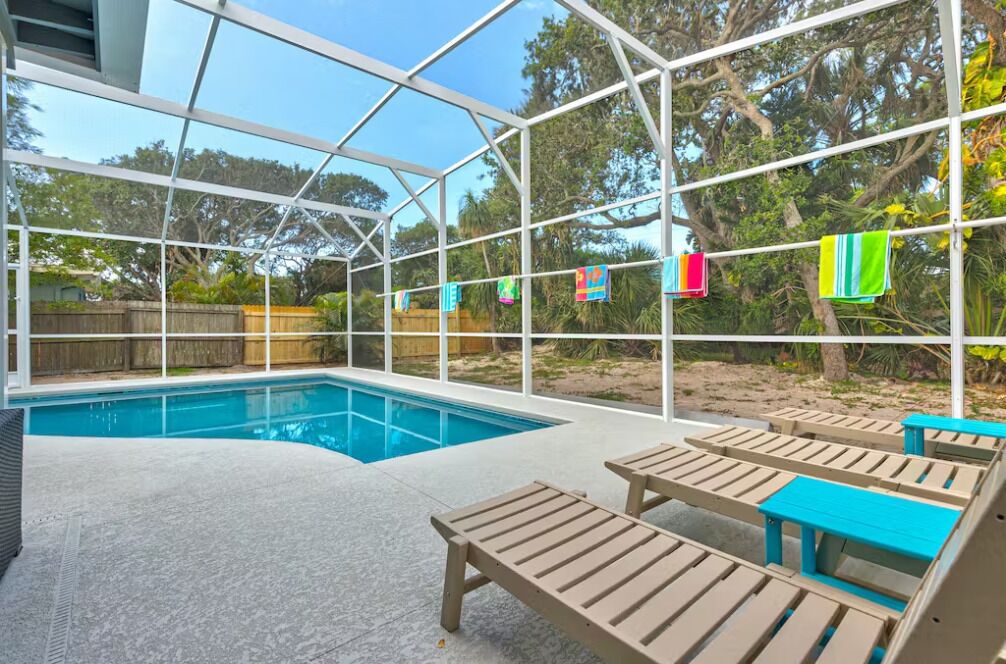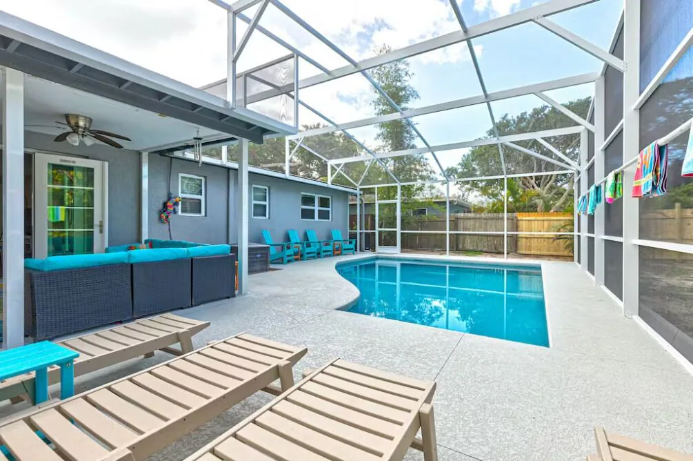 The Mosaic Aardvark beach home is close walking distance to the beach and downtown Cocoa Beach. It even comes with a brand new private heated pool and pool cage with plenty of outdoor seating/lounging for maximum enjoyment! This chic and unique artistically designed home is perfect for any vacation! Enjoy the open floor plan and living space for entertaining and families! With king bedroom master suit, a queen in one guest room, and a double and queen w futon in the other to comfortably sleep 9. This property will feel like a dream resort! Also, with close proximity to the Kennedy Space Center, Orlando Theme Parks, Cruise Port, Airports and of course shopping.