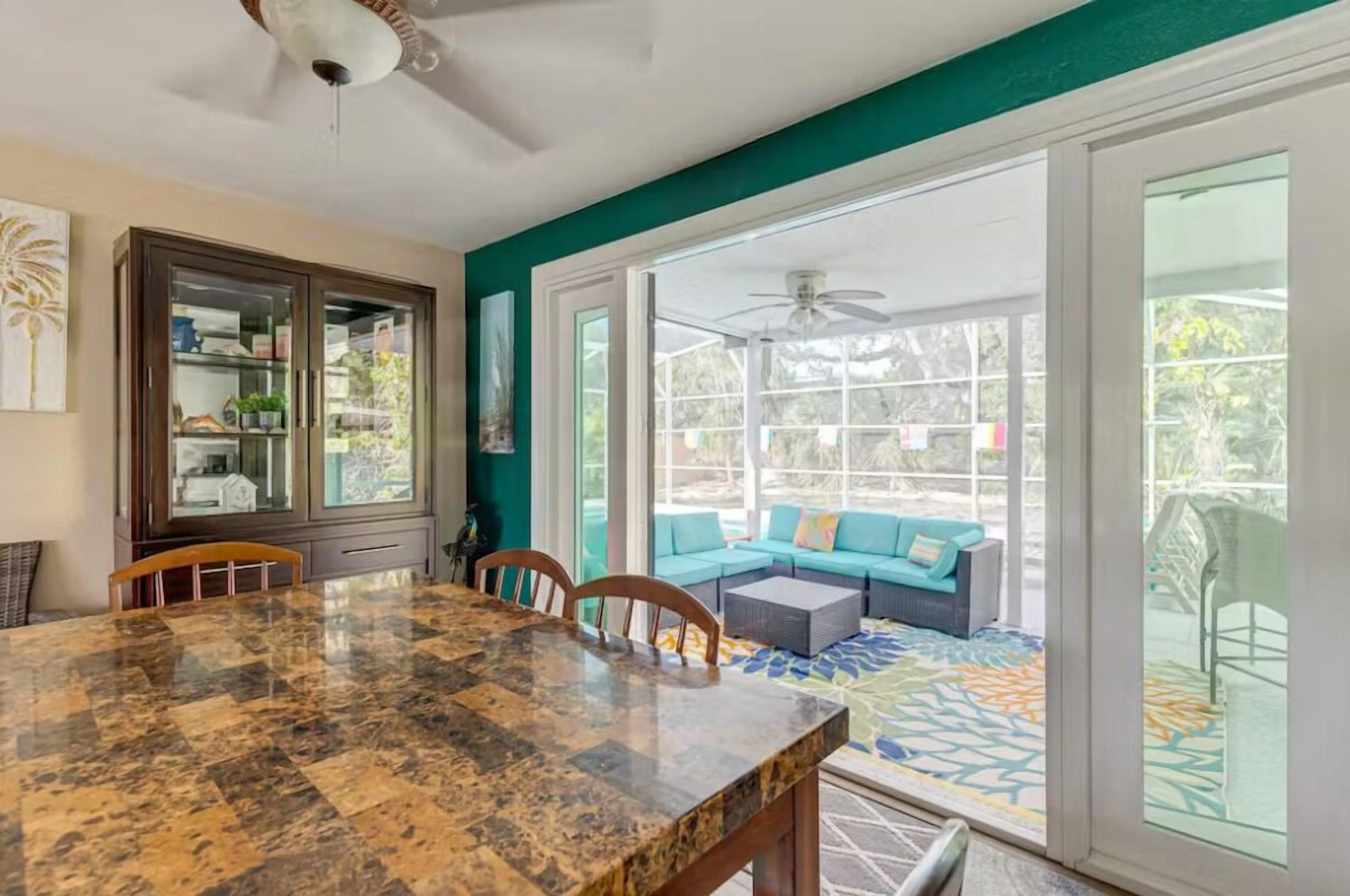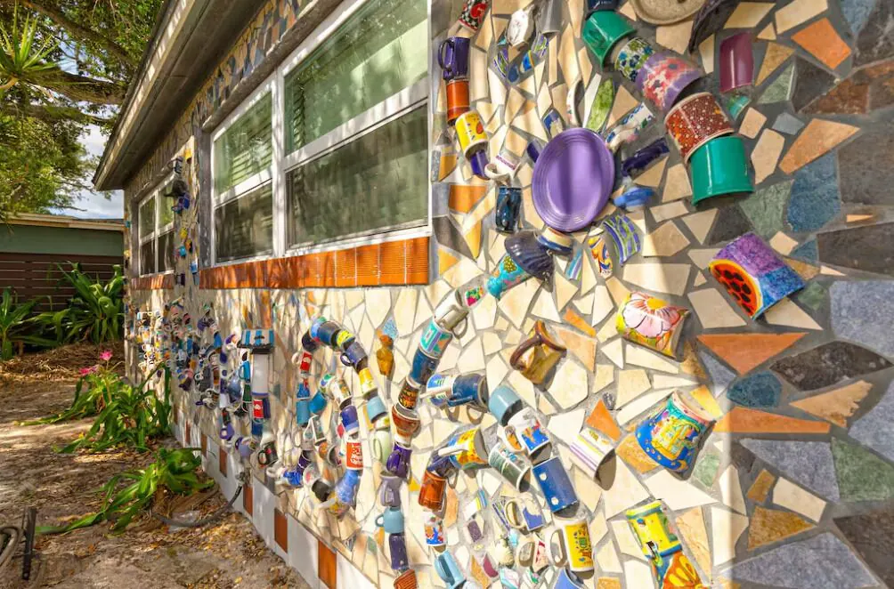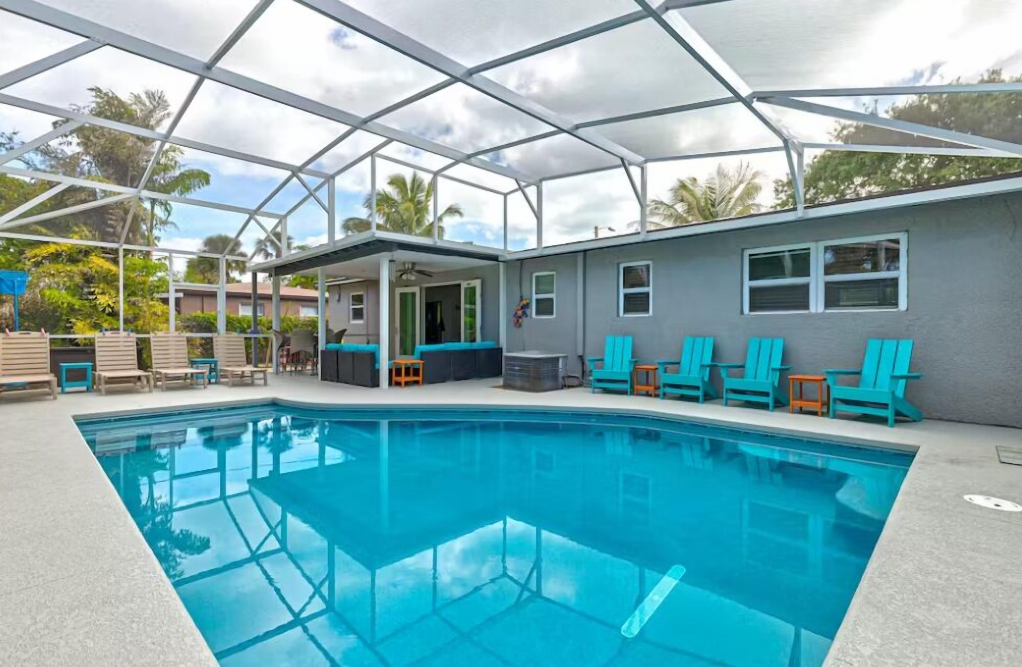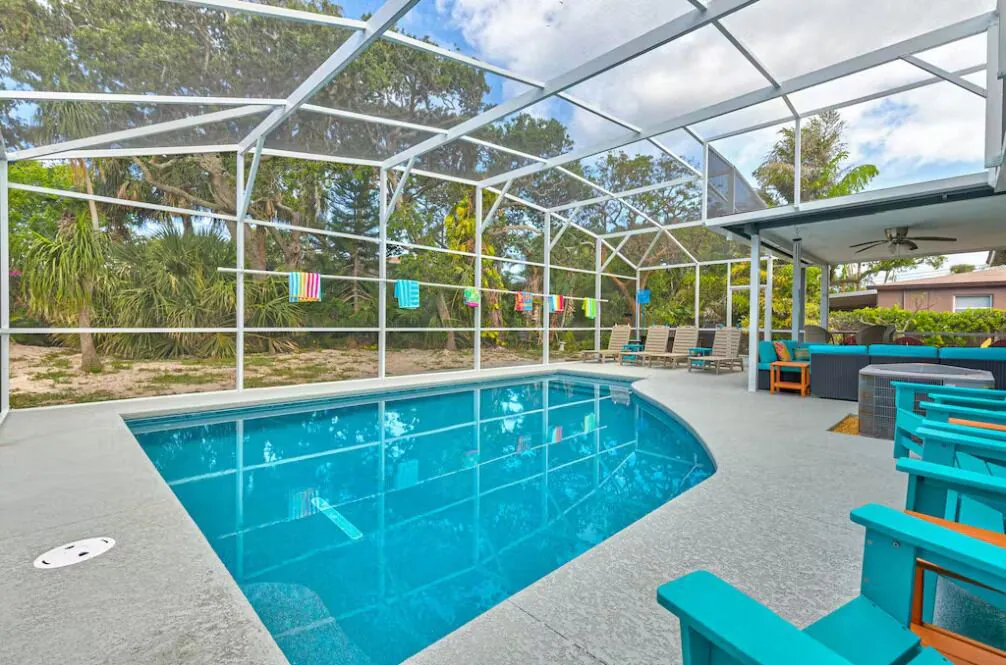 The Mosaic Aardvark beach home is close walking distance to the beach and downtown Cocoa Beach. It even comes with a brand new private heated pool and pool cage with plenty of outdoor seating/lounging for maximum enjoyment! This chic and unique artistically designed home is perfect for any vacation! Enjoy the open floor plan and living space for entertaining and families! With king bedroom master suit, a queen in one guest room, and a double and queen w futon in the other to comfortably sleep 9. This property will feel like a dream resort! Also, with close proximity to the Kennedy Space Center, Orlando Theme Parks, Cruise Port, Airports and of course shopping.