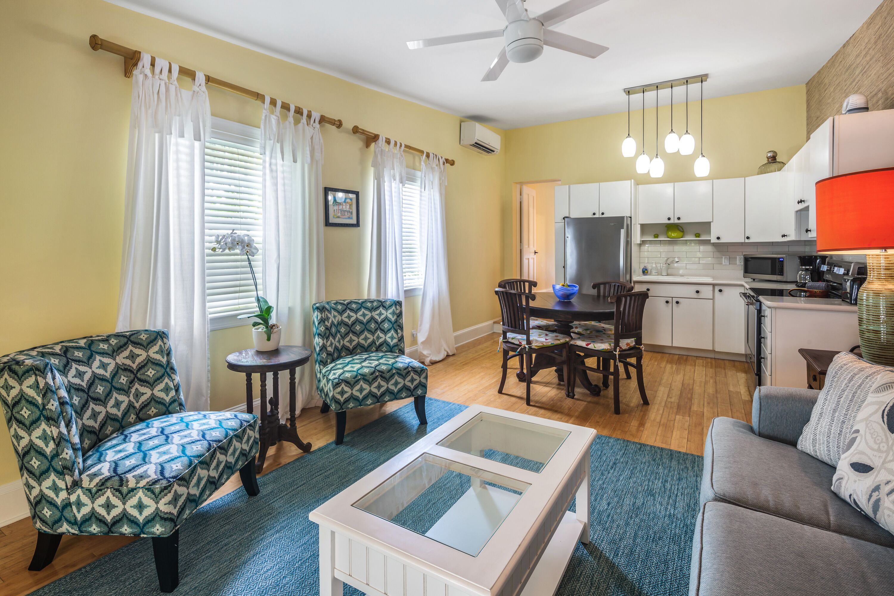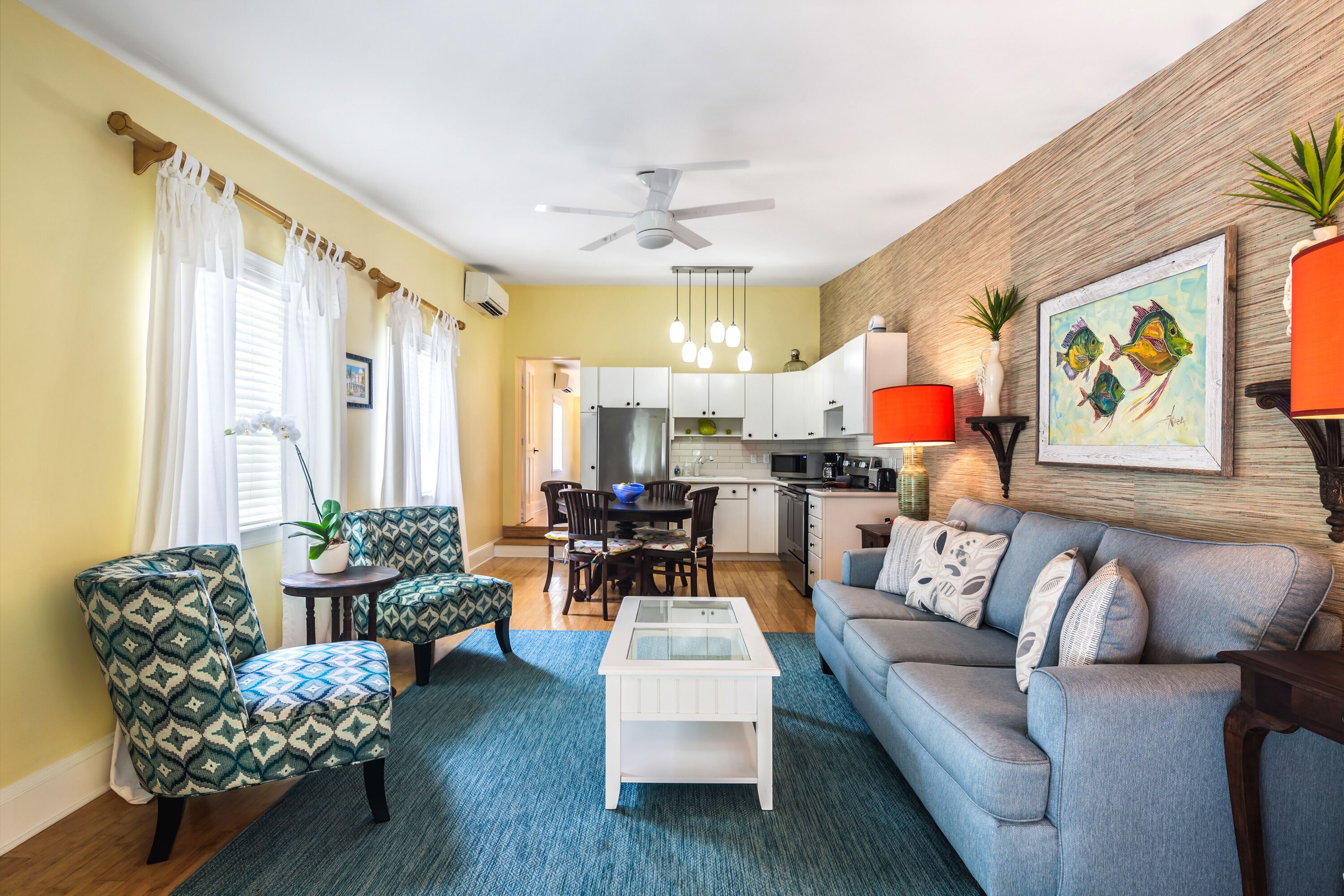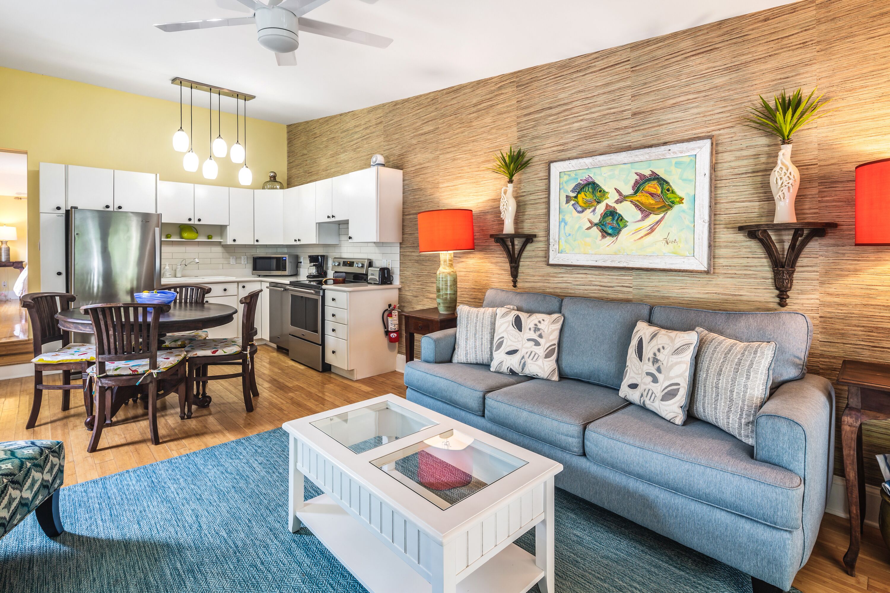 Upon entering your vacation home, you will be delighted by the natural light, hardwood floors, cheerful Key West décor, and the work of local artists. The open concept living room includes pops of color, a flat screen TV, and plenty of seating for you and your guests. A white kitchen with subway tile, stainless steel appliances and an abundance of cabinets is fully equipped and offers all the amenities of home. Pendant lighting and a dining table with seating for four complement the area.