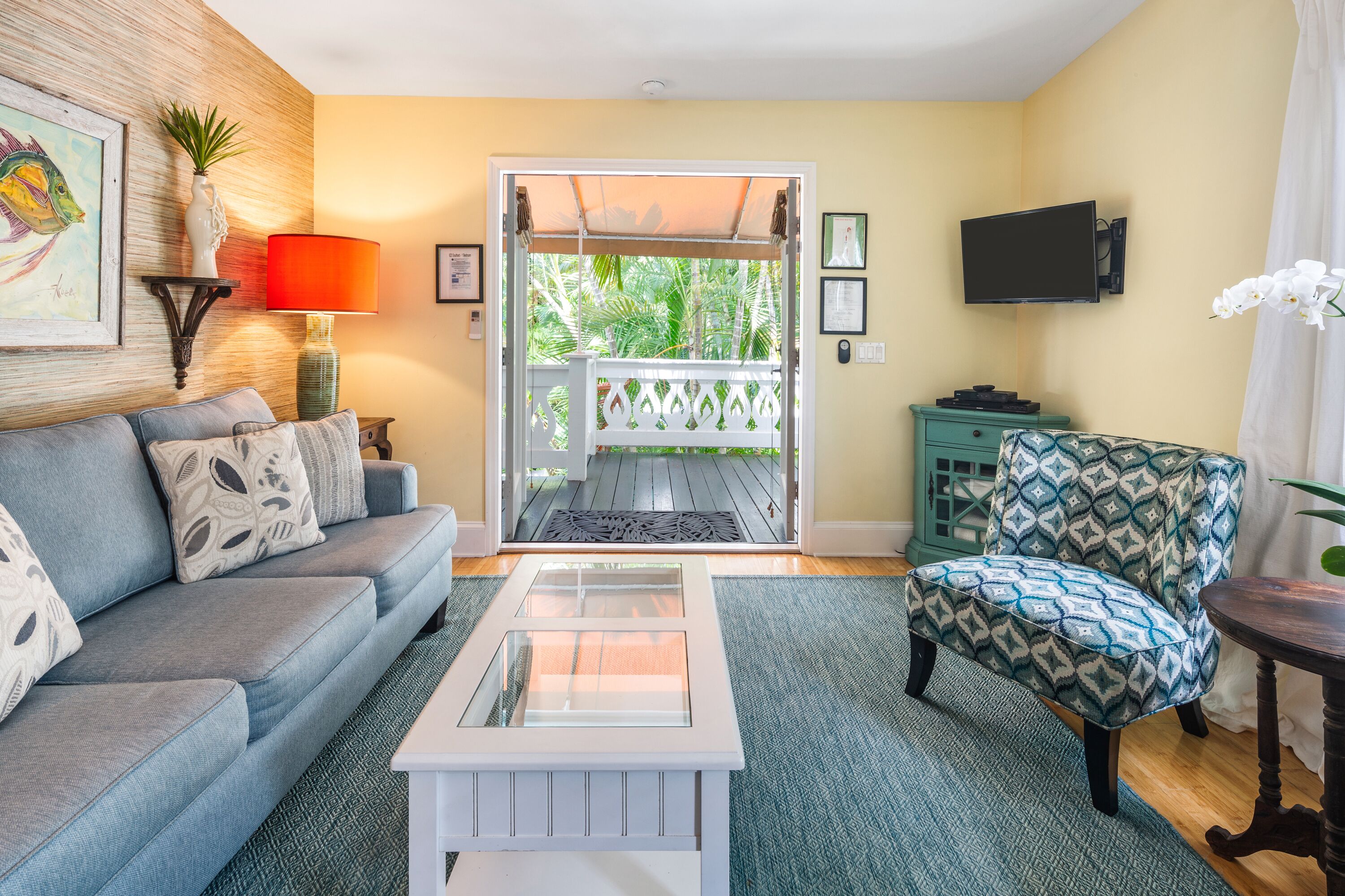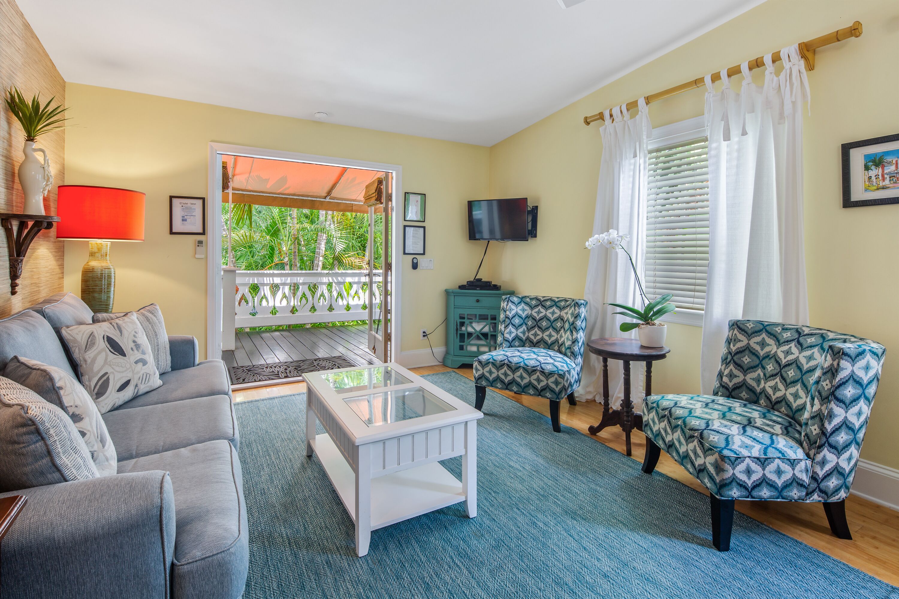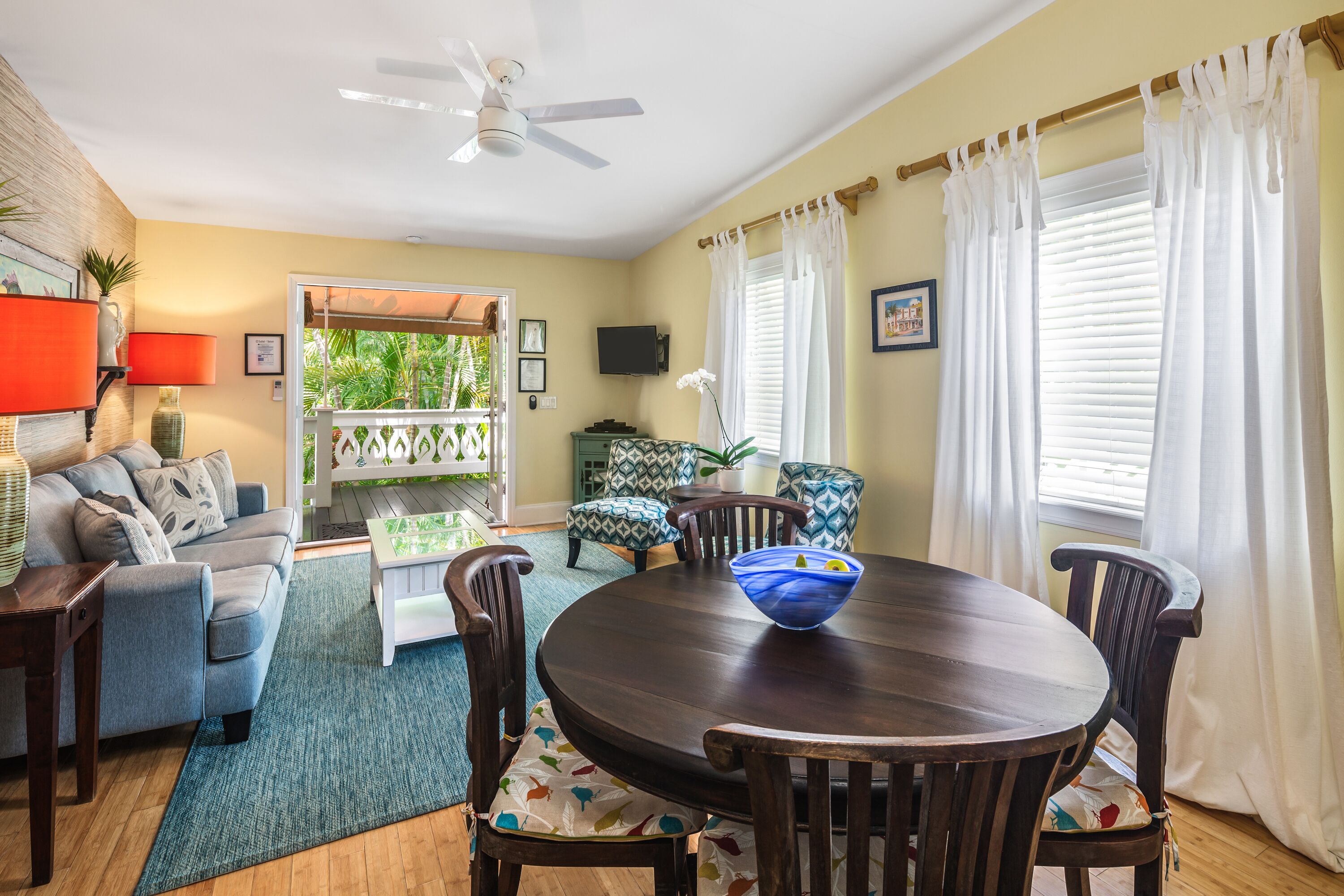 Upon entering your vacation home, you will be delighted by the natural light, hardwood floors, cheerful Key West décor, and the work of local artists. The open concept living room includes pops of color, a flat screen TV, and plenty of seating for you and your guests. A white kitchen with subway tile, stainless steel appliances and an abundance of cabinets is fully equipped and offers all the amenities of home. Pendant lighting and a dining table with seating for four complement the area.