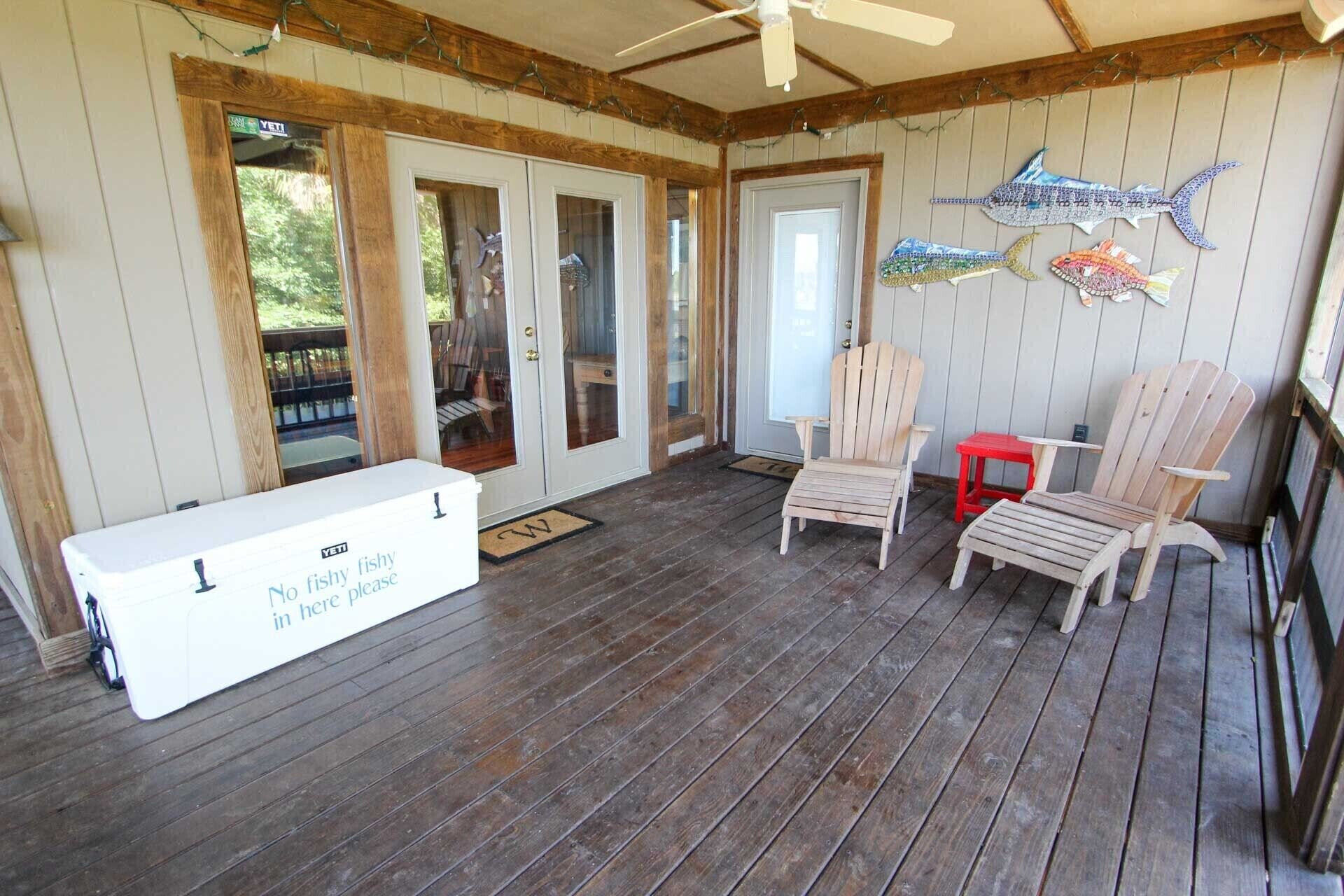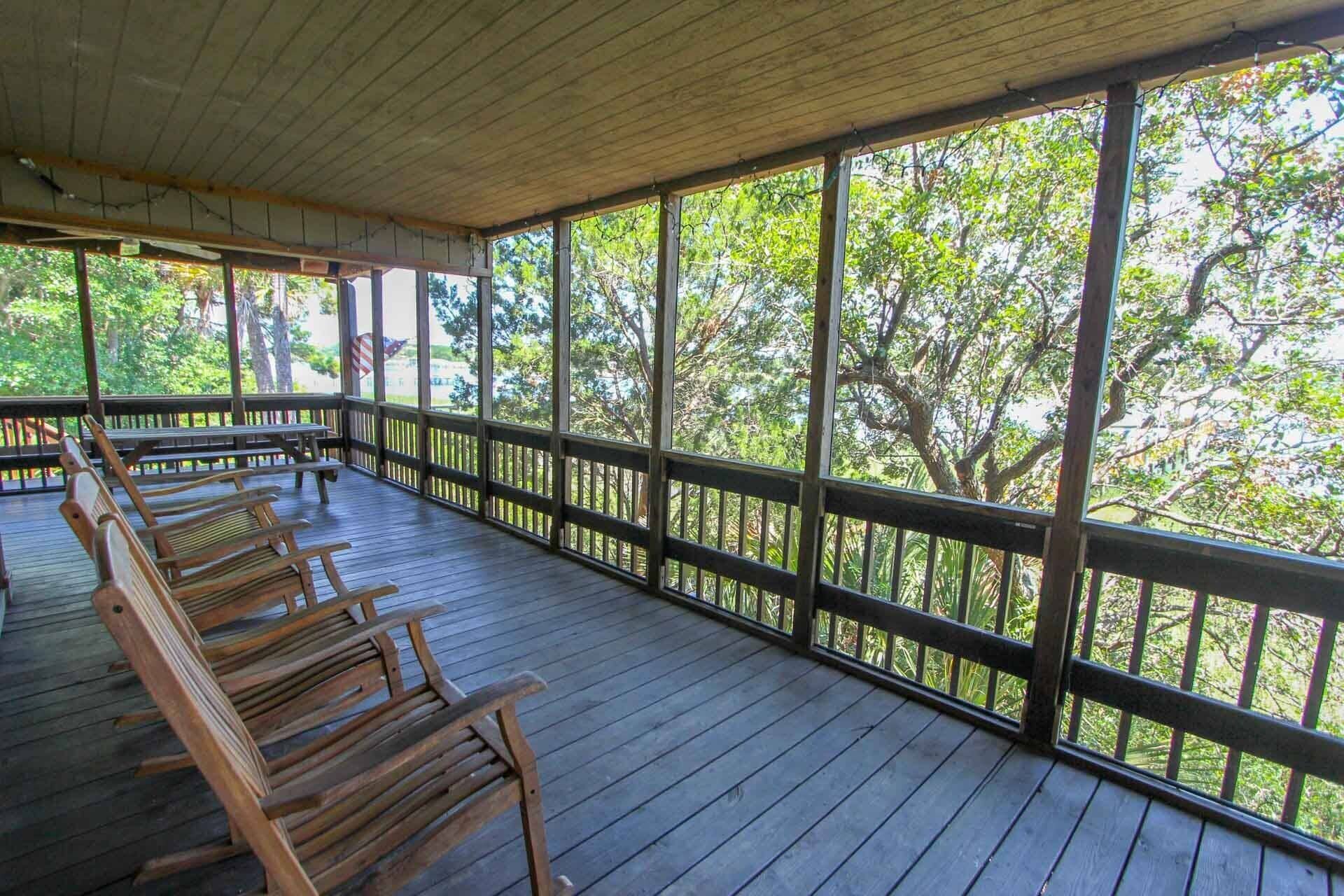 Screened front porch with sound system and picnic table.