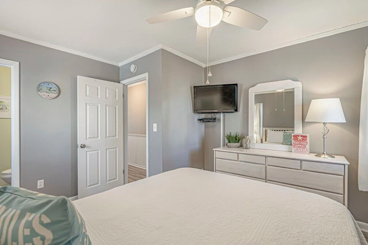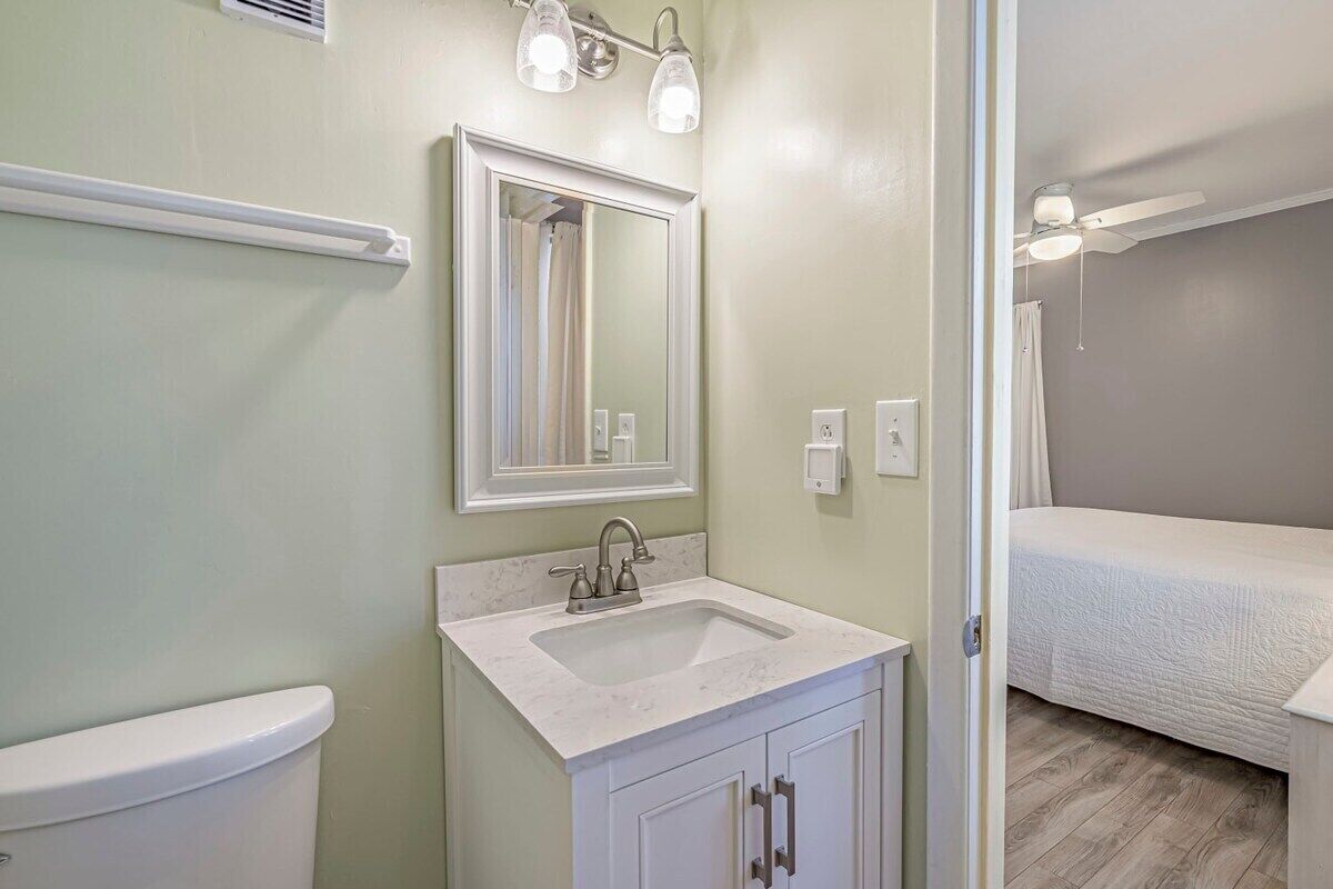 Guest Bedroom 3: Queen bed with attached half-bathroom.