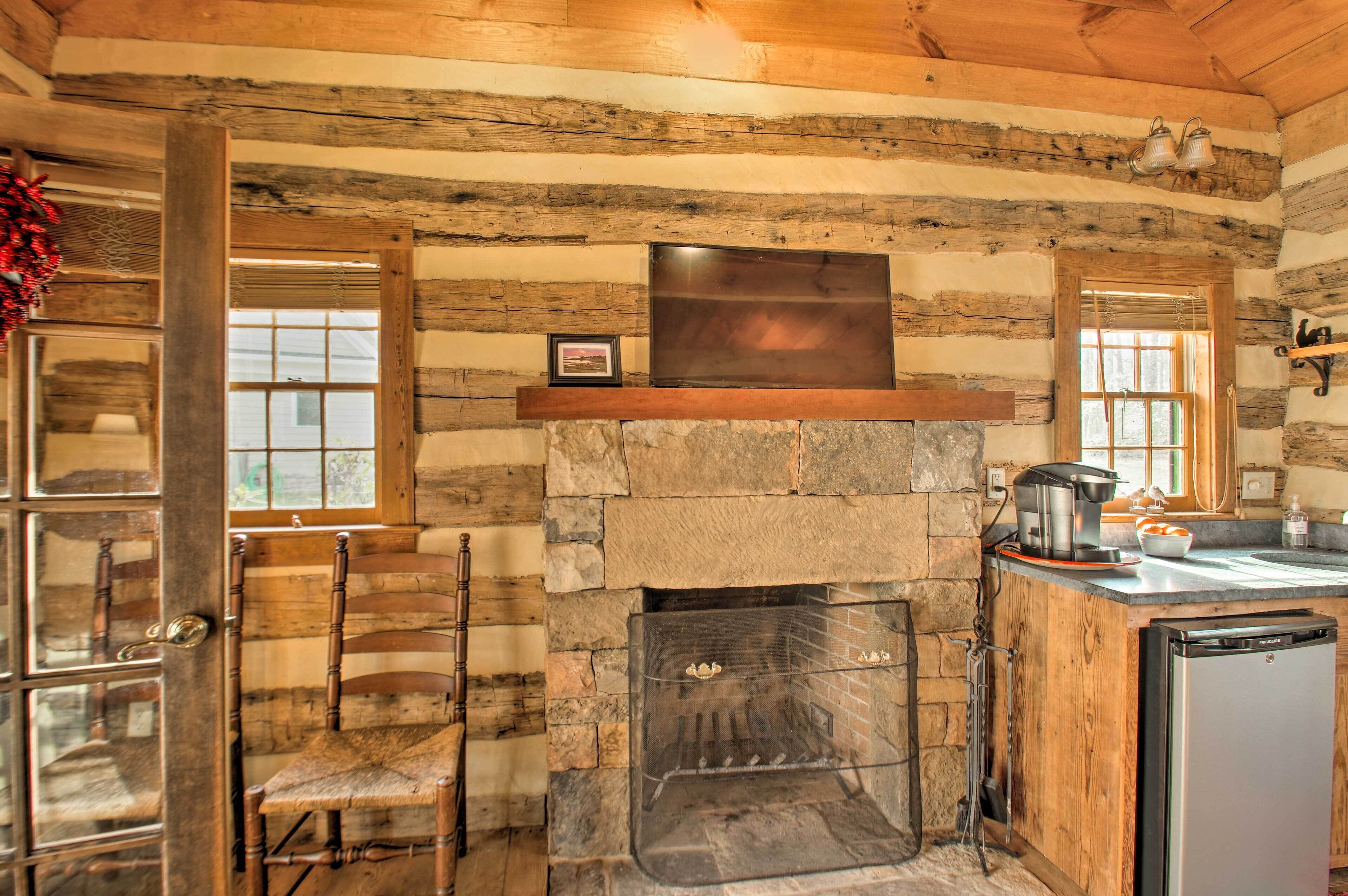 INDOOR LIVING: Smart TV w/ cable, fireplace (Duraflame logs provided, available Nov - Feb), ceiling fan