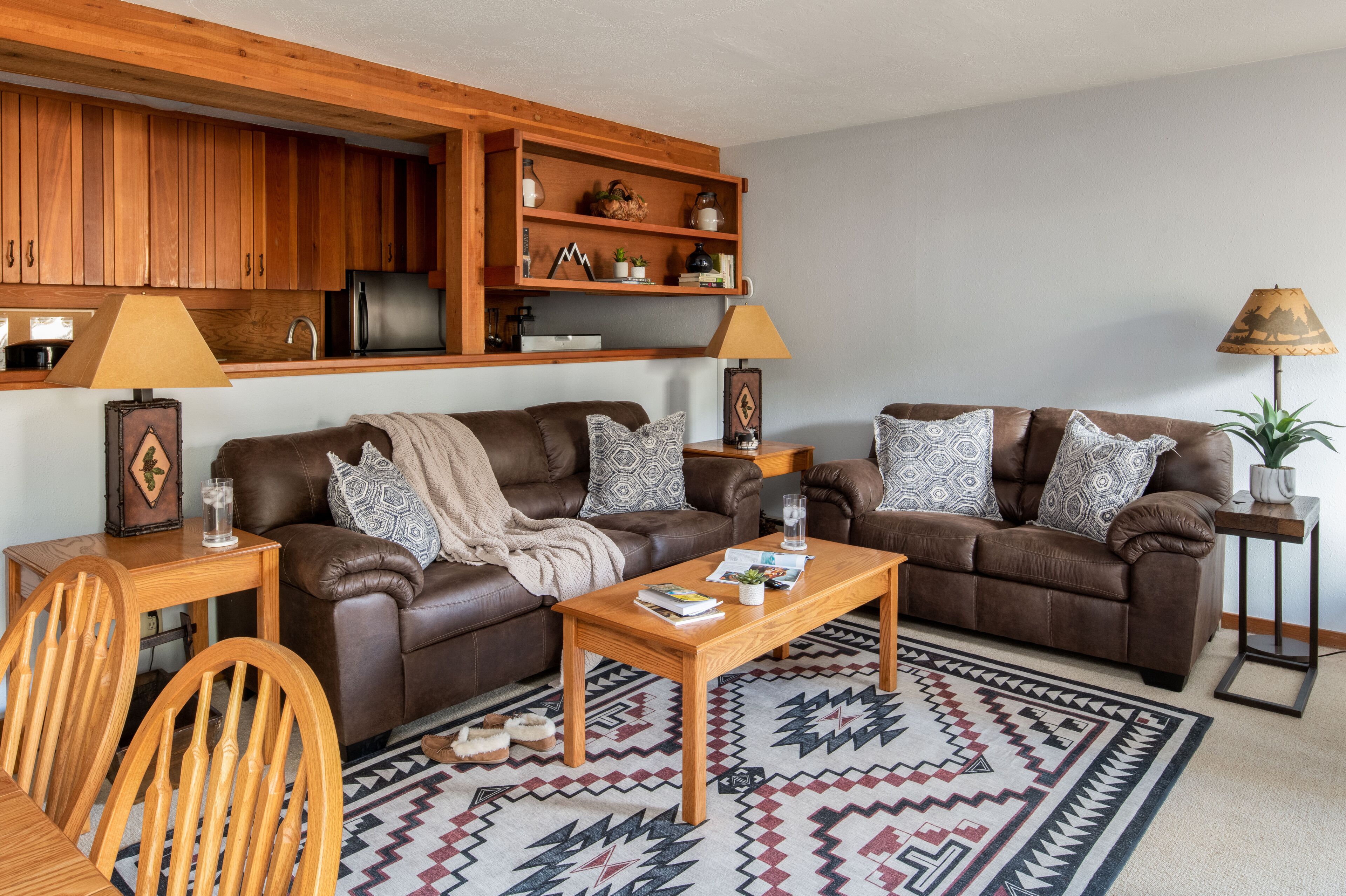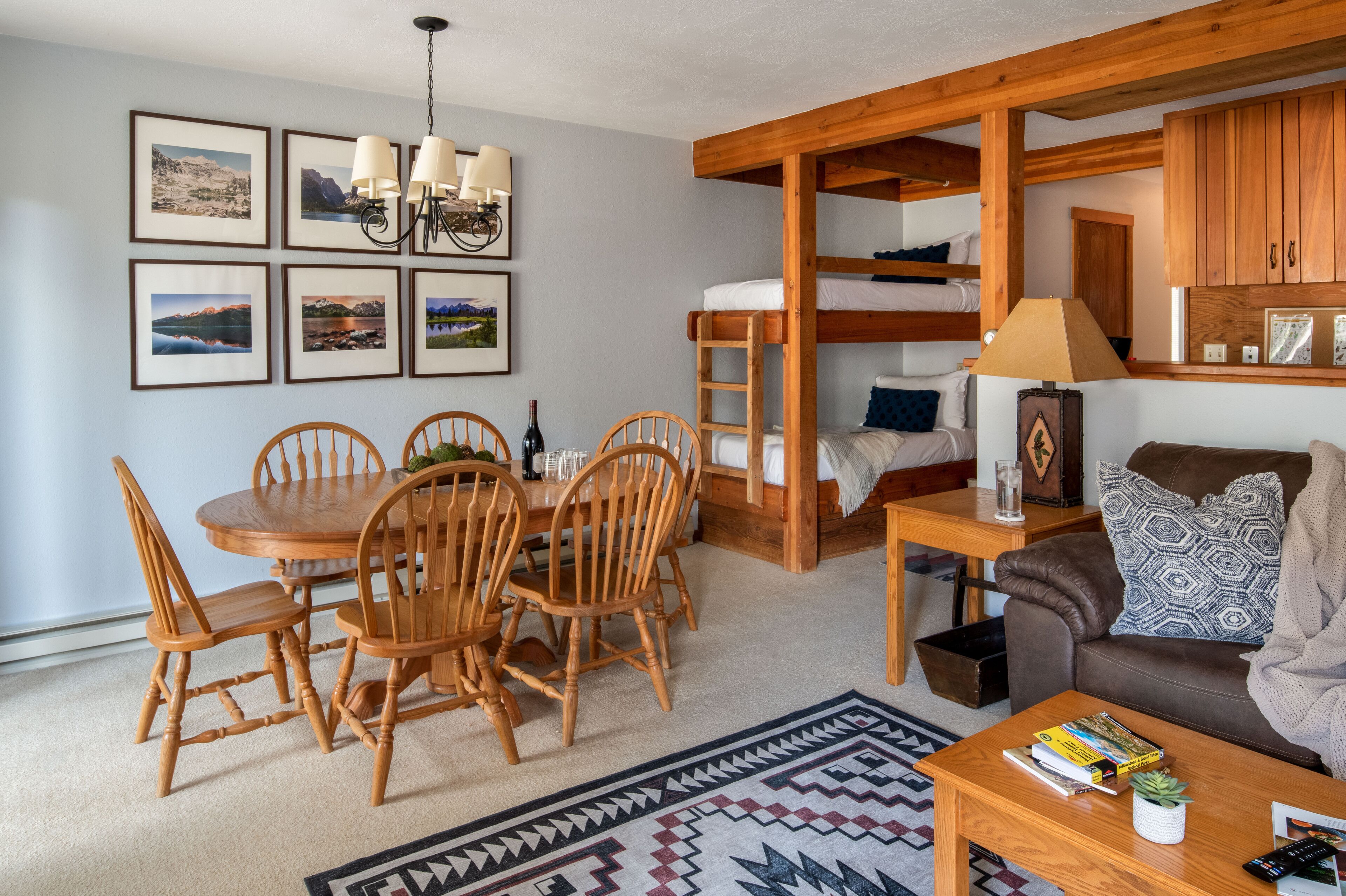 This cozy one-bedroom condo is tucked away in the charming Westbank area, located between the town of Jackson and Teton Village and within walking distance of restaurants and shops. This unit features multiple sleeping options with twin bunk beds and a sleeper sofa in the living room, accommodating for additional guests or children. With the option to enjoy the beautiful mountain views from the back patio or curled up by the fireplace, Thimbleberry 3212 is the perfect outpost for your mountain retreat.