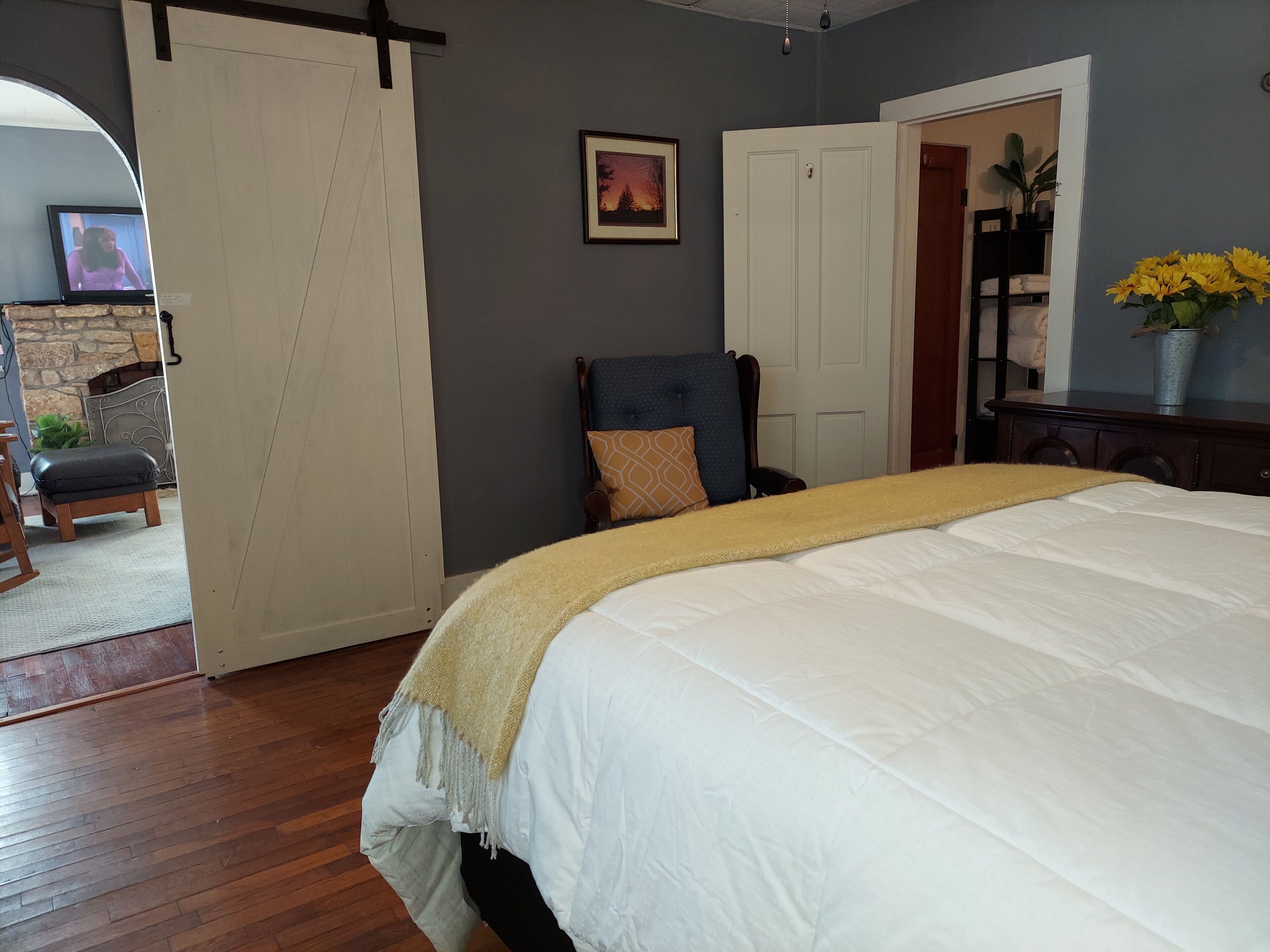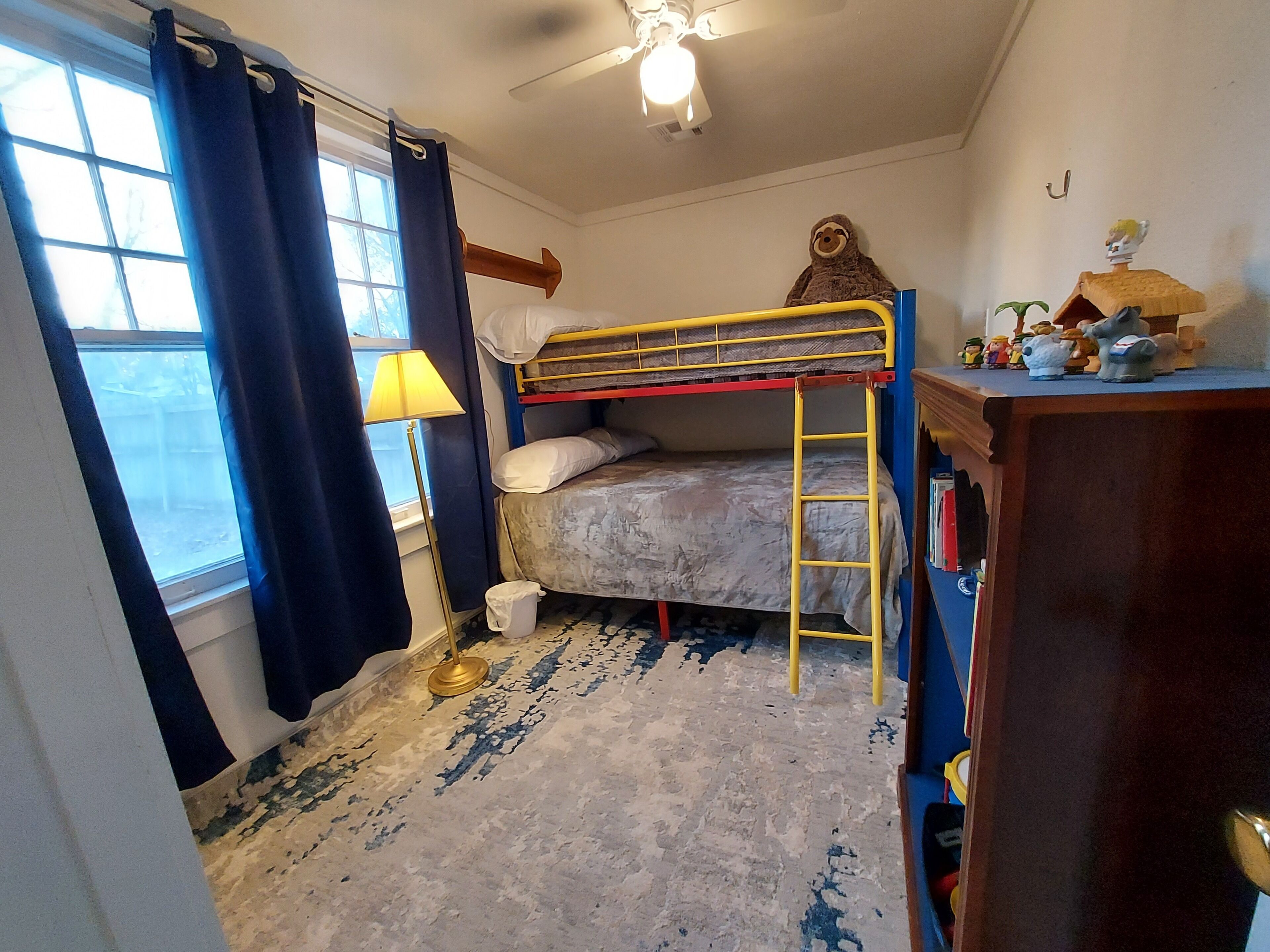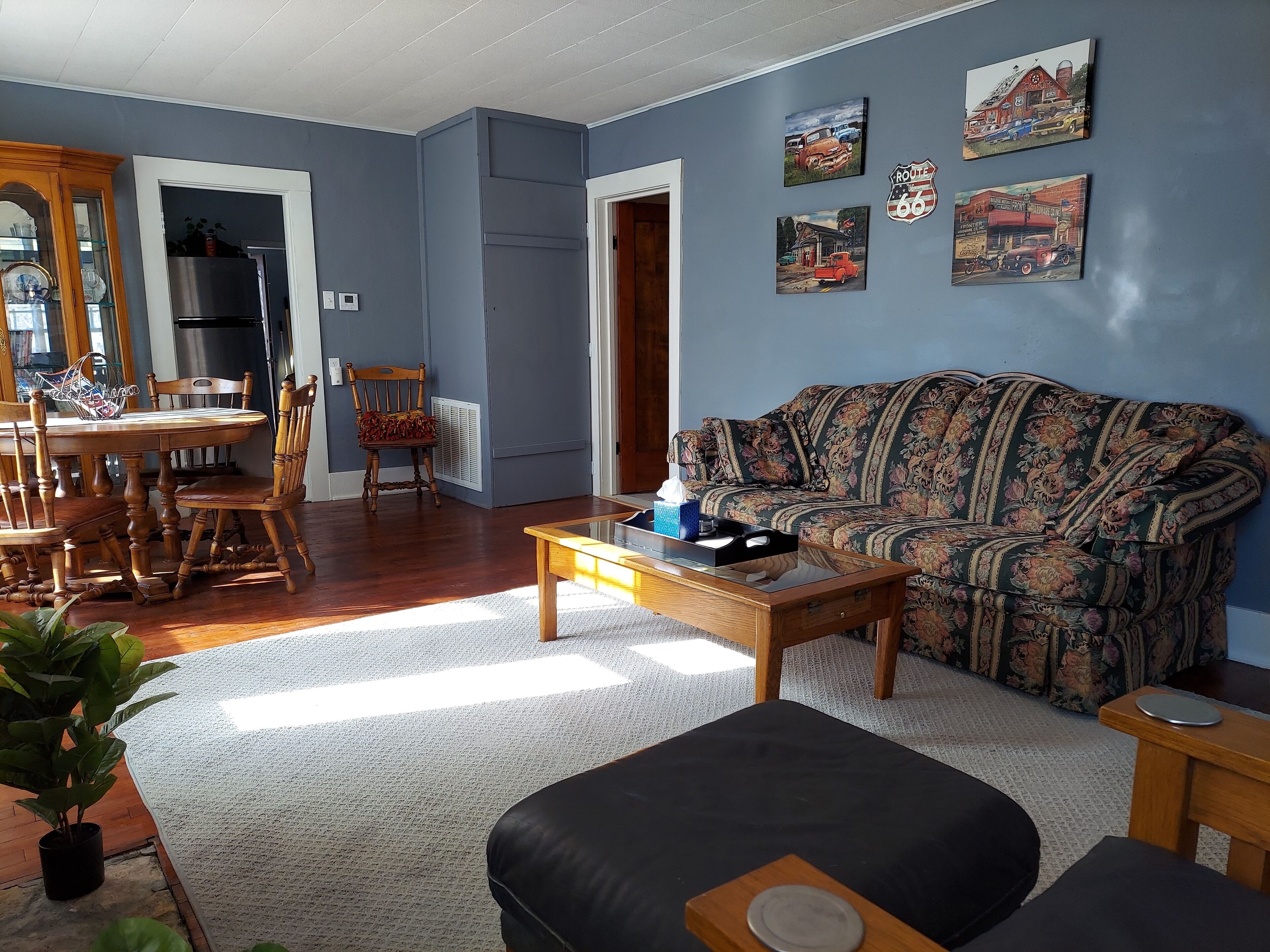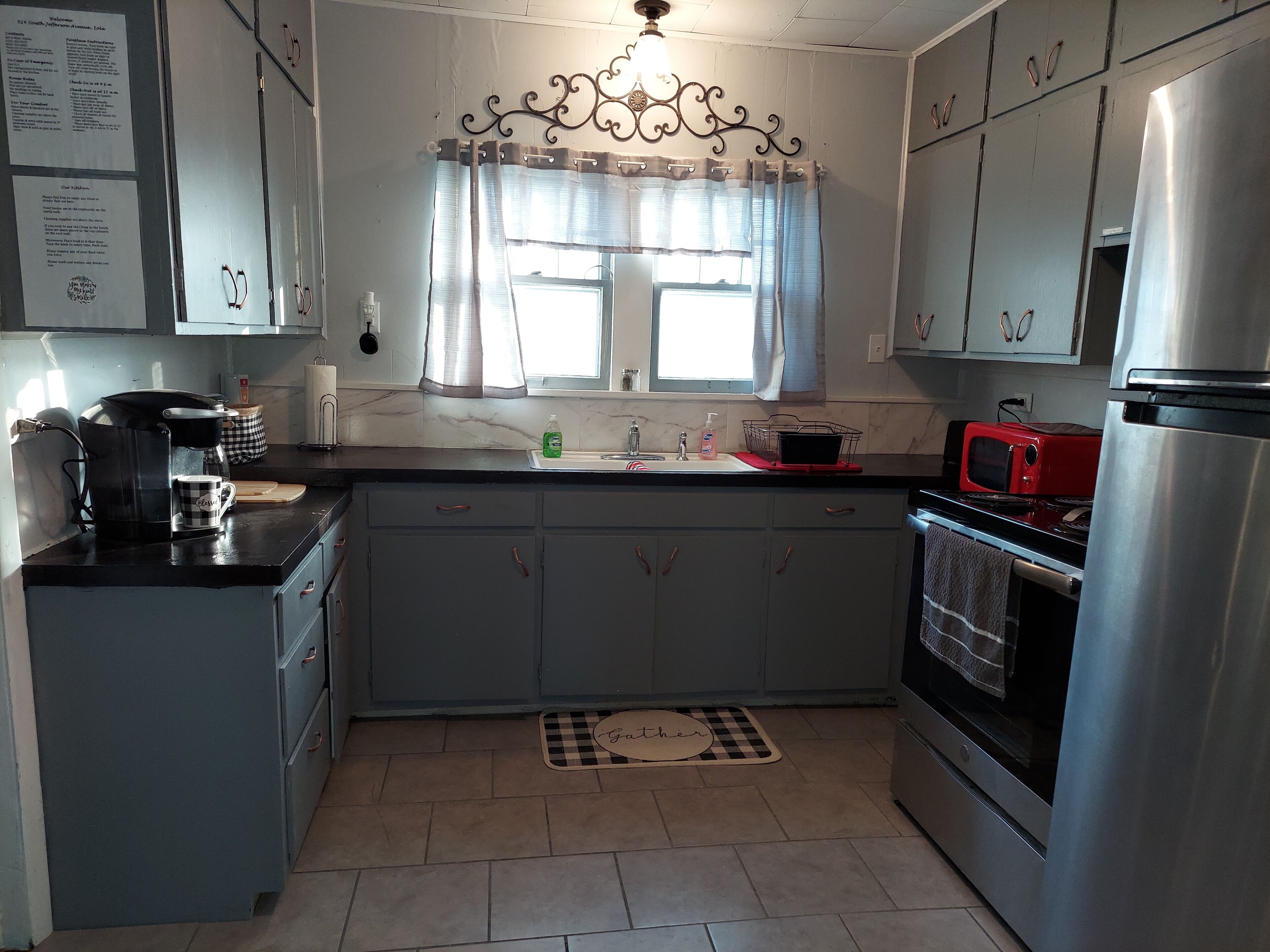 Relax with the family in our 100-year-old bungalow. We offer 3 bedrooms, sleeping 6. The interior is newly remodeled, including new central heat and air. We are still sprucing up the outside. There is a private paved driveway for your convenience. You will enter the large living room, complete with hardwood floors and a limestone gas fireplace. There is a designated workspace featuring a rolltop desk. Two bedrooms include plush queen-size beds. The third bedroom has a twin over full bunk bed. We have provided a high chair and pack 'n play to make traveling with children easier. The kitchen is complete with stove, refrigerator, Keurig, microwave, and dishes needed to help you prepare home-cooked meals during your stay. Enjoy the quiet neighborhood while relaxing on the porch swing on the large cozy front porch. Our home is 3 blocks from the largest town square in the U.S. It is also a short bike ride from the Lehigh Portland Trails and the Prairie Spirit Trail State Park. Iola is the home of Allen Community College.